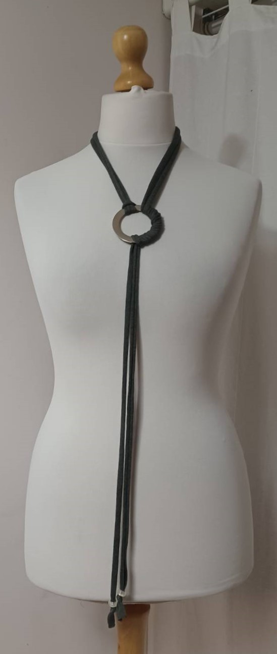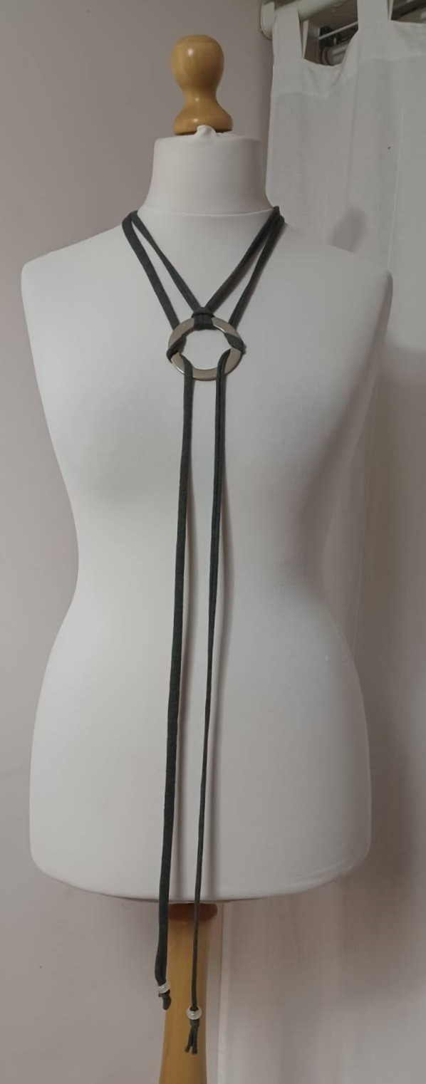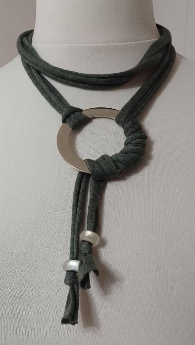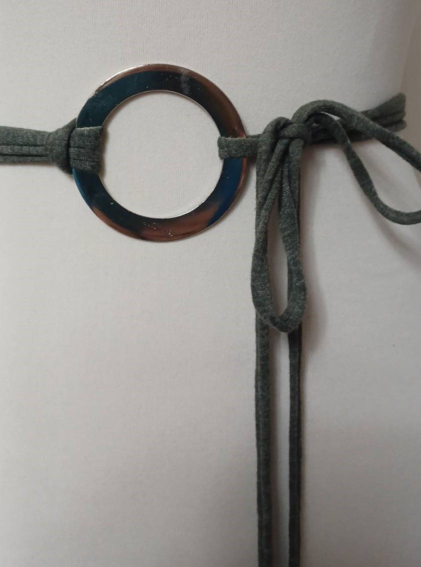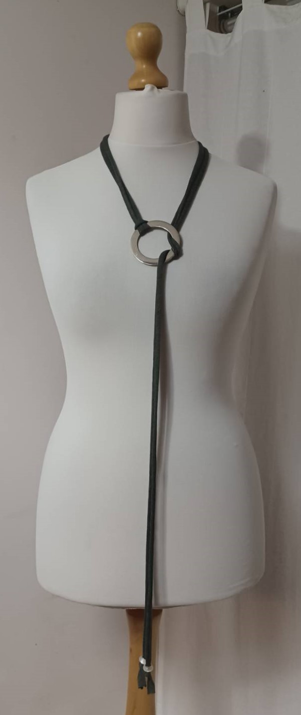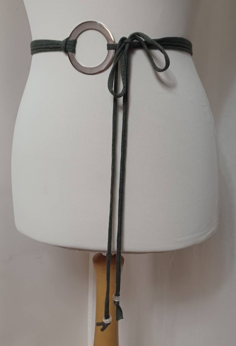 - Handmade, using khaki green, t-shirt yarn and a silver-coloured, metal ring