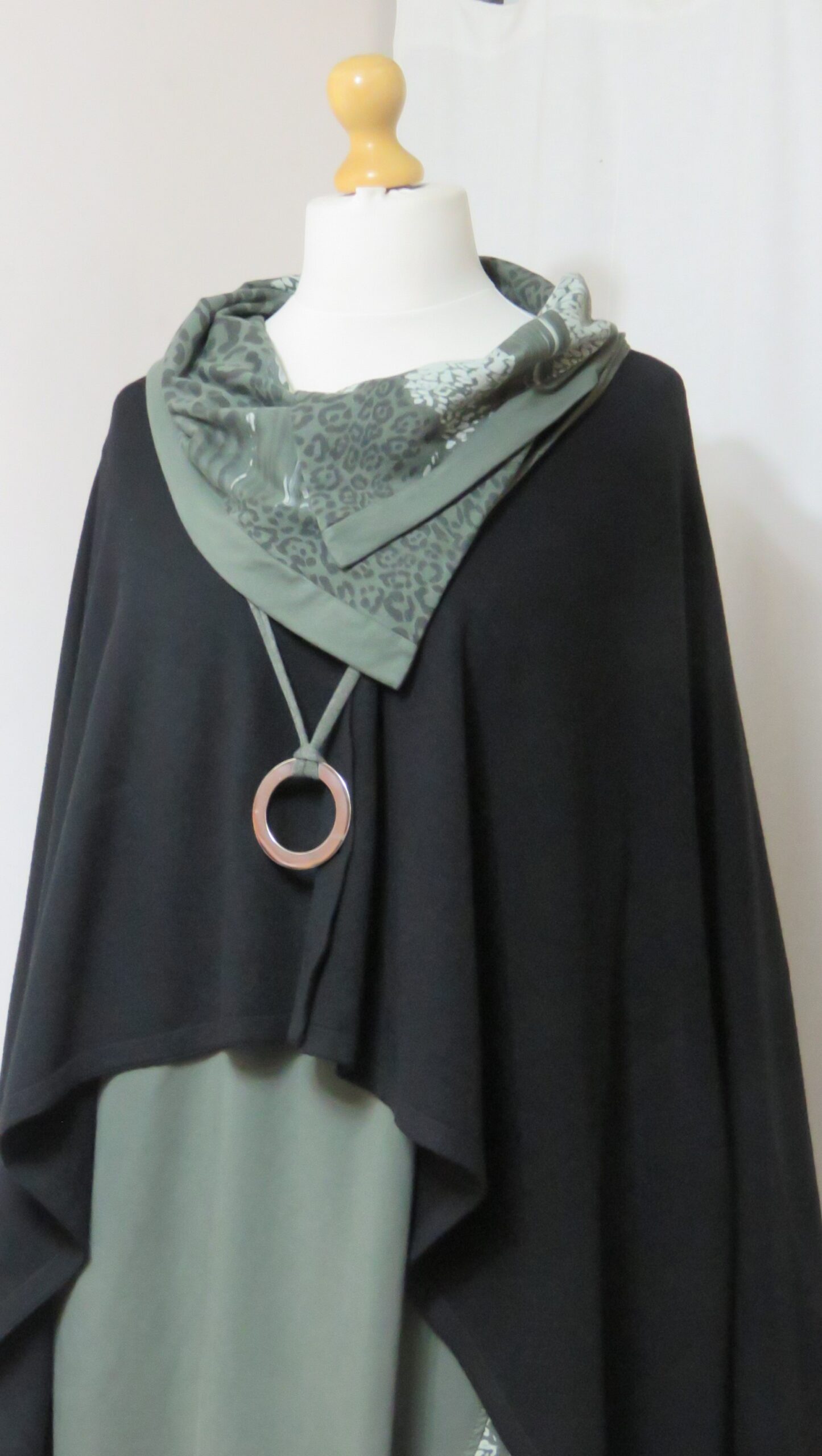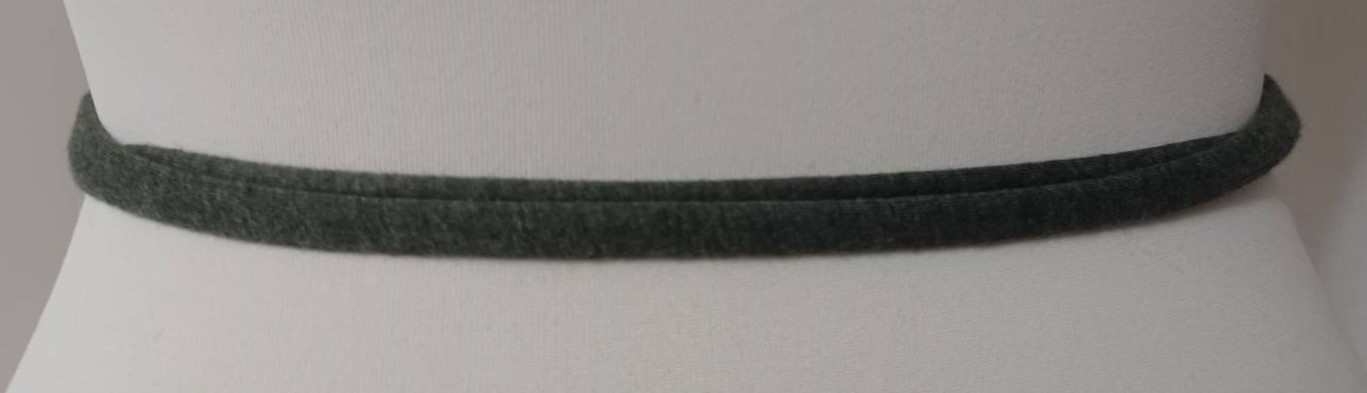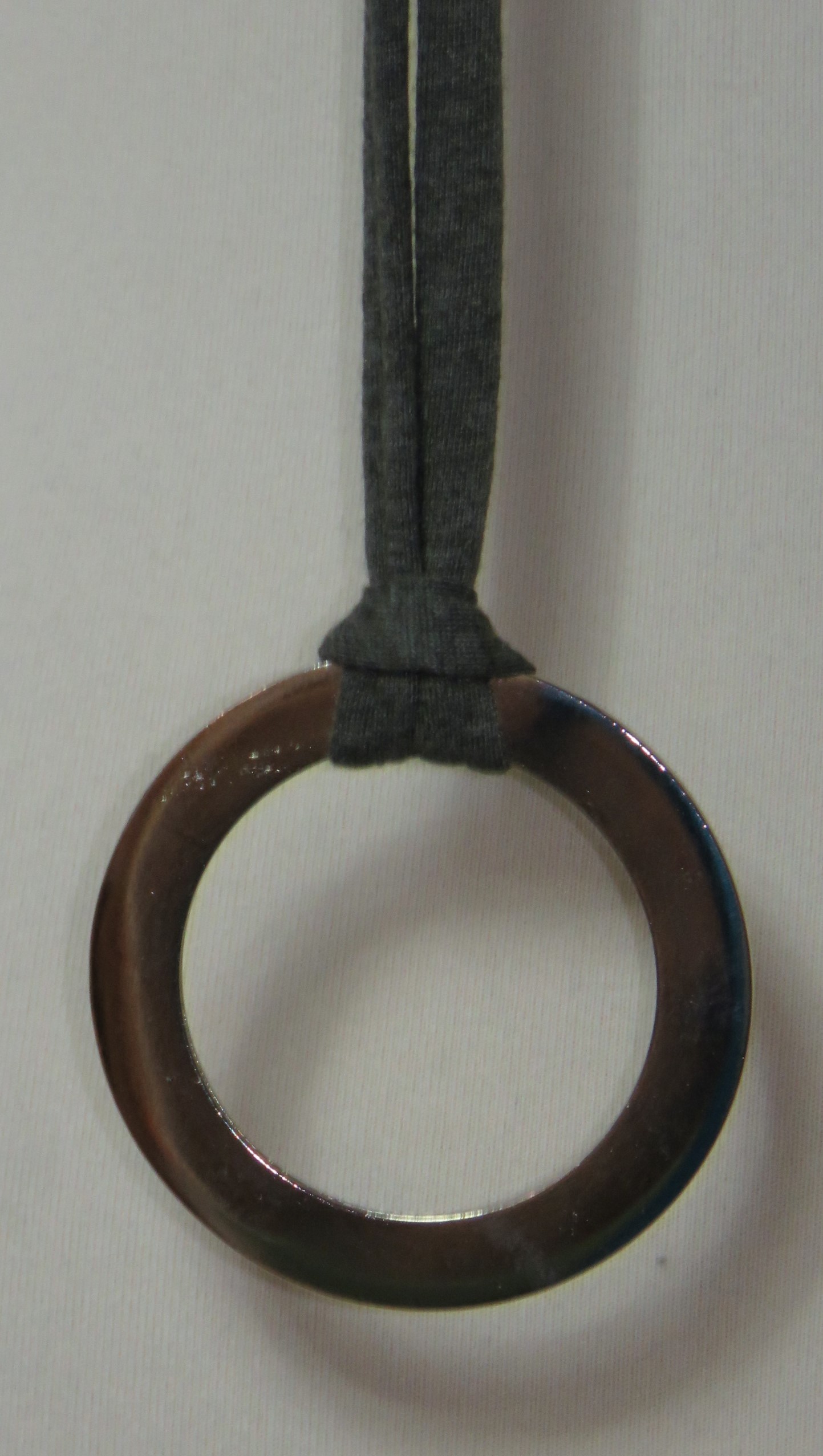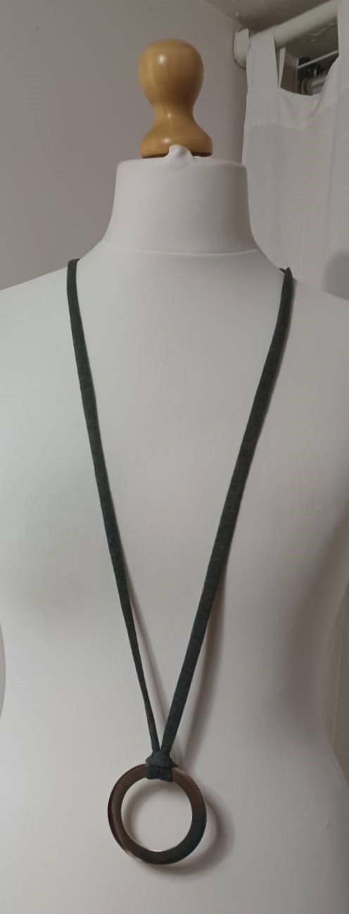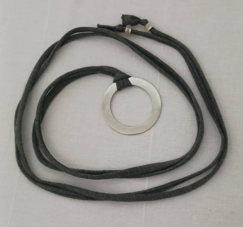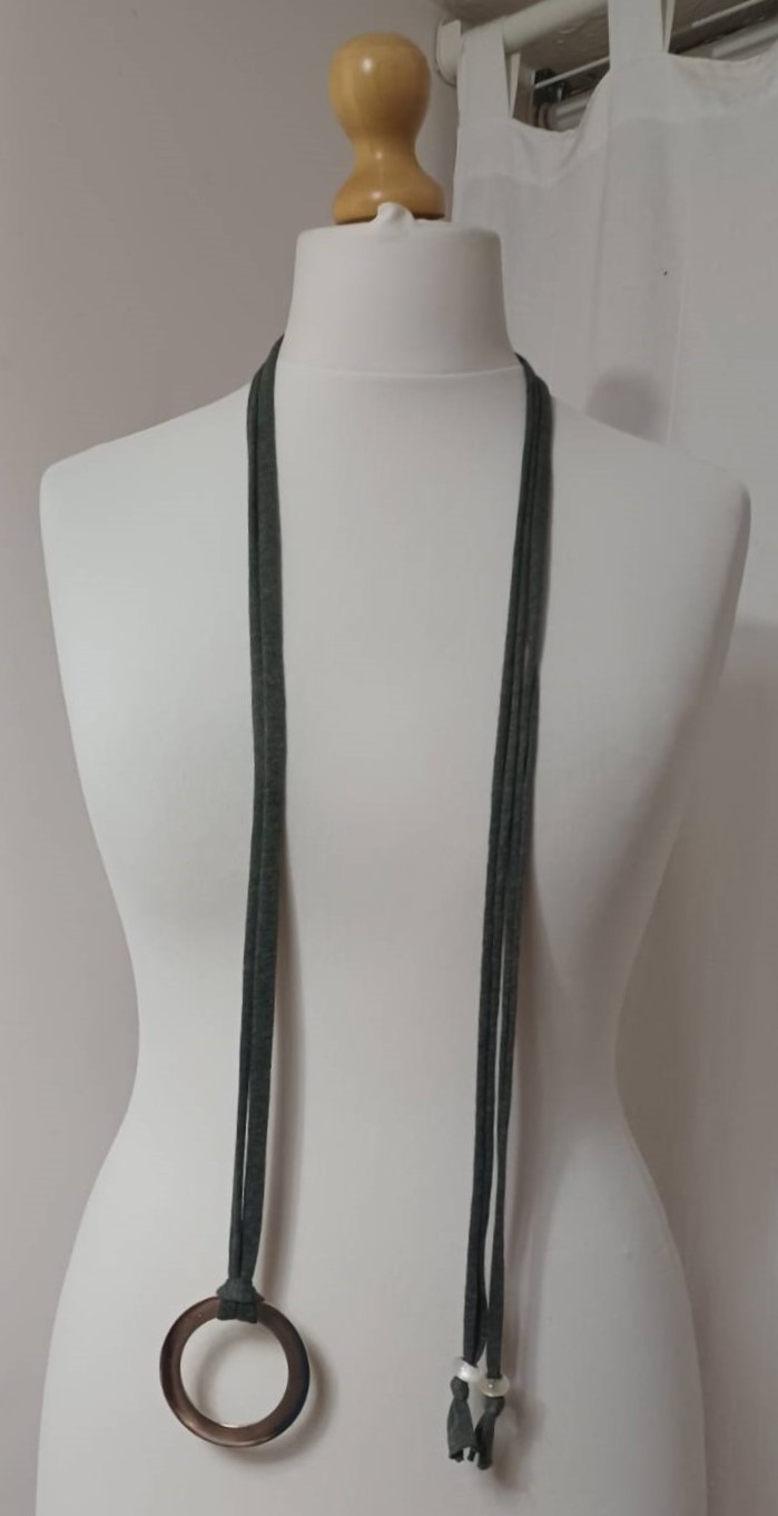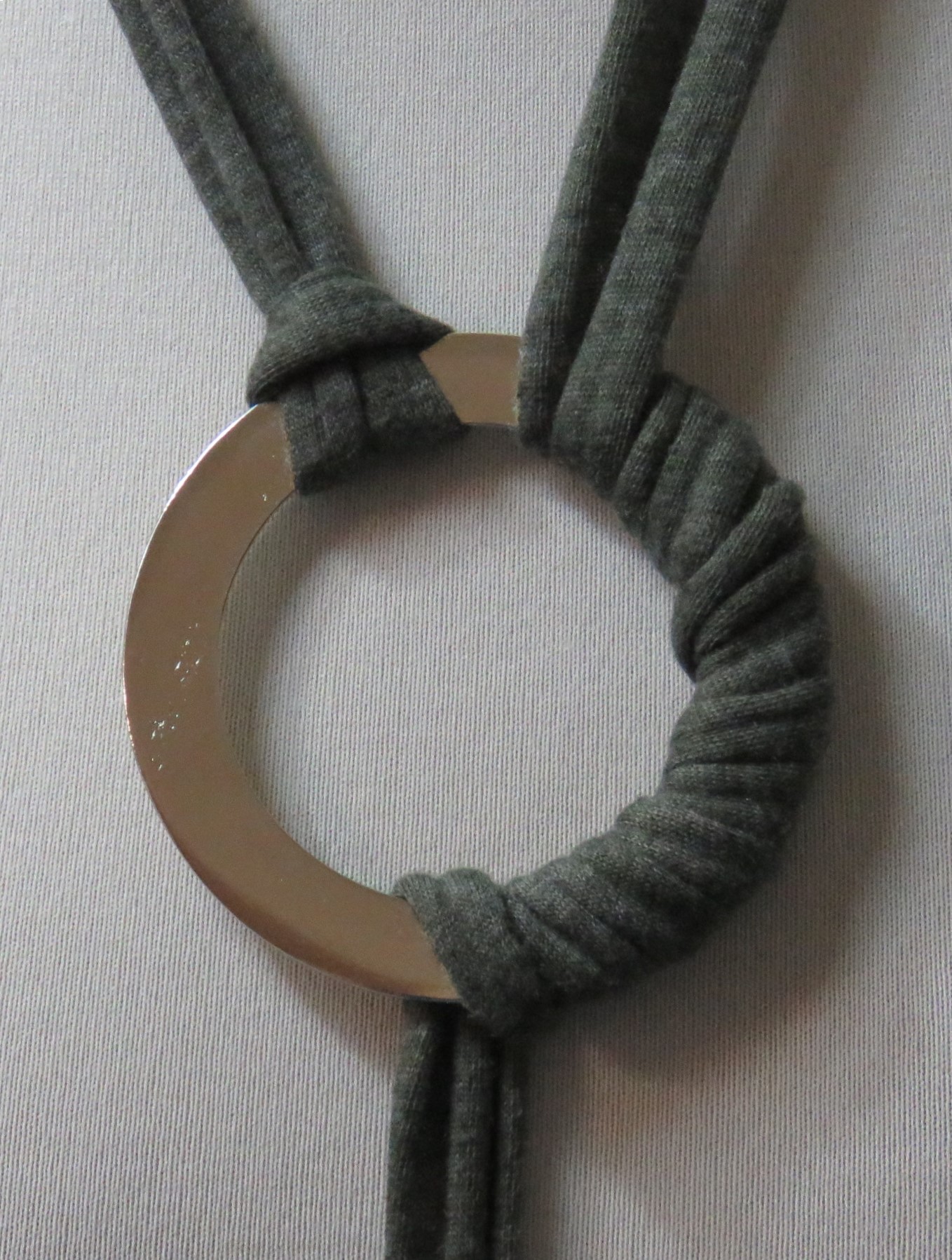 - Handmade, using khaki green, t-shirt yarn and a silver-coloured, metal ring