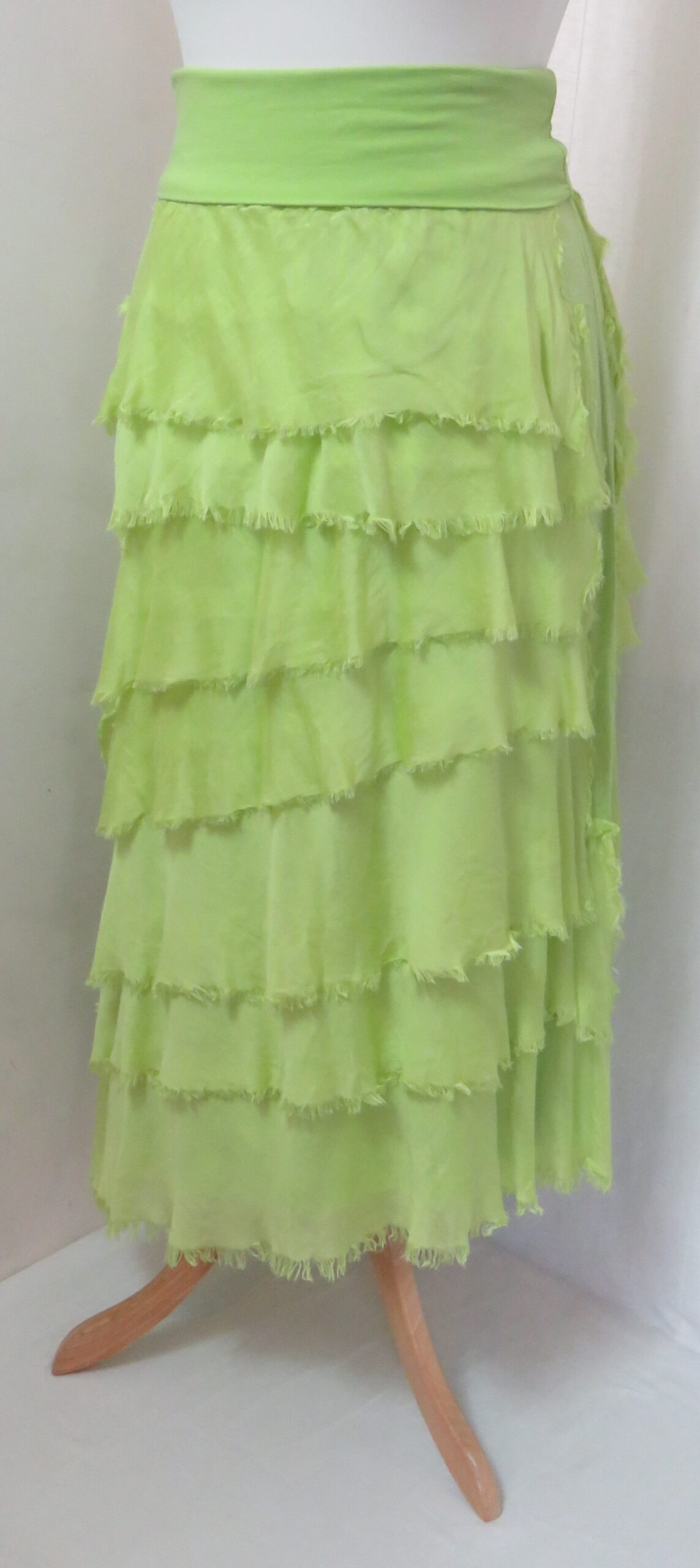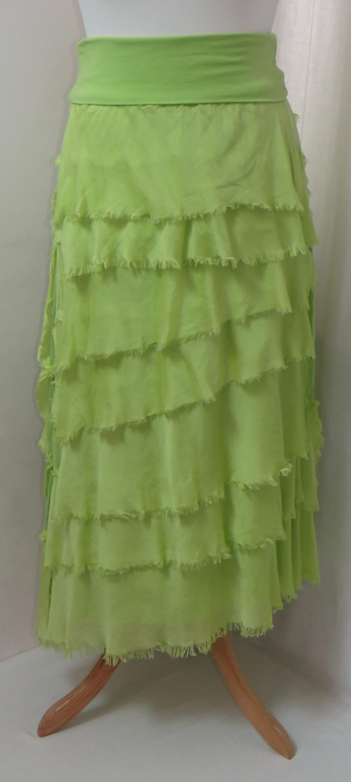 - Fine viscose jersey (95% viscose/5% elastane) with tiers of a silk-blend fabric sewn on asymmetrically back and front (40% cotton/30% viscose/30% silk) – these have a raw/frayed edge