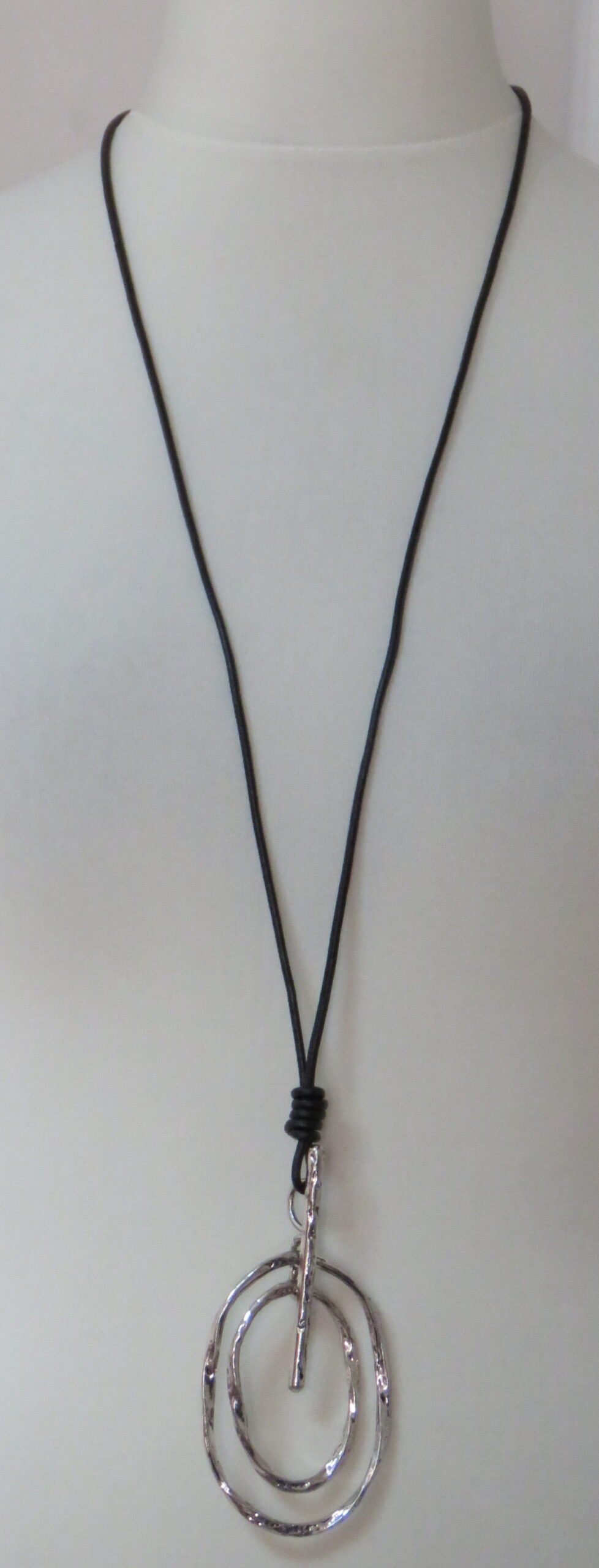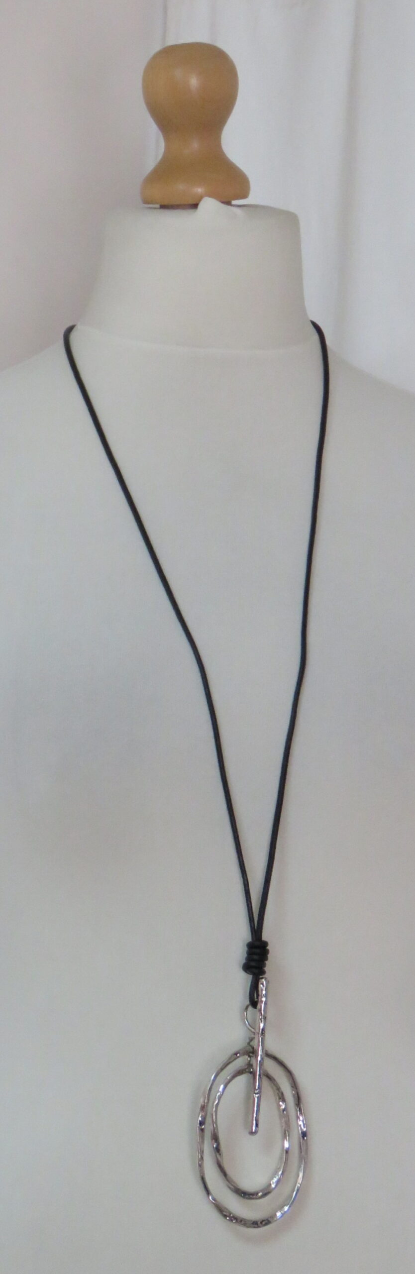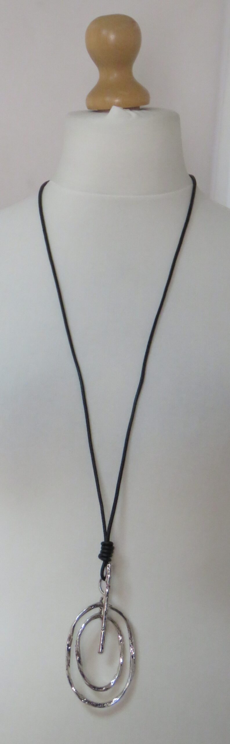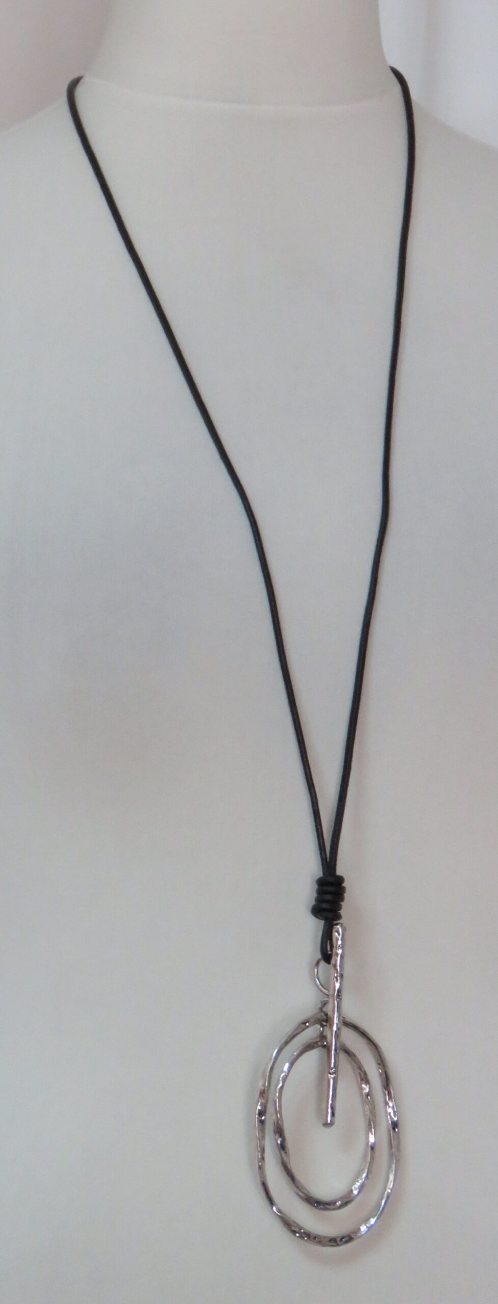 Long, black leather necklace, with antique silver-coloured pendant