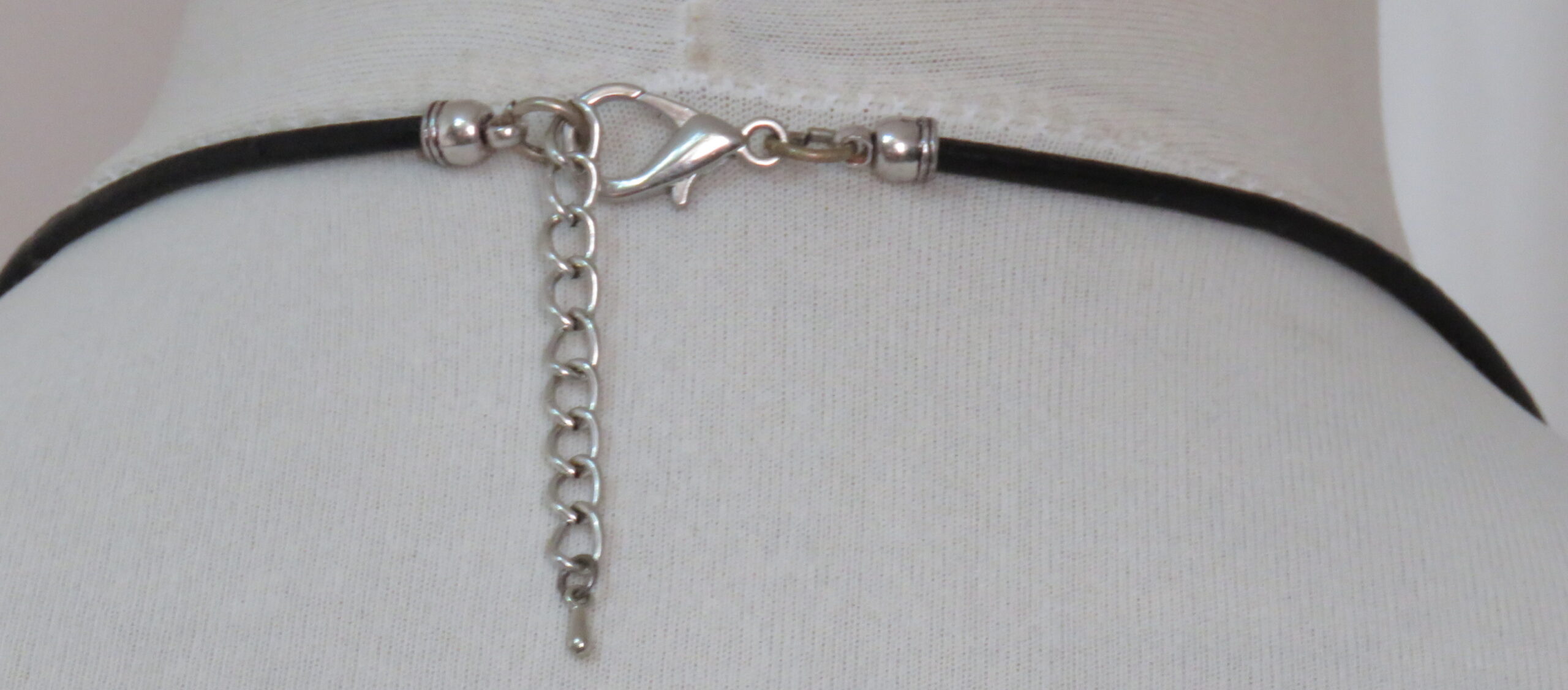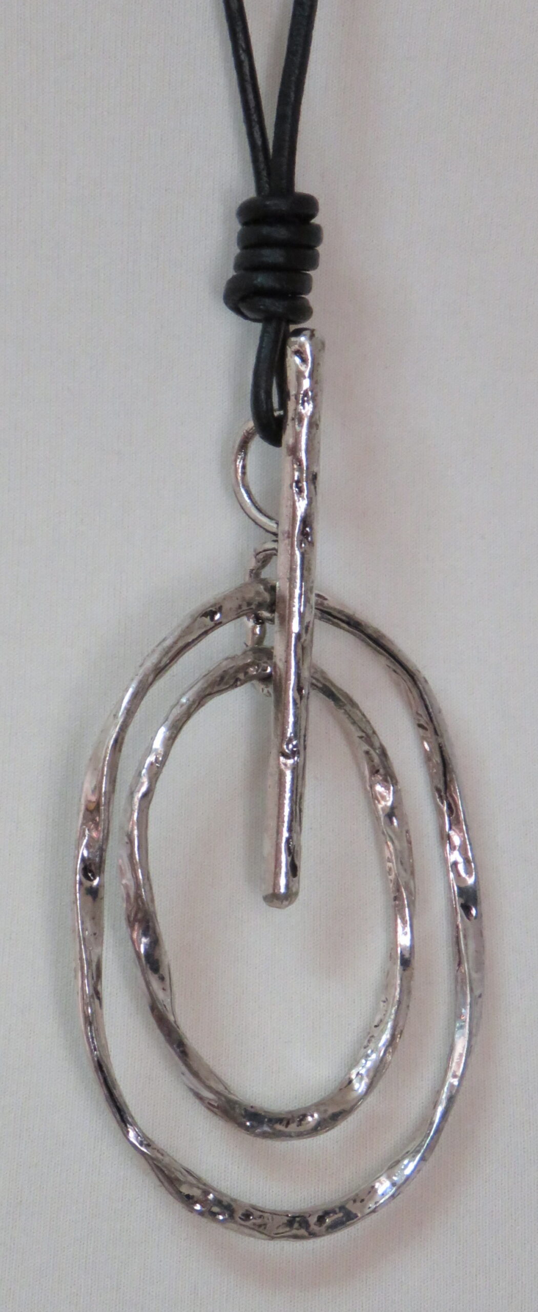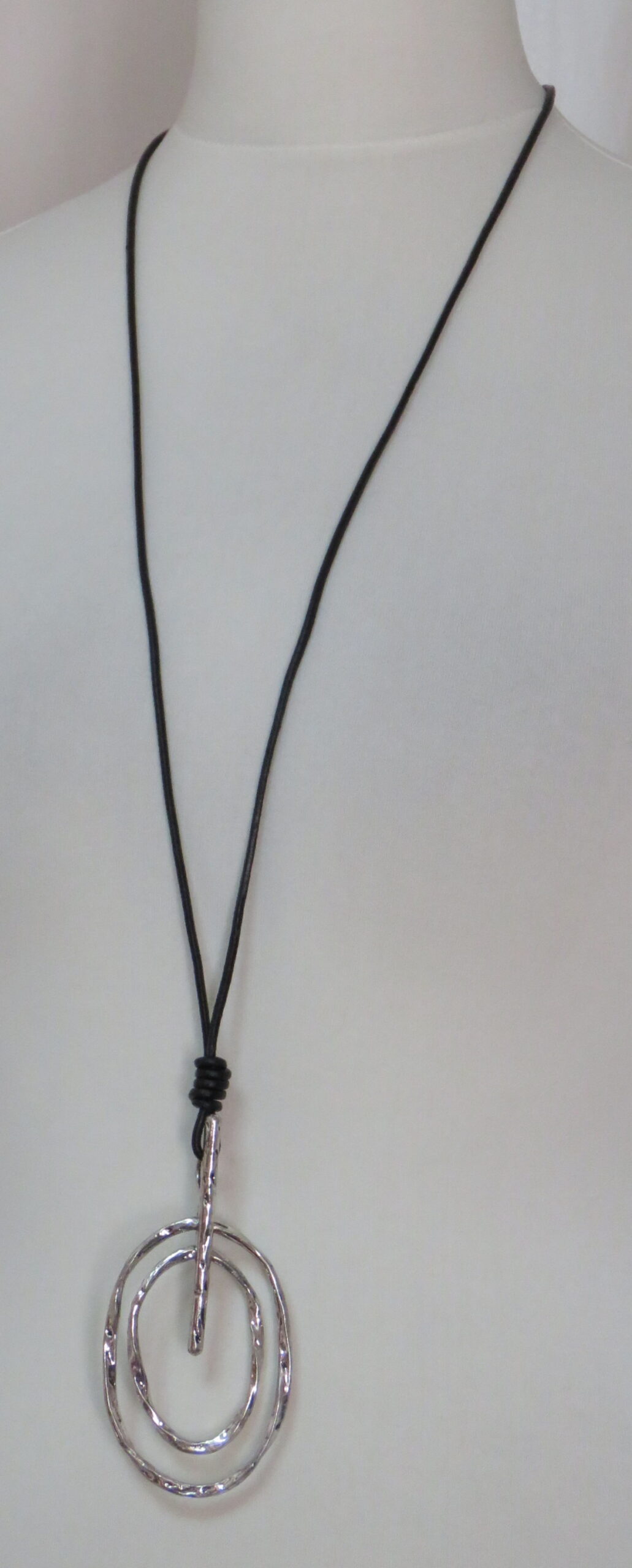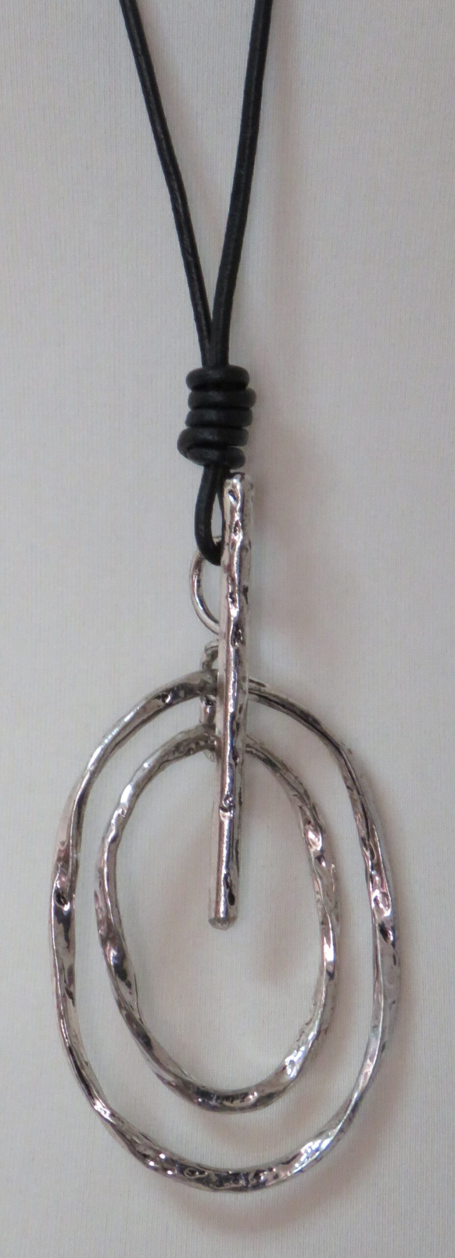 Long, black leather necklace, with antique silver-coloured pendant