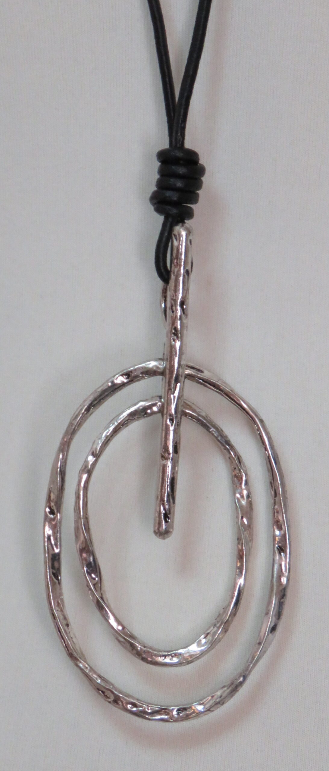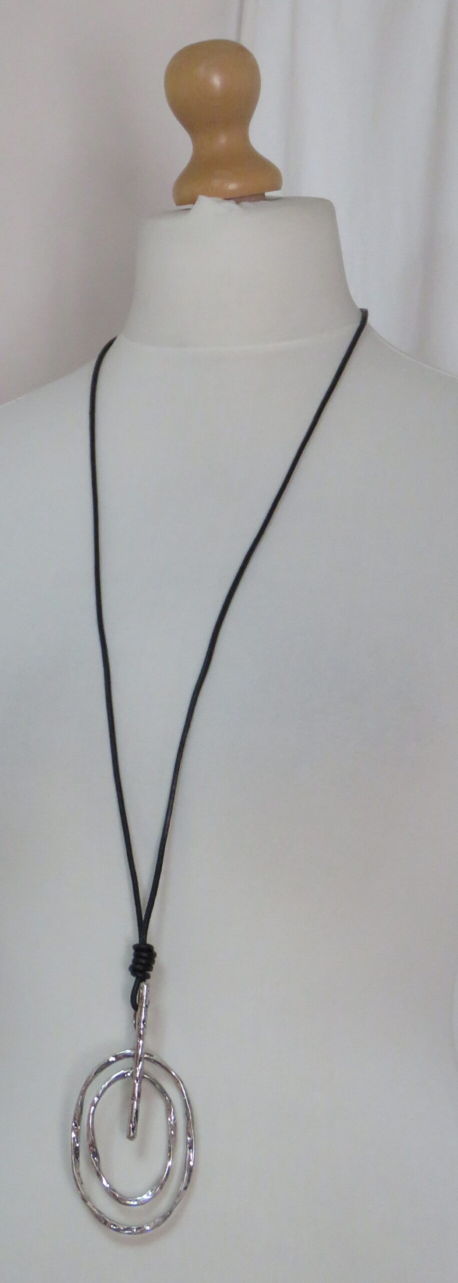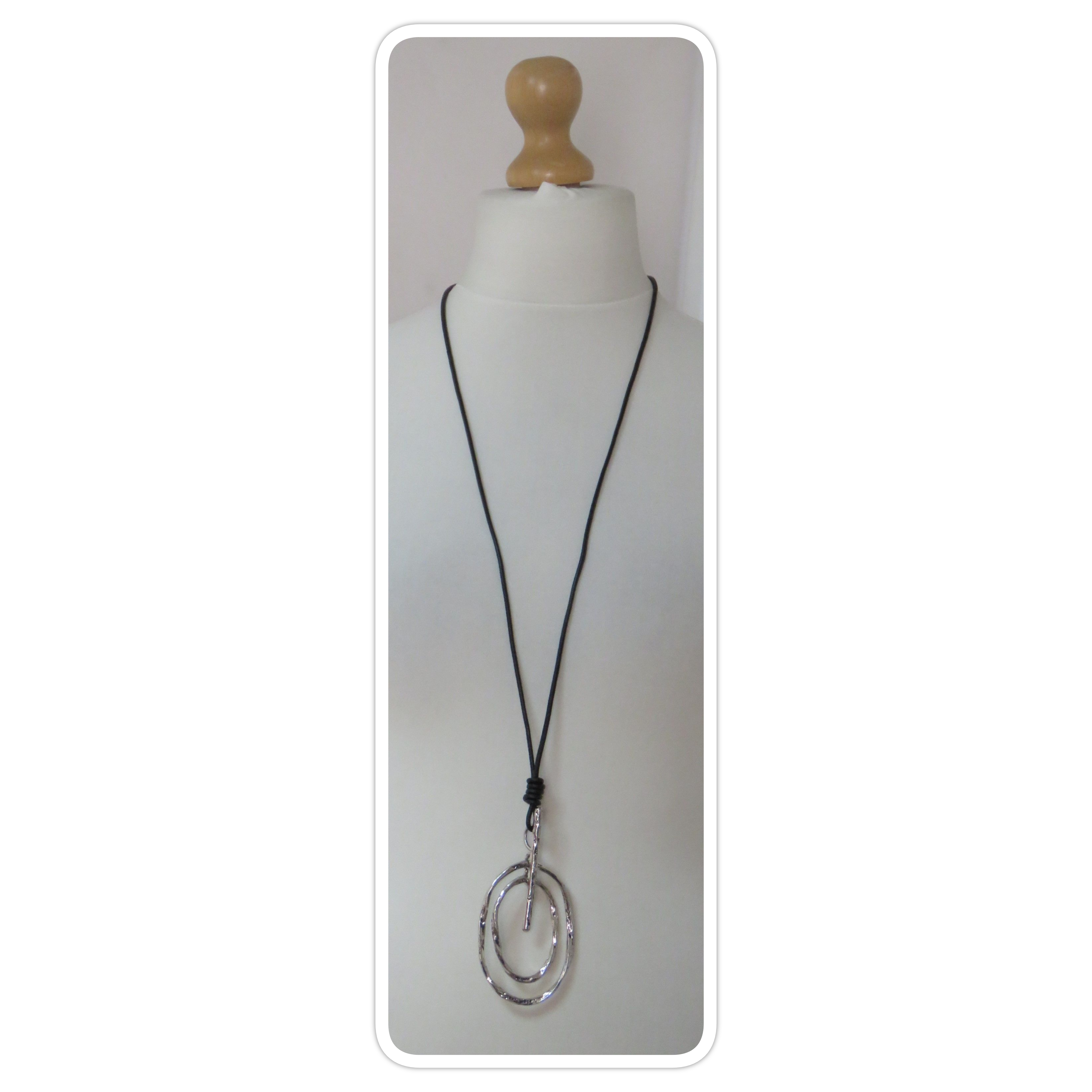 • Lovely, Lagenlook, statement necklace, featuring a long, black, leather cord and a fabulous, pendant, made of antique silver-coloured, metal ring