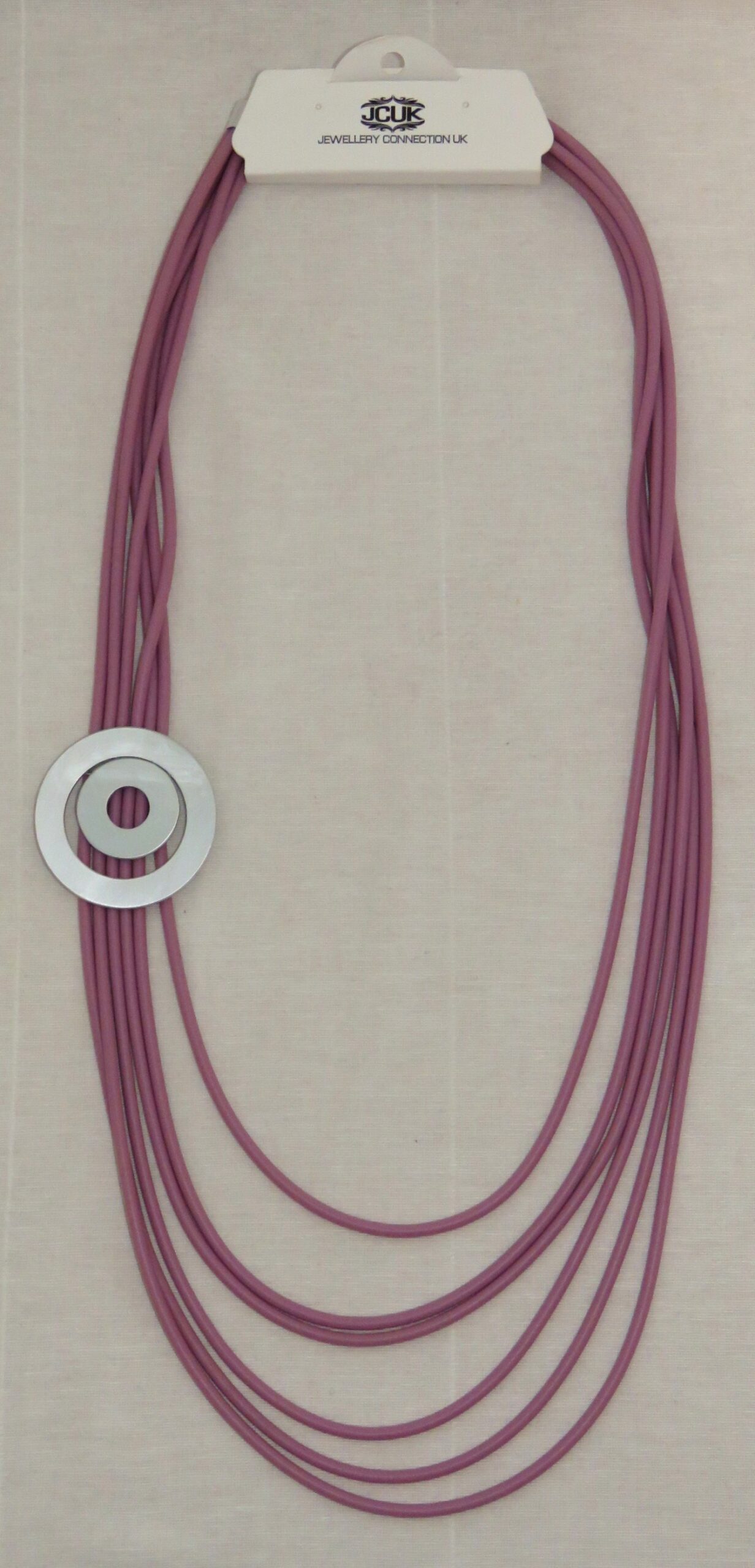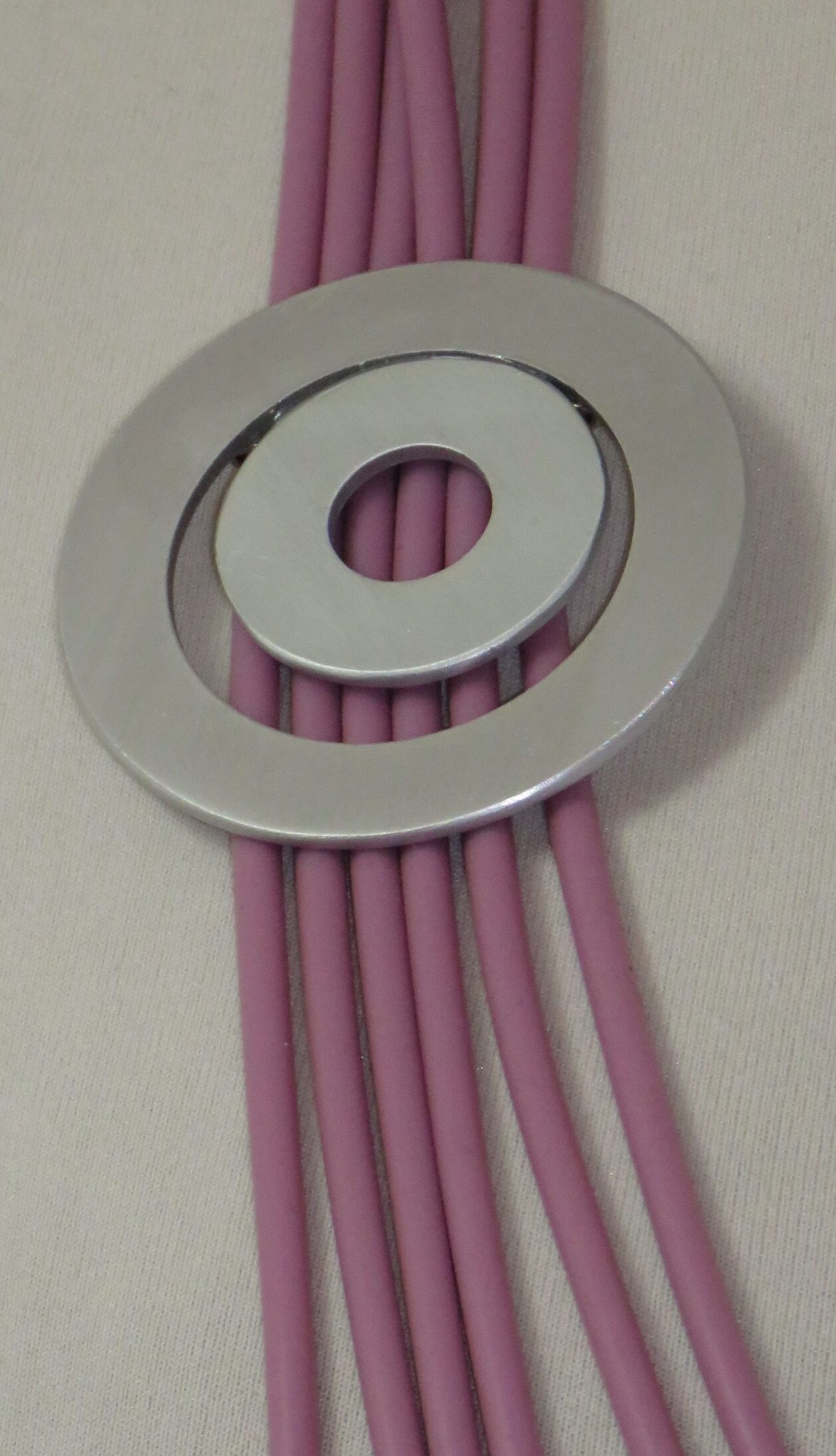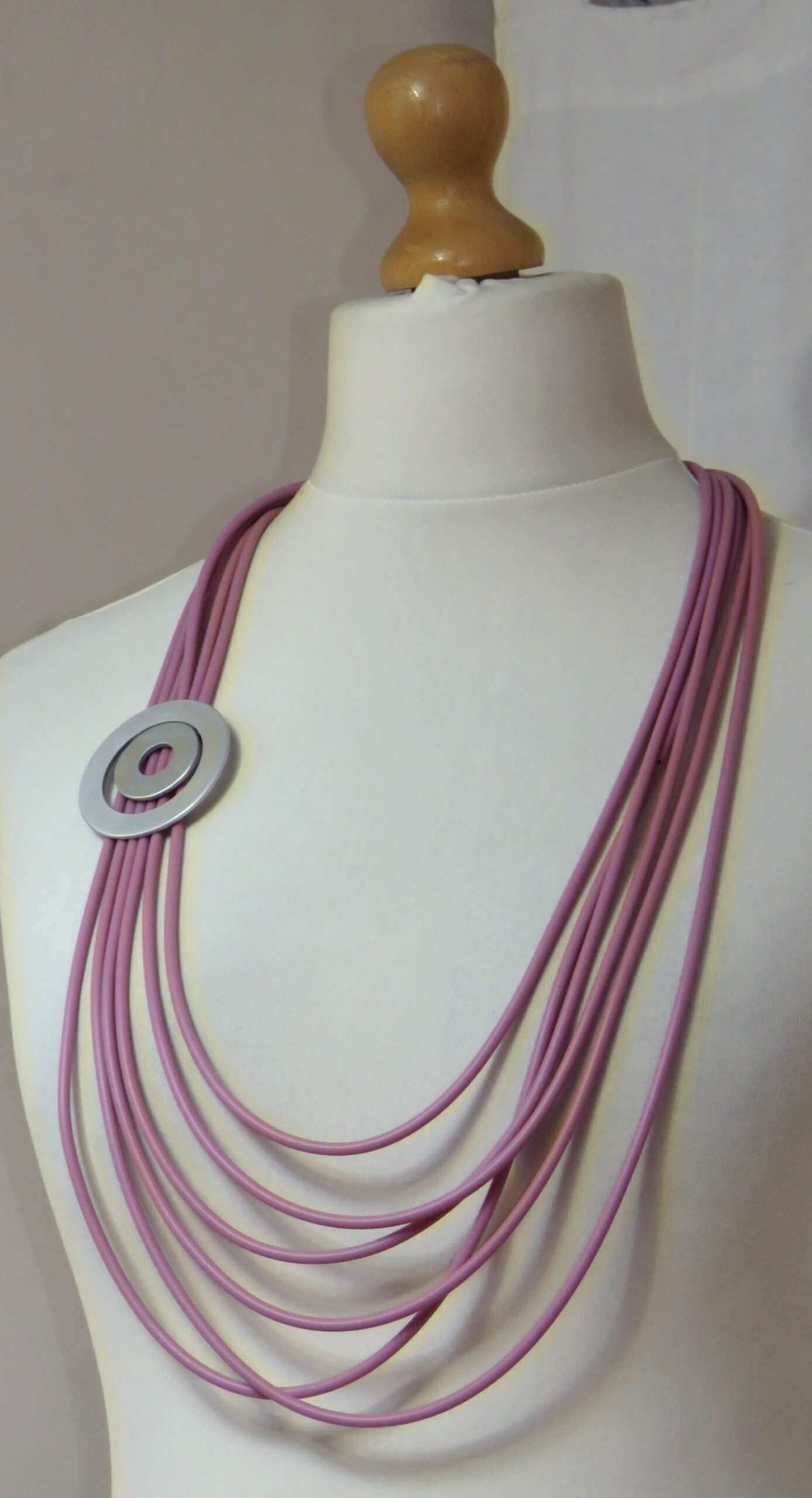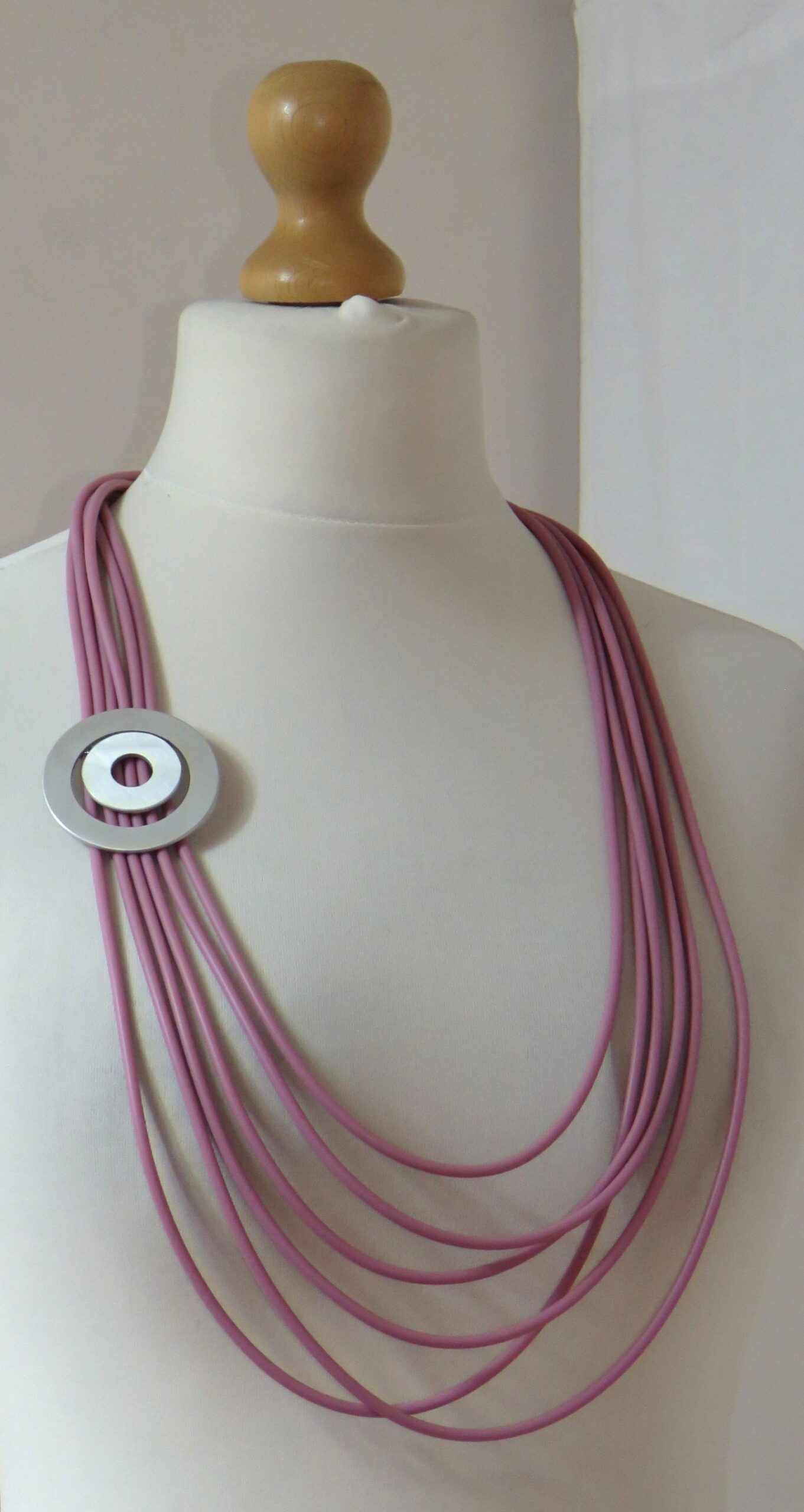 • Fabulous, Lagenlook statement necklace, made of multiple strands of mauve rubber held together with a silver-coloured metal disc