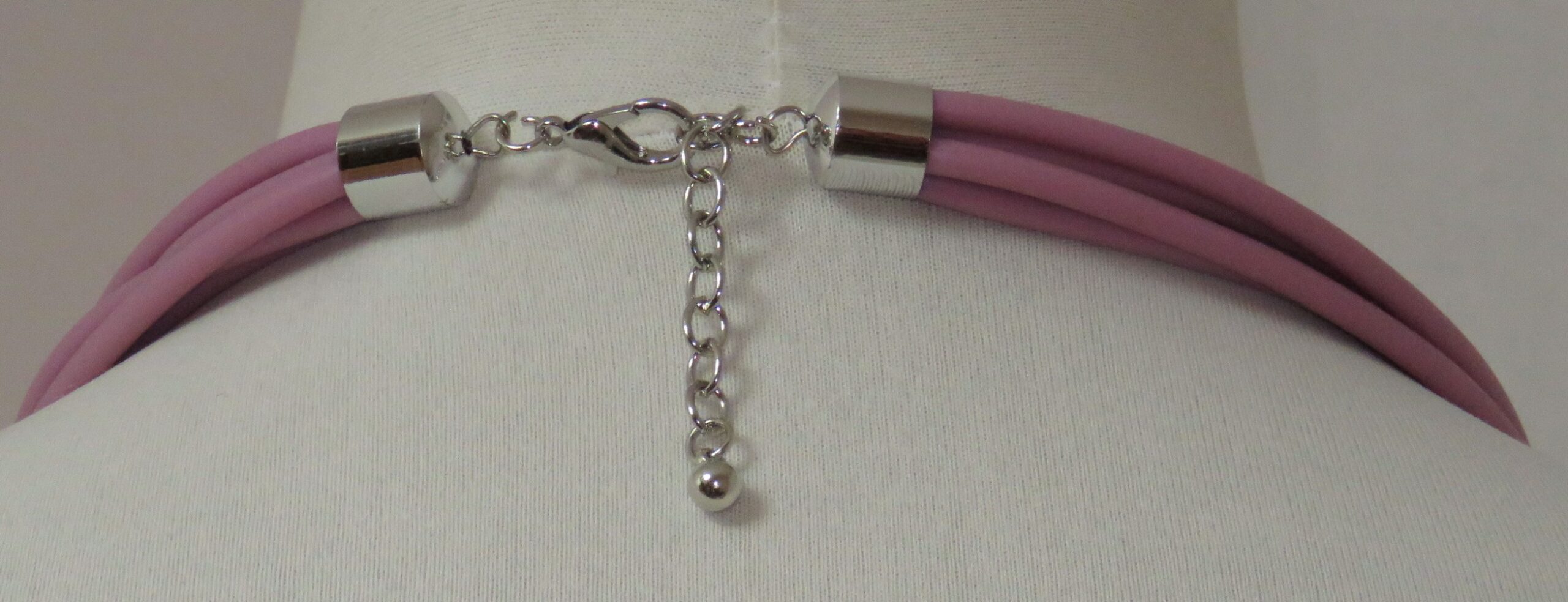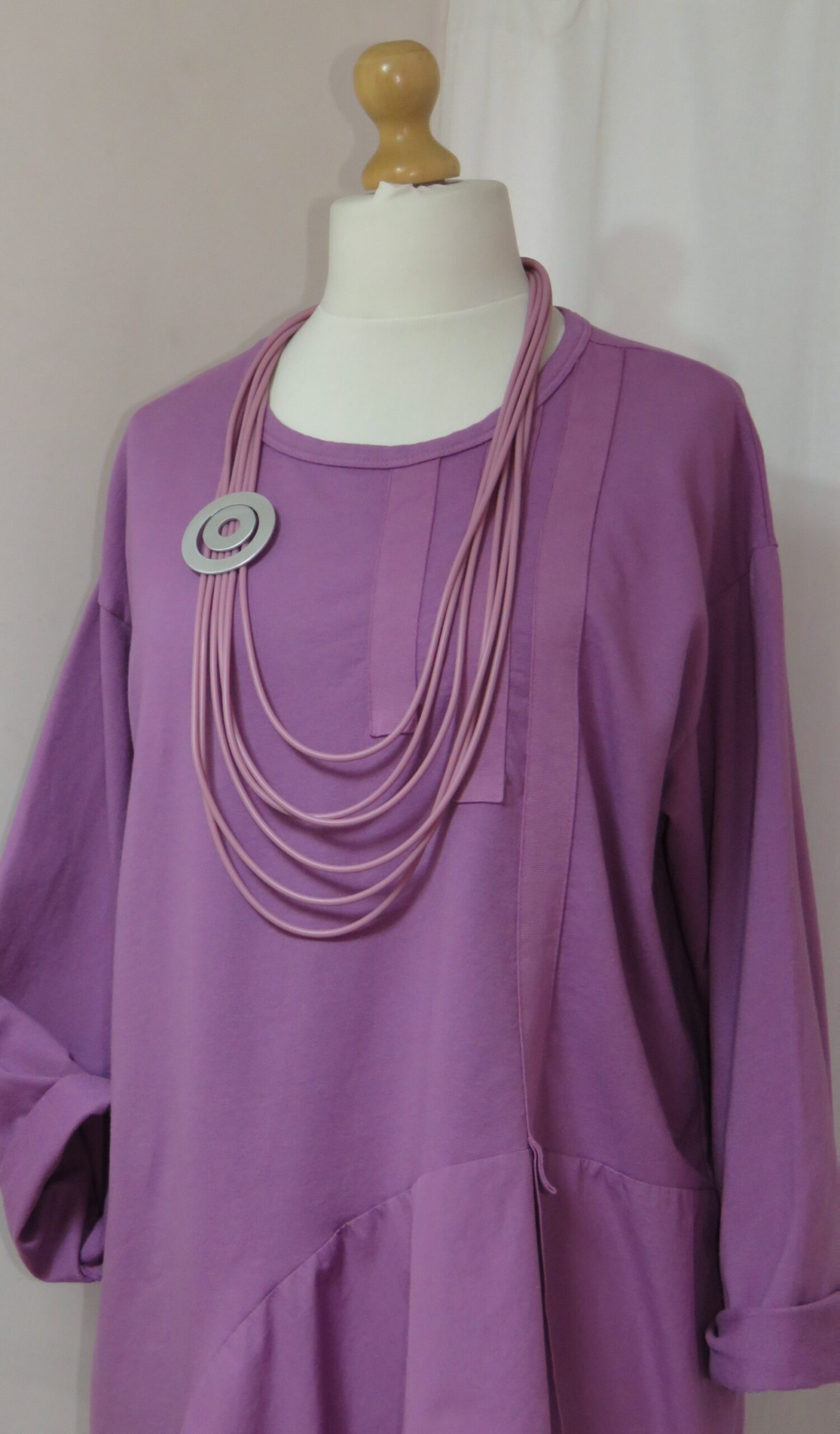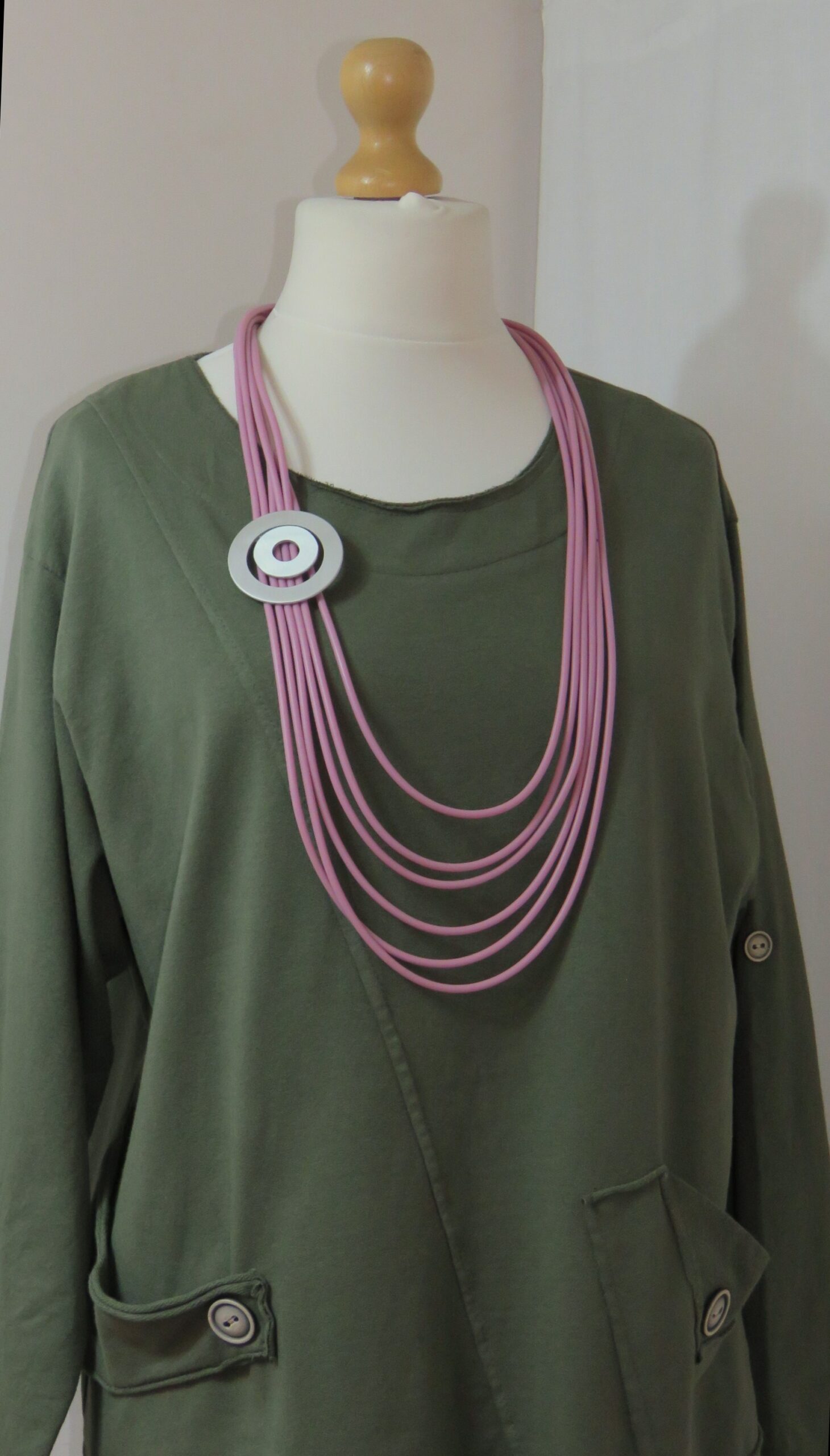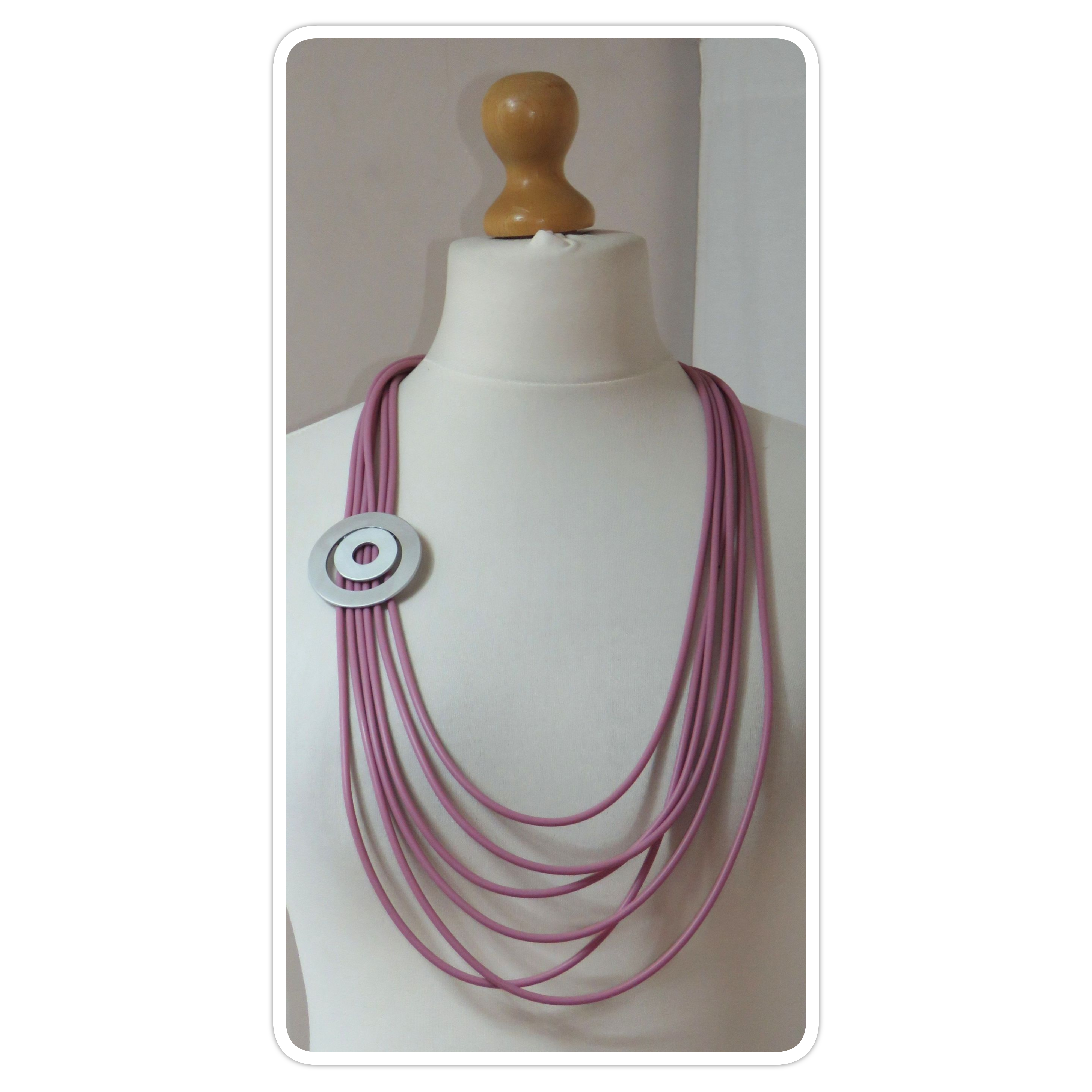 • Fabulous, Lagenlook statement necklace, made of multiple strands of mauve rubber held together with a silver-coloured metal disc