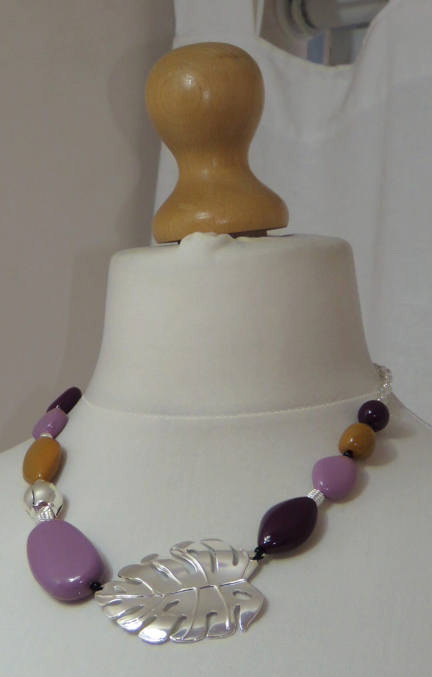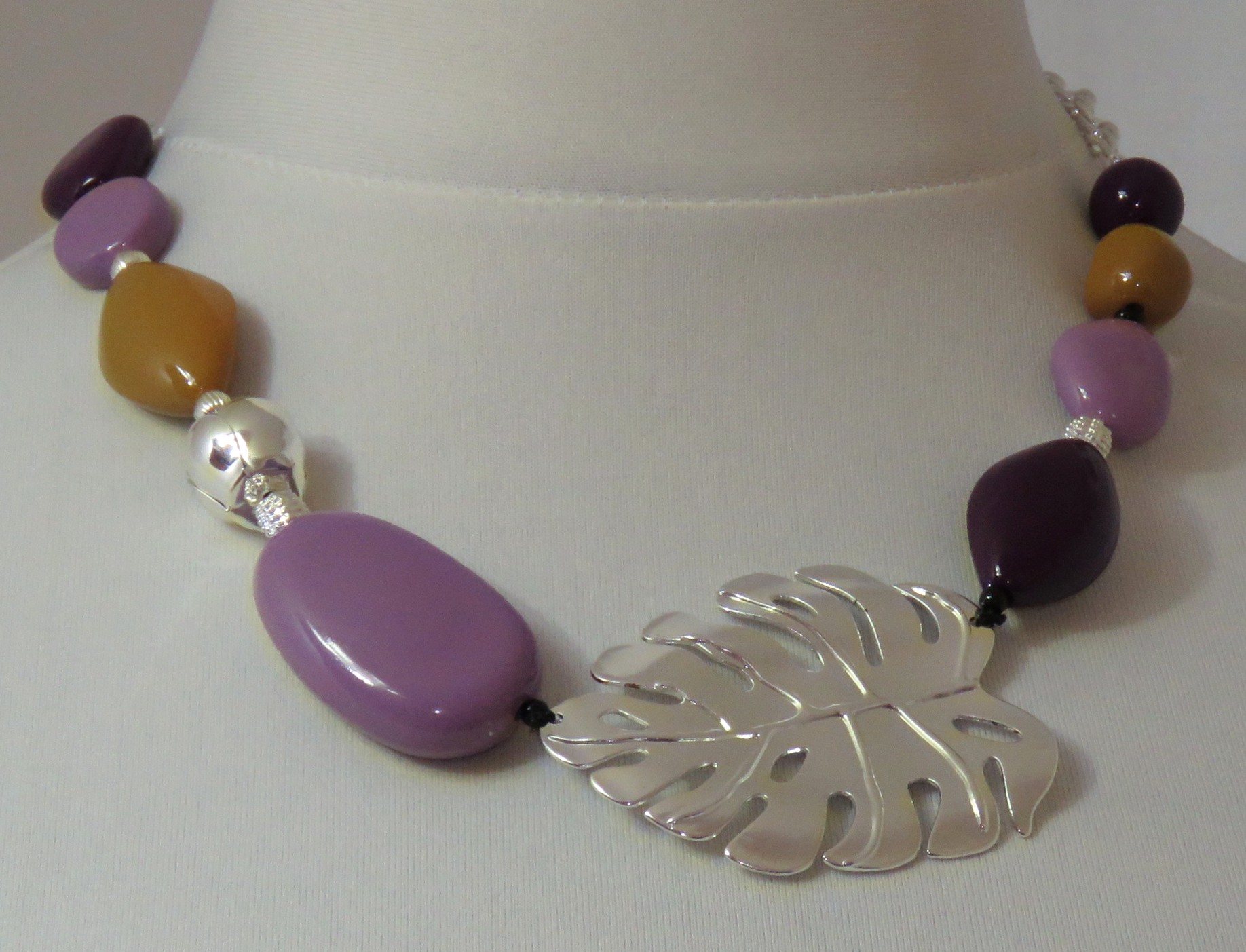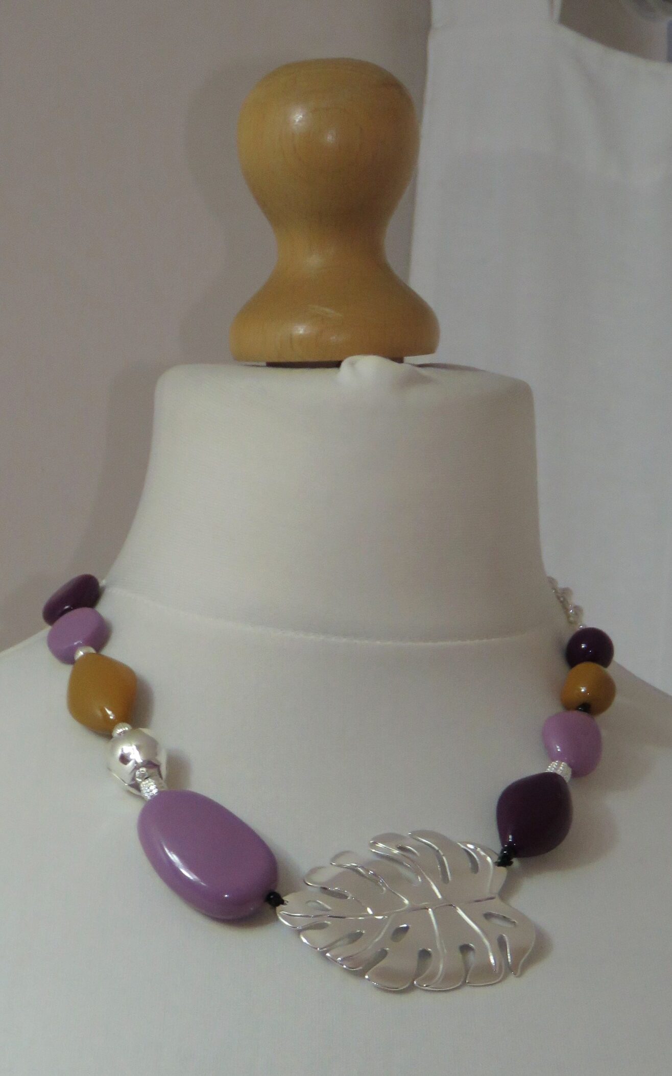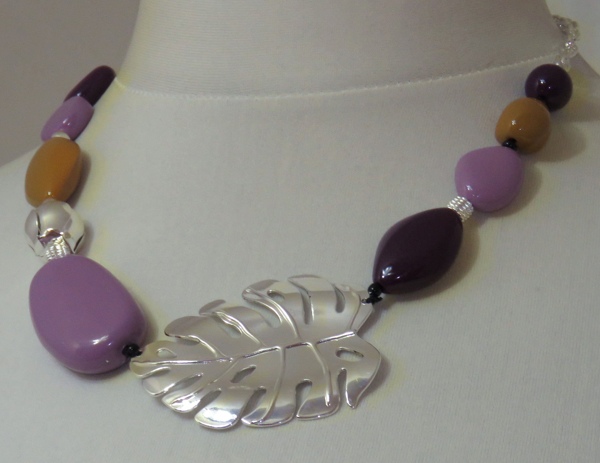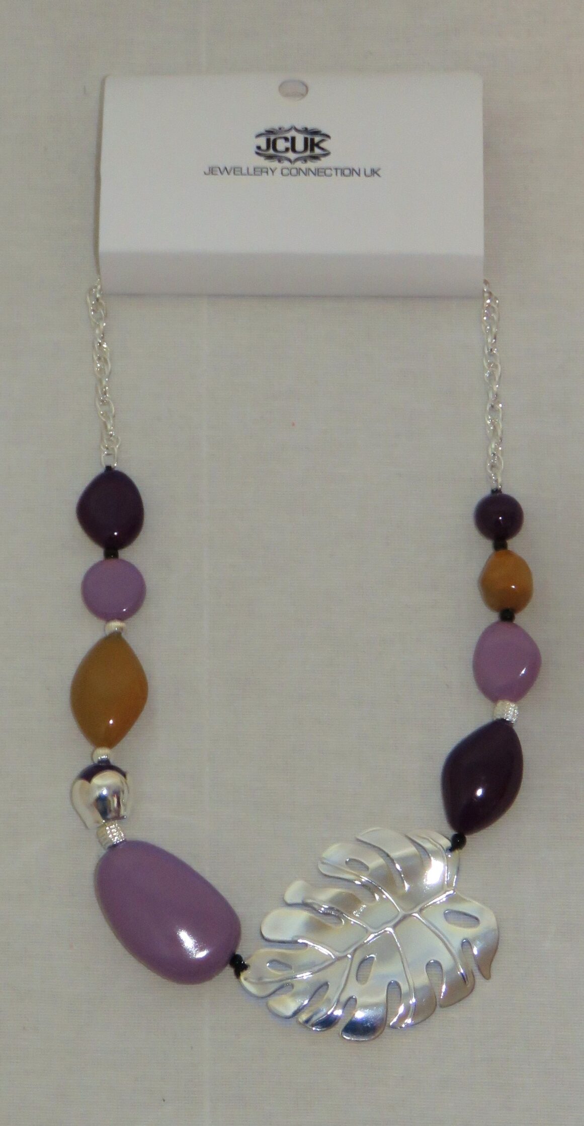 - Lagenlook, statement necklace, made of mauve, purple and toffee coloured beads and a large, silver-coloured metal leaf, suspended from a silver-coloured chain