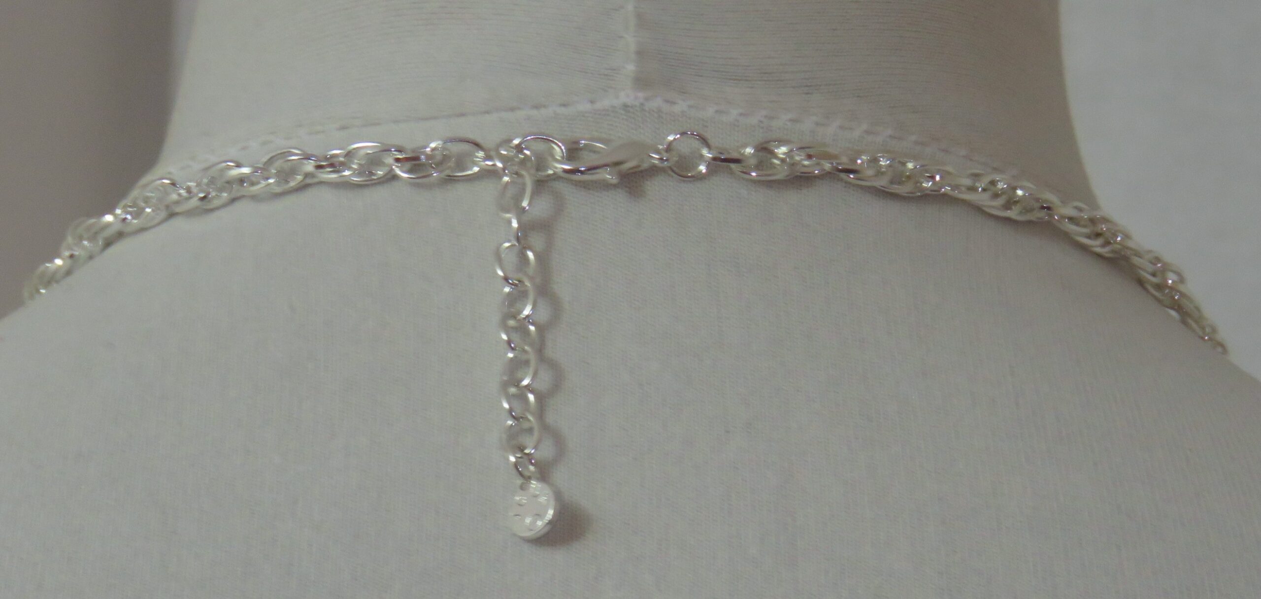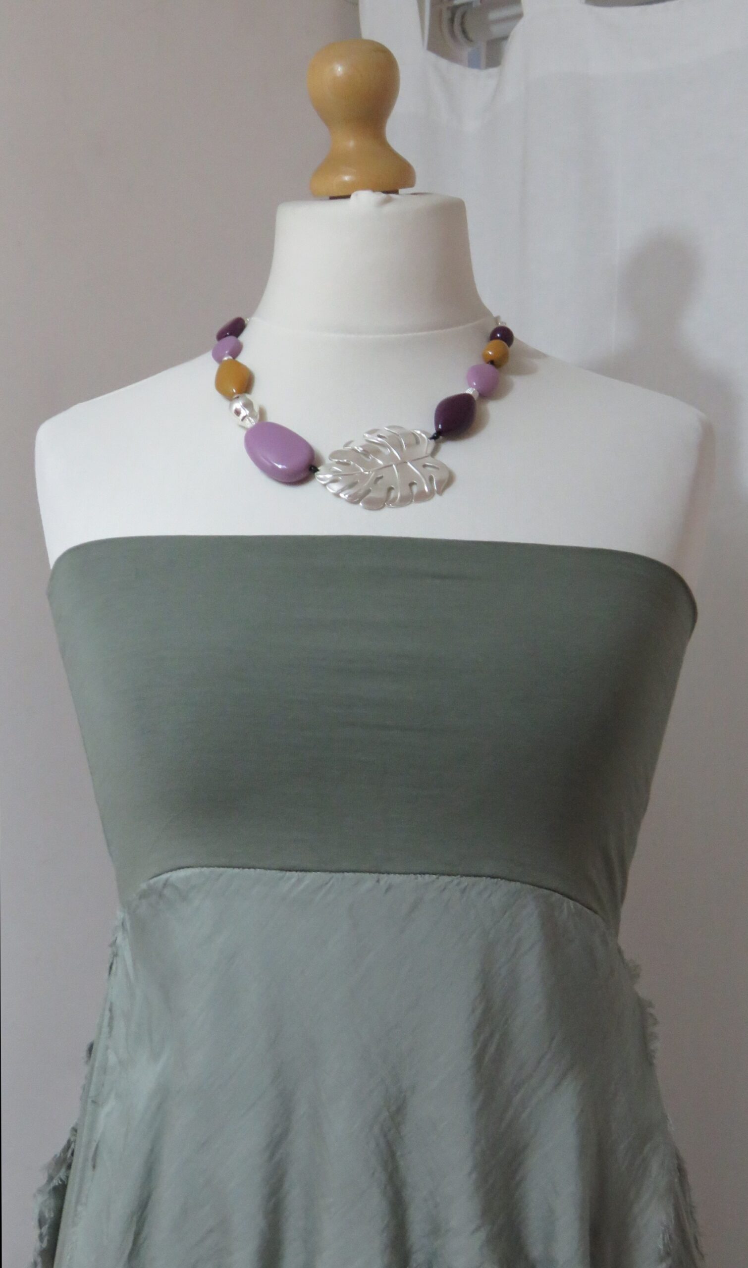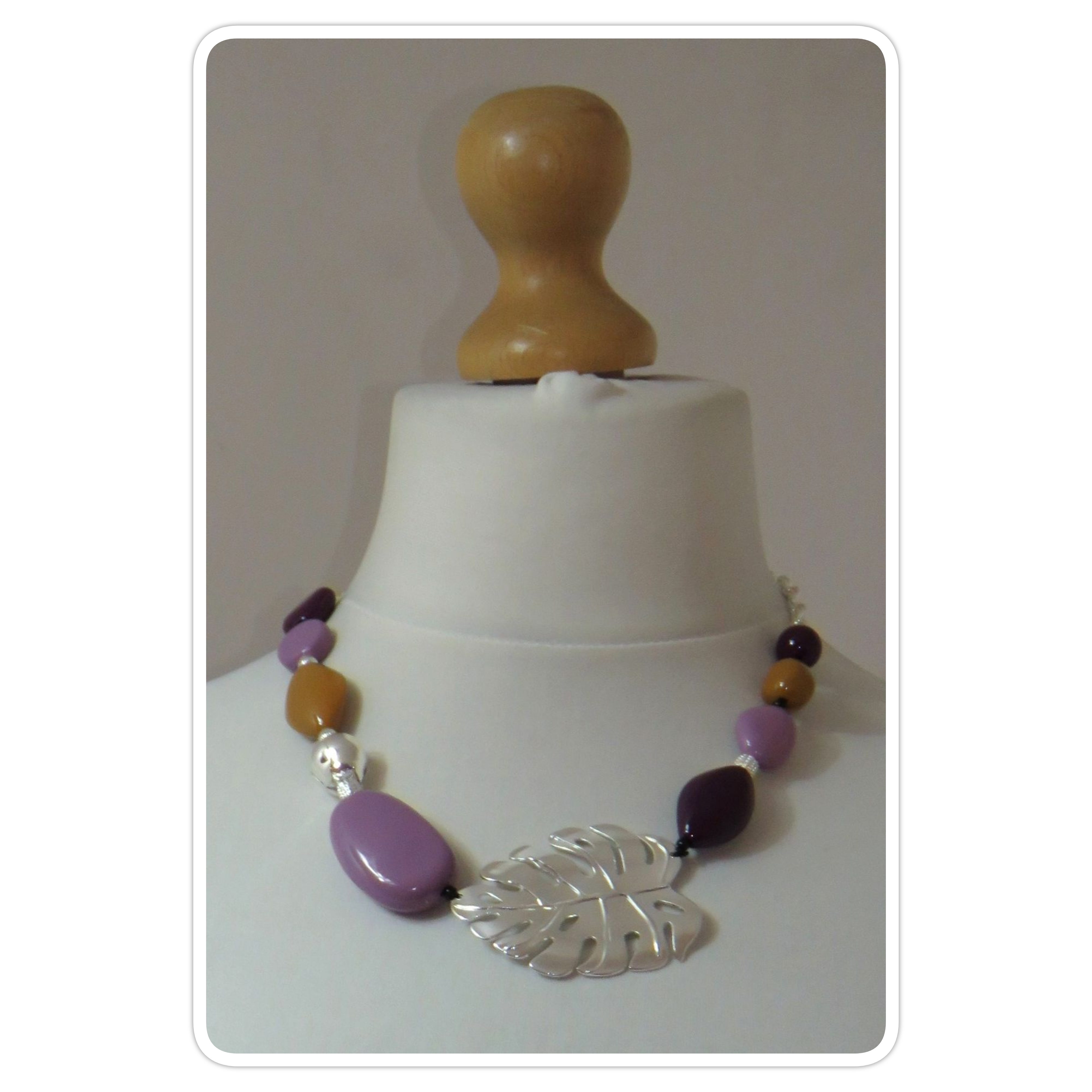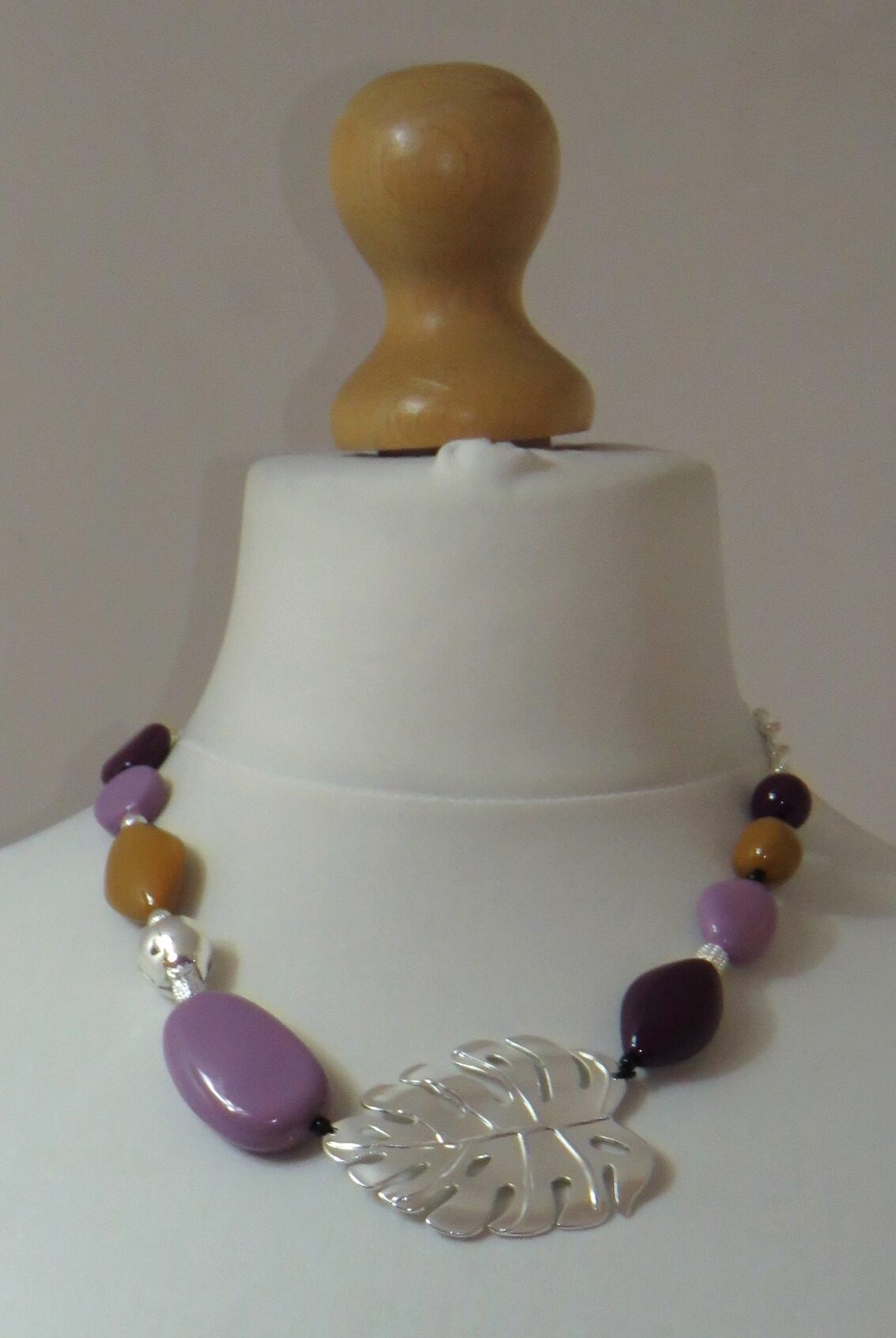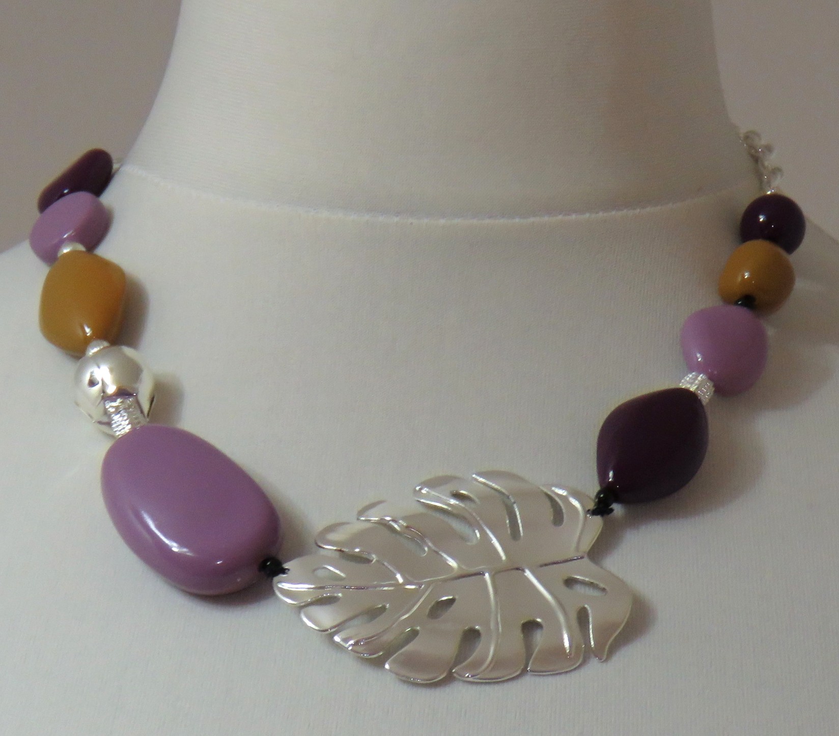 - Lagenlook, statement necklace, made of mauve, purple and toffee coloured beads and a large, silver-coloured metal leaf, suspended from a silver-coloured chain