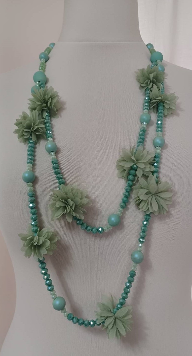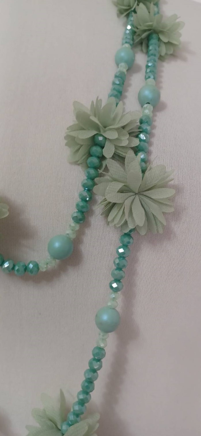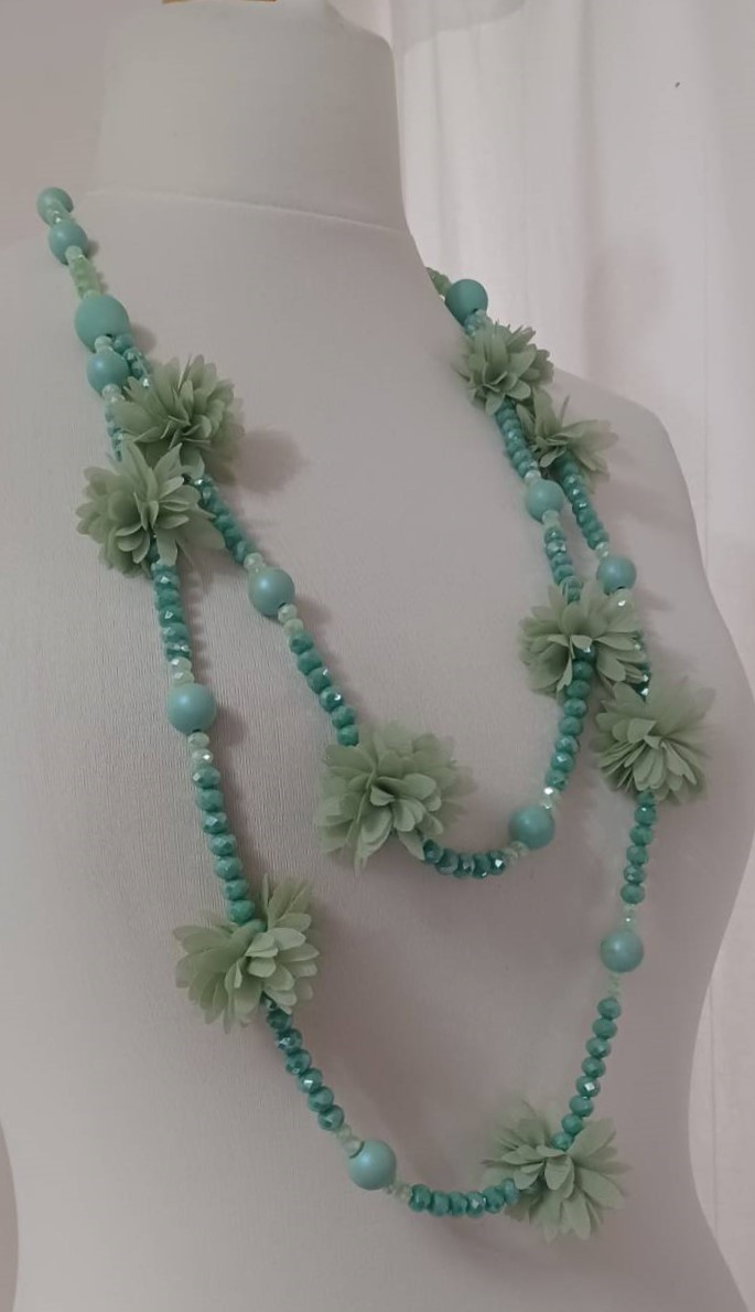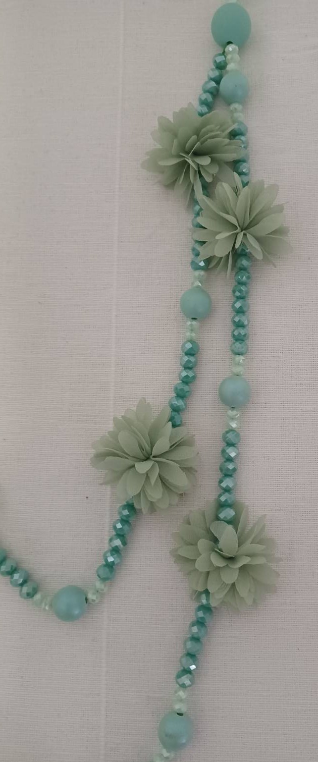 Mint green, bead & fabric flowers, long necklace