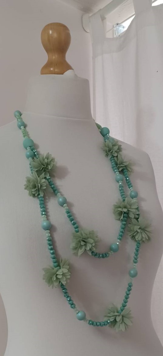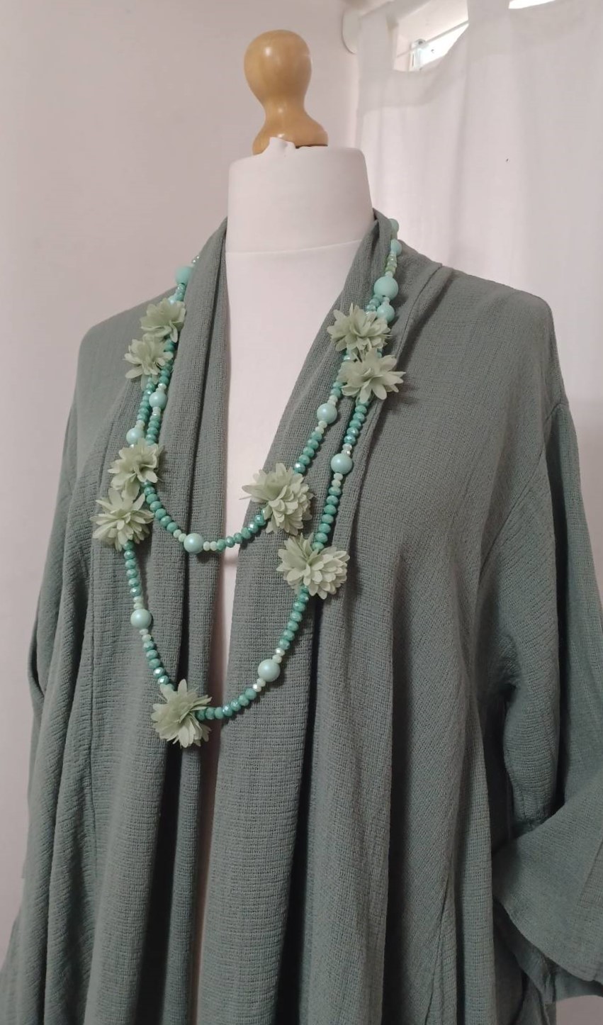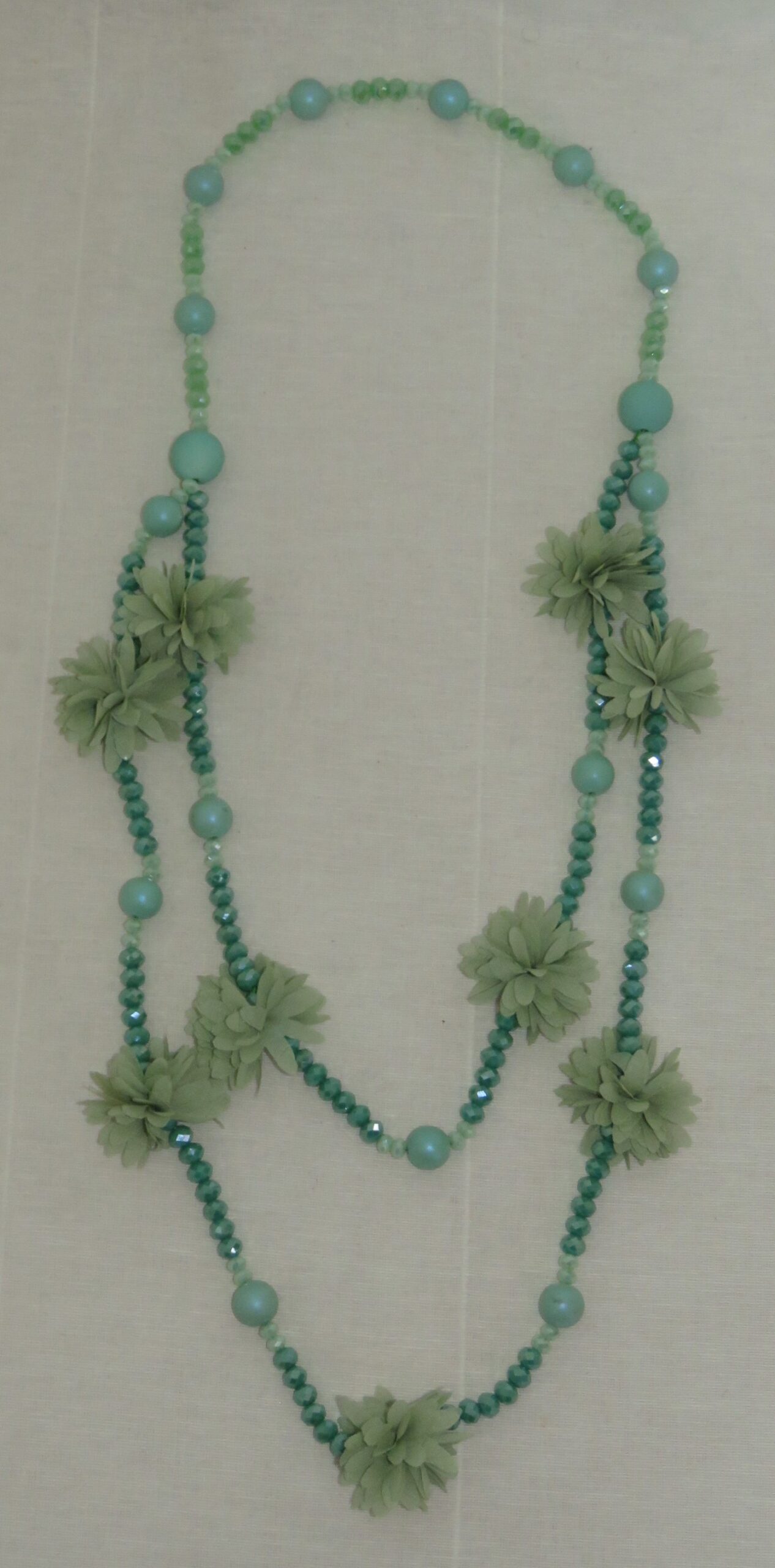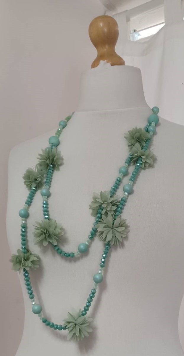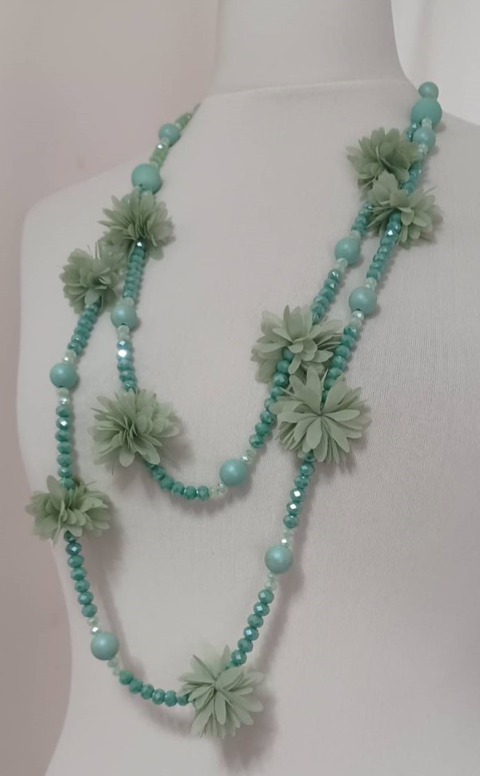 Mint green, bead & fabric flowers, long necklace