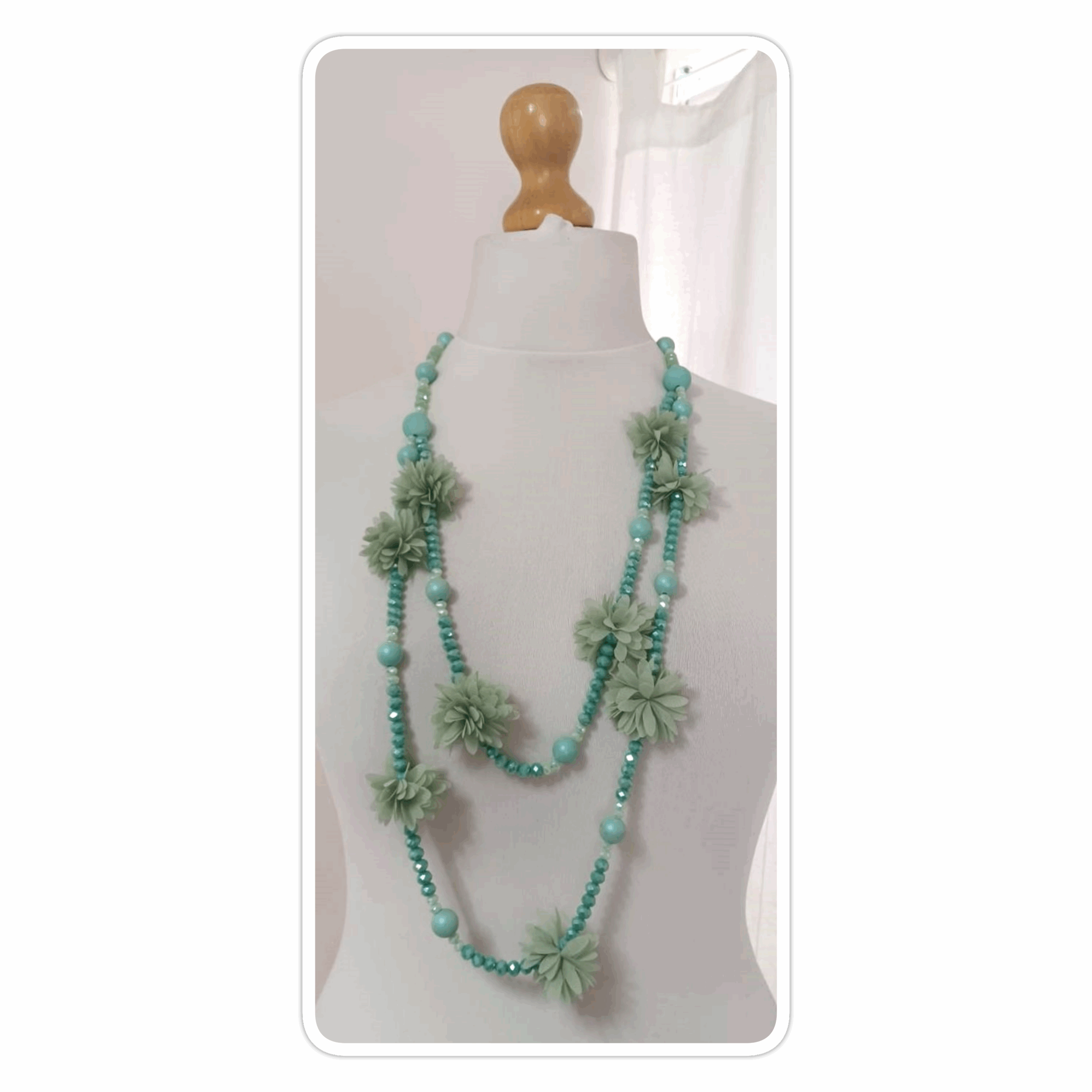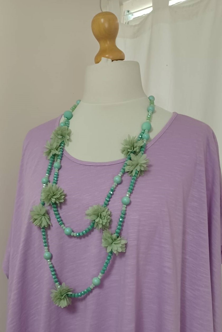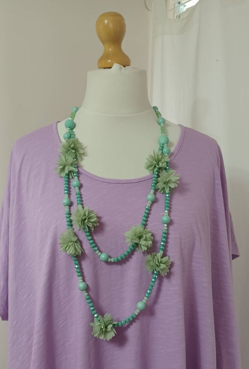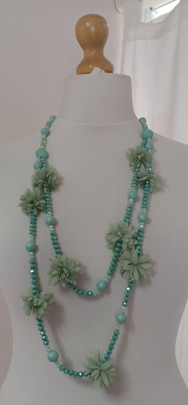 Mint green, bead & fabric flowers, long necklace