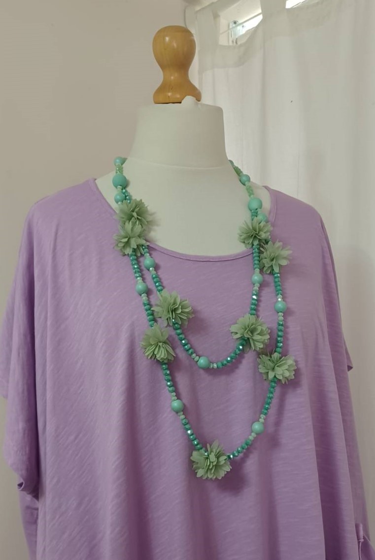 • Made from a double strand of round, acrylic beads and small faceted ones and fabric flowers