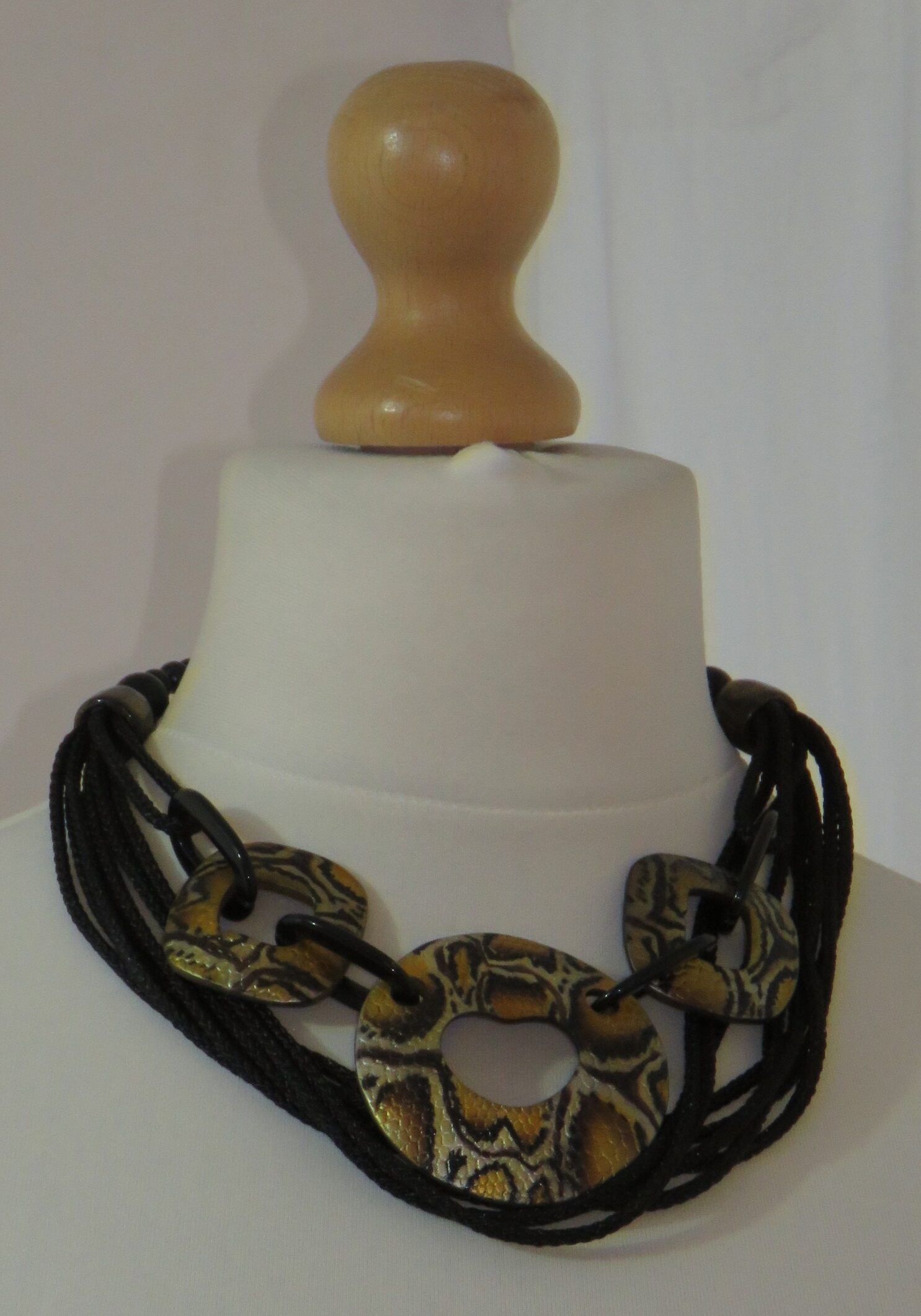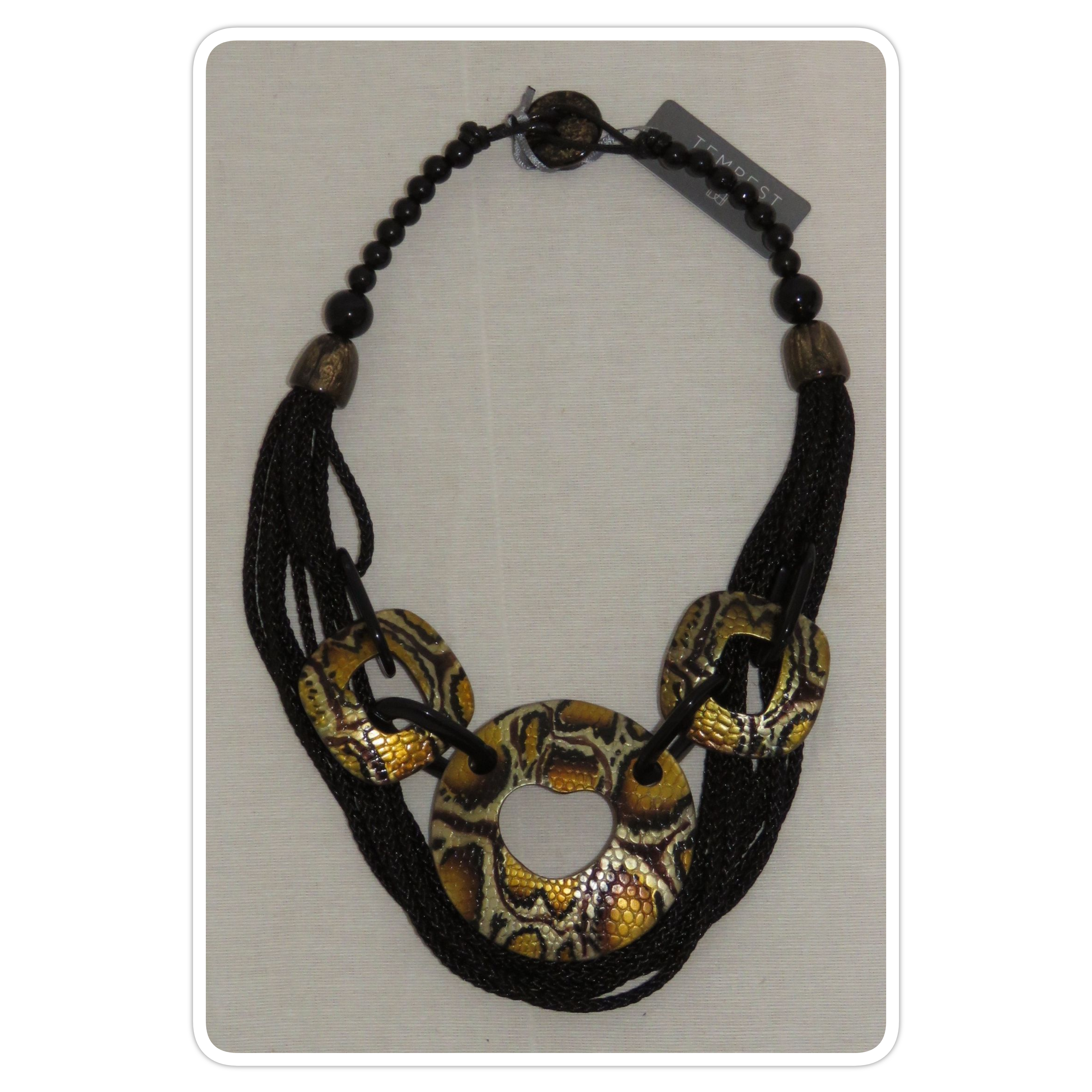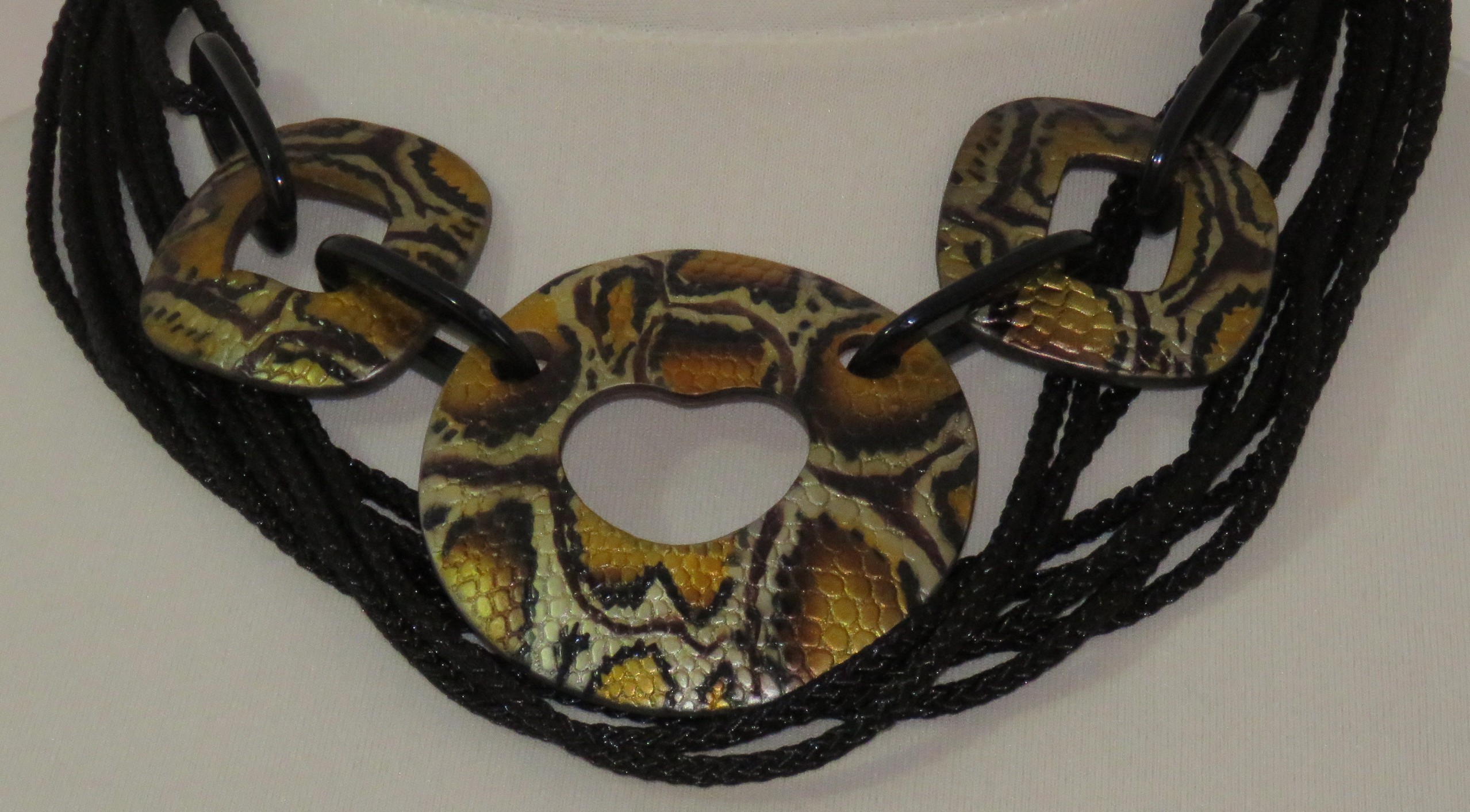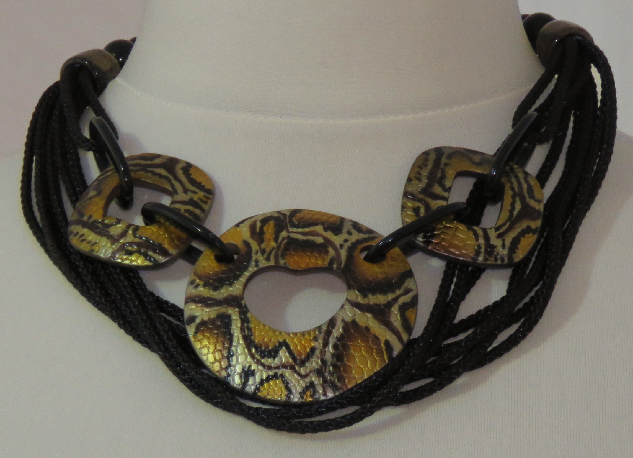 Statement necklace, made of 3 large, mustard snake-print, resin components, joined together with black, resin links, and multiple strands of black, braided cord