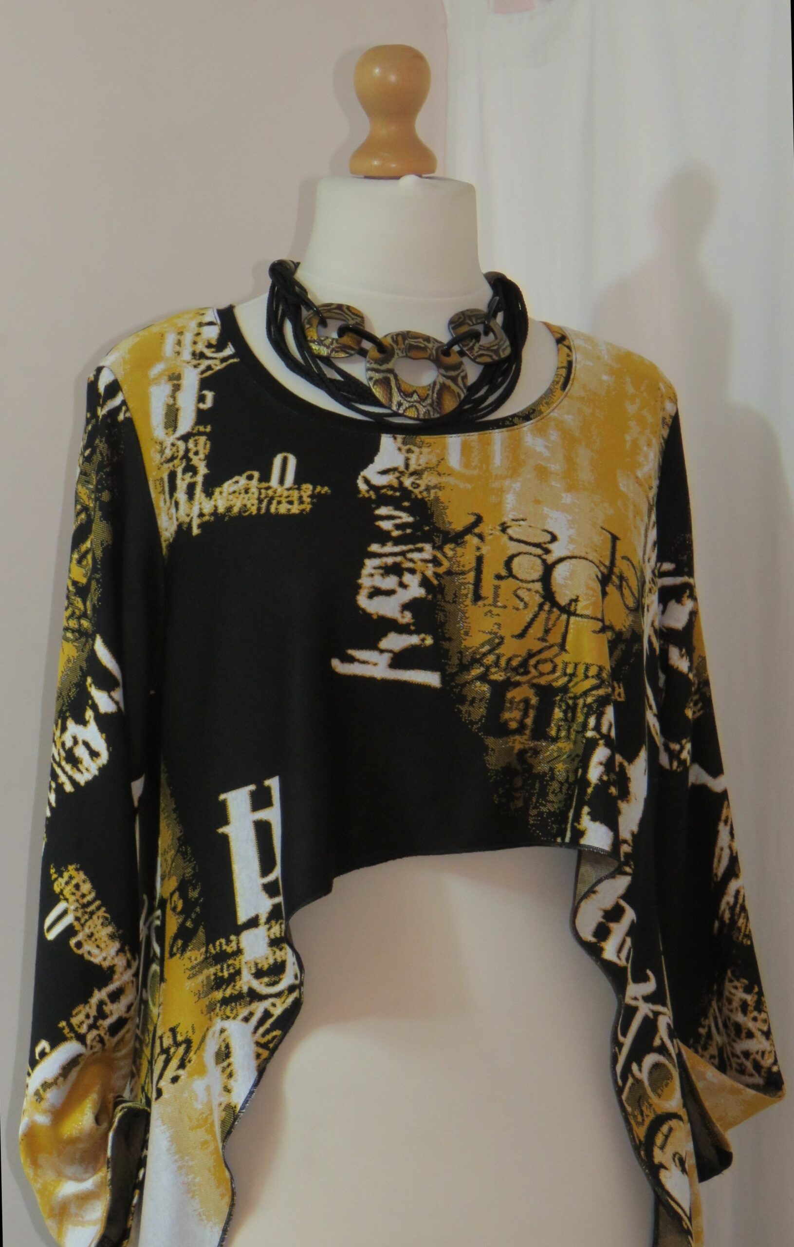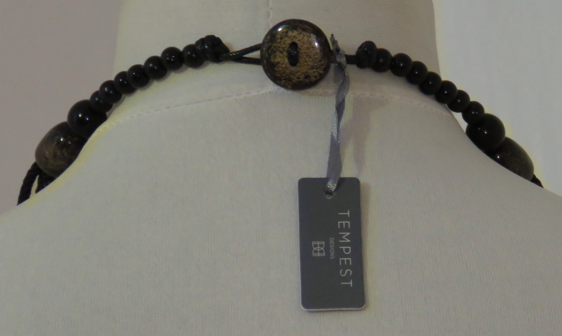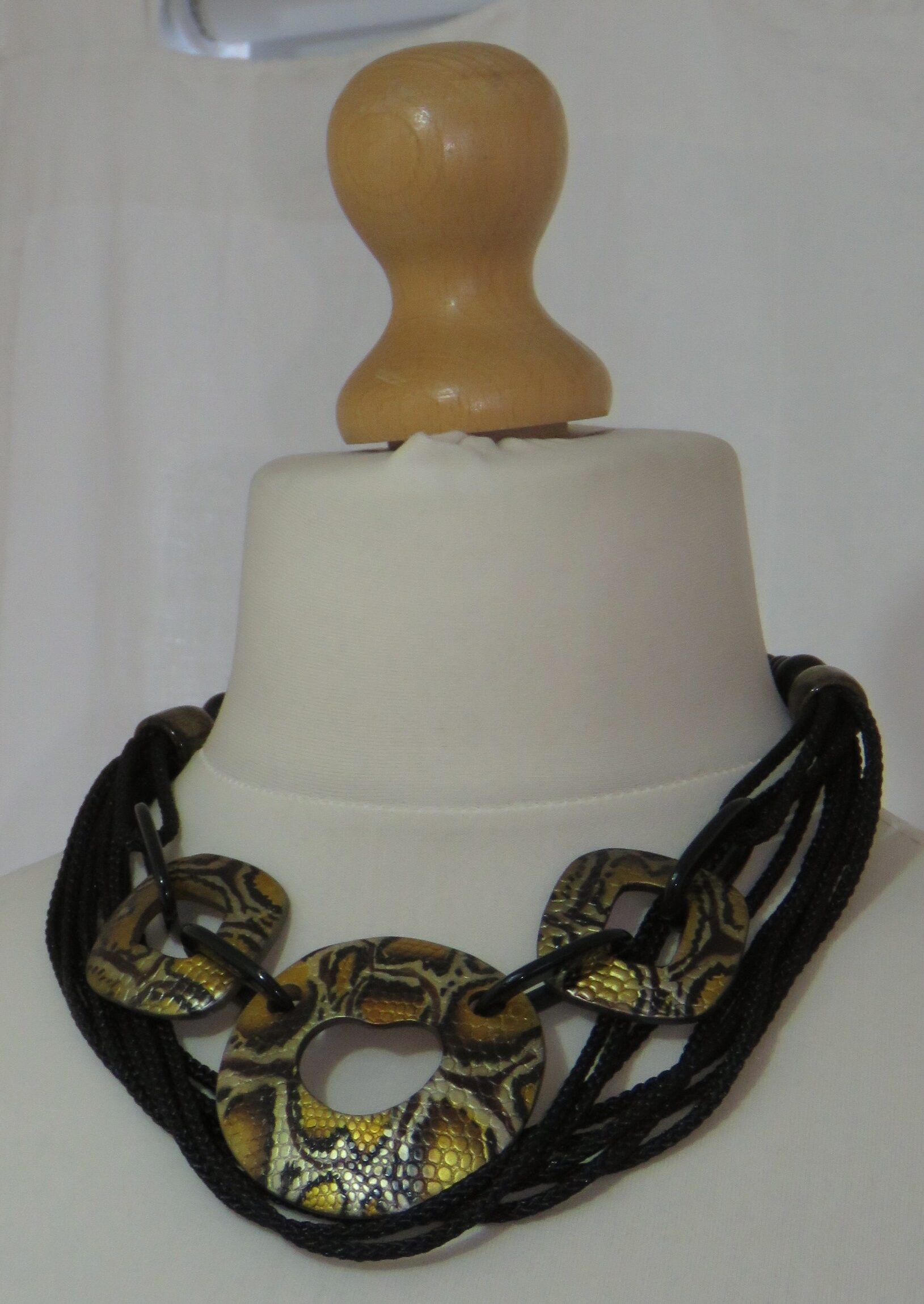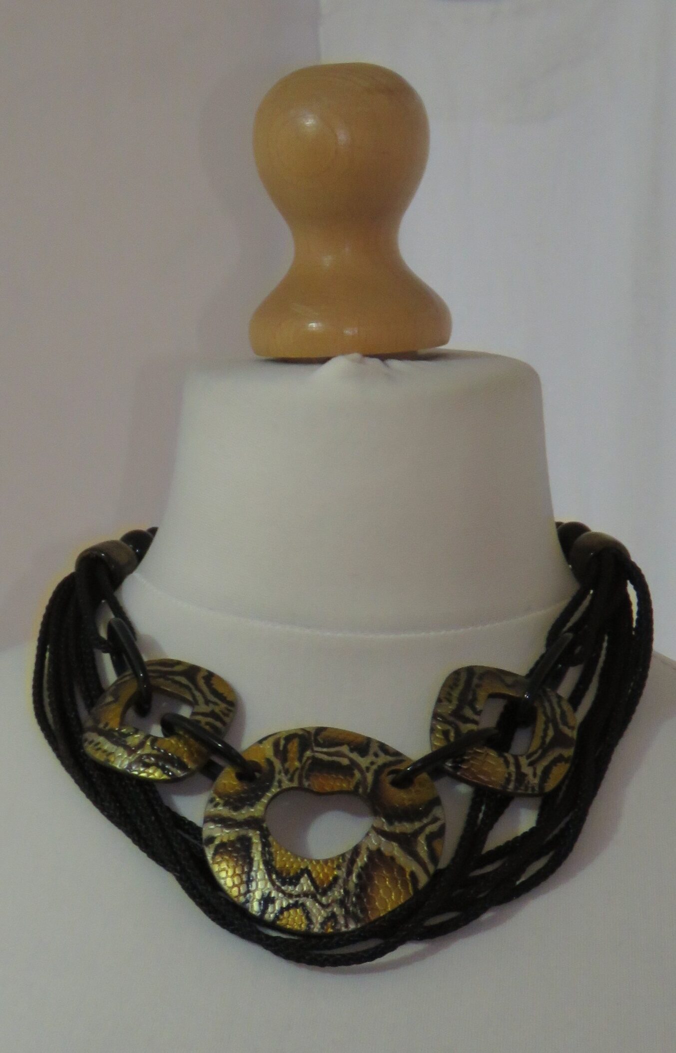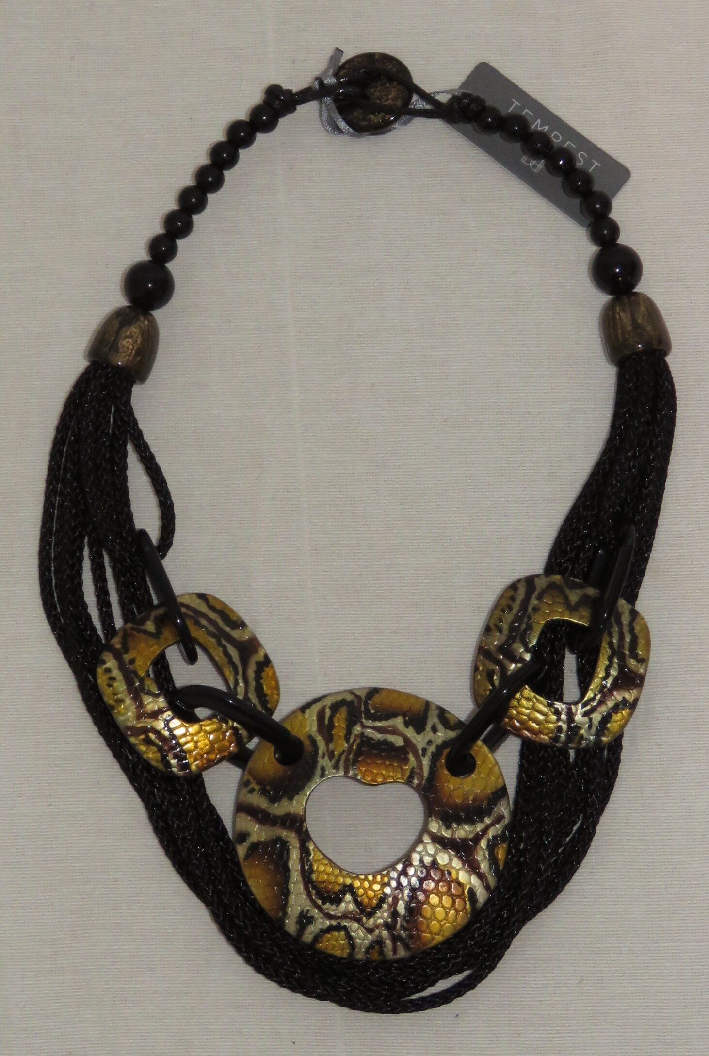 Statement necklace, made of 3 large, mustard snake-print, resin components, joined together with black, resin links, and multiple strands of black, braided cord