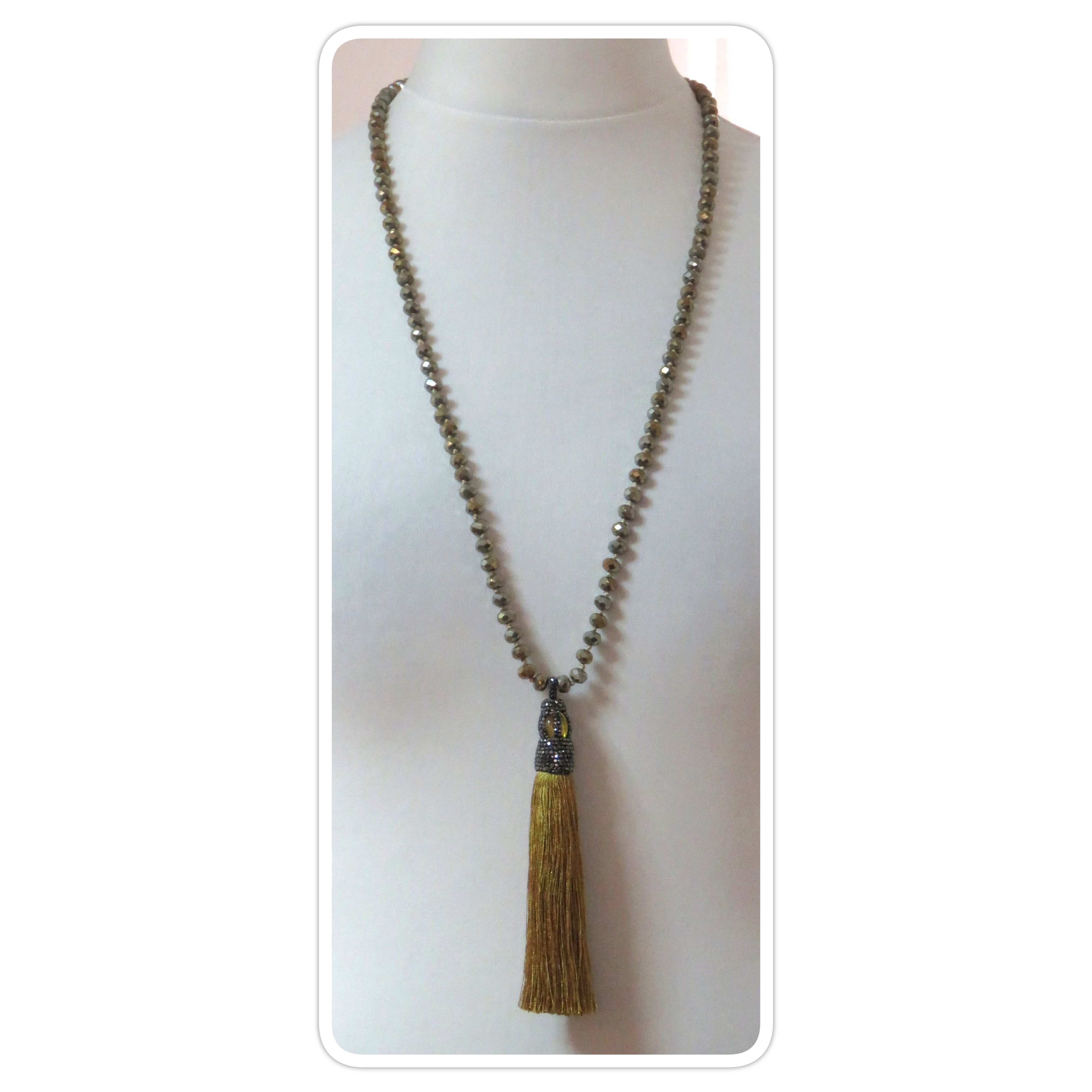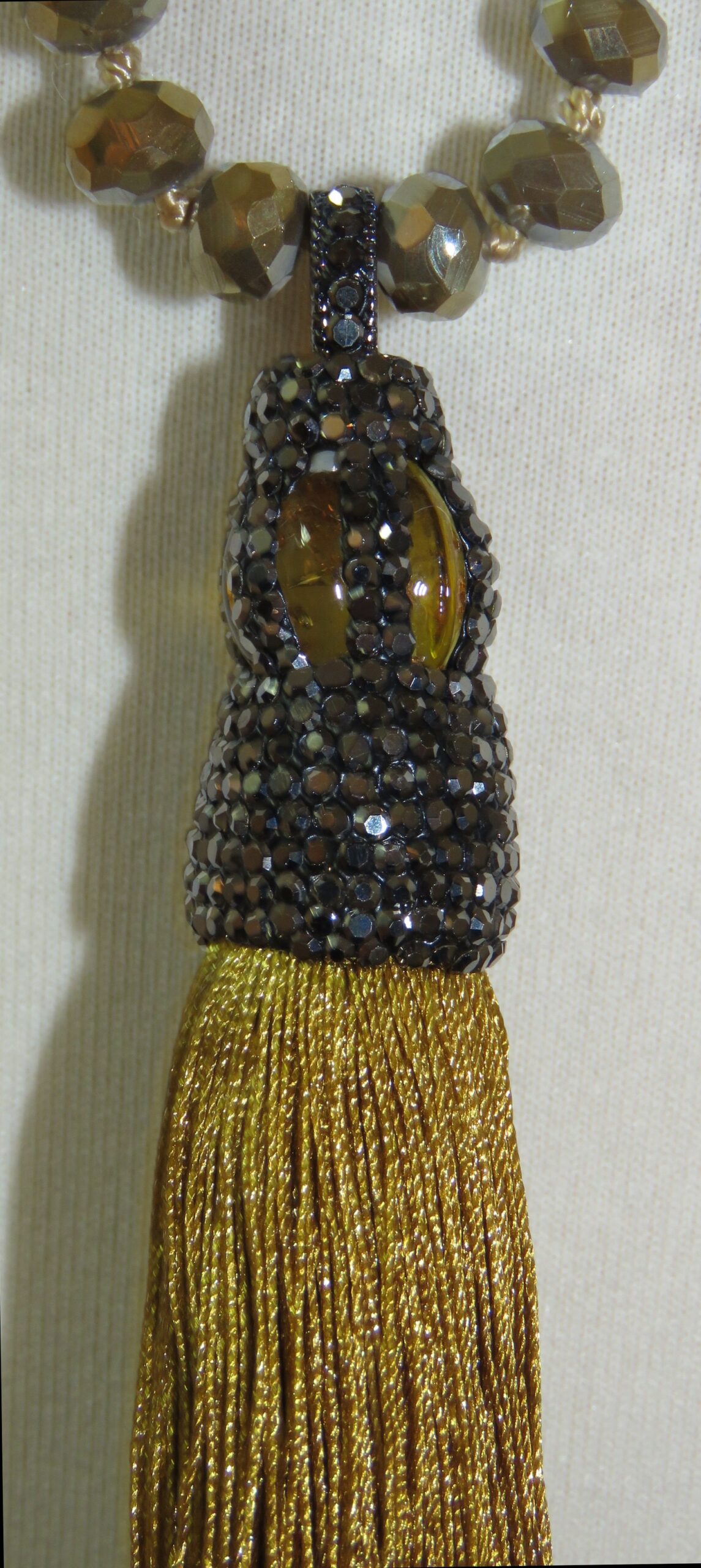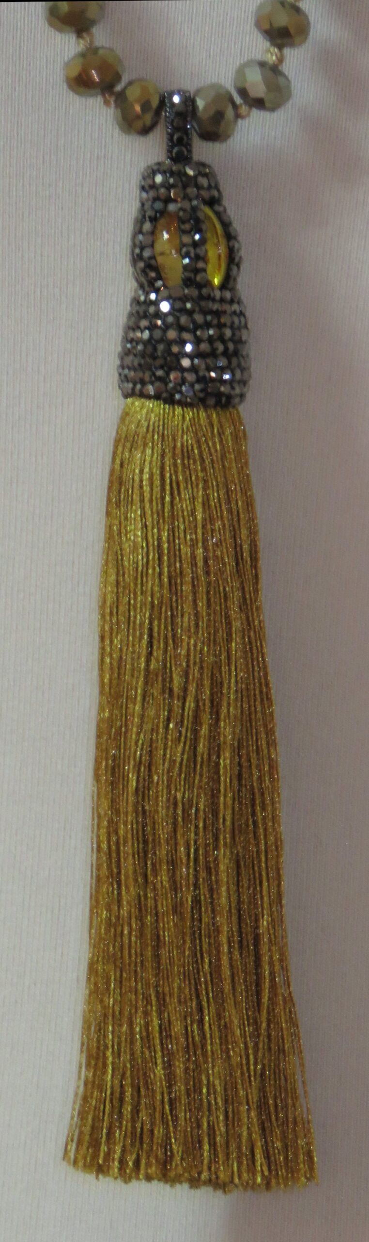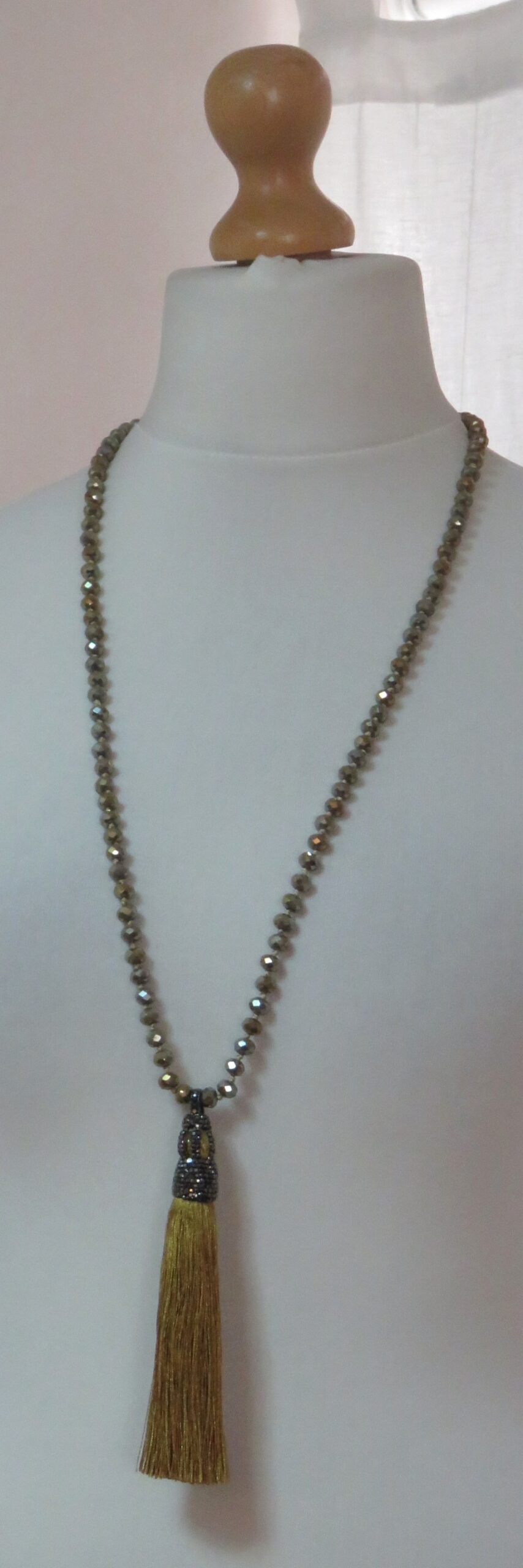 • Lagenlook, statement necklace, made of faceted, mustard-coloured beads and a fabulous, silky, mustard tassel