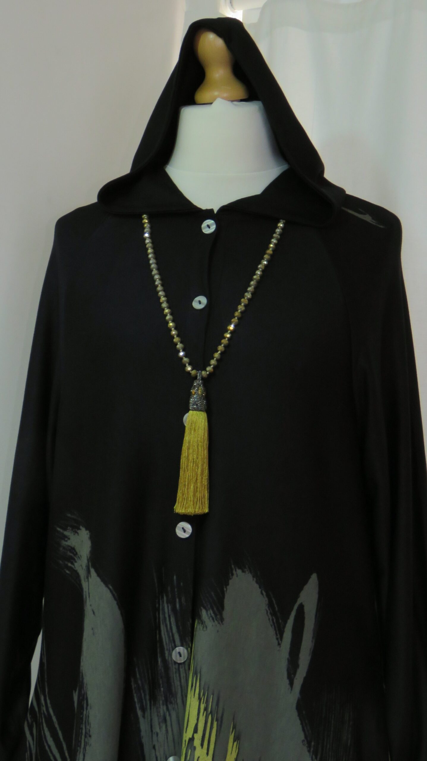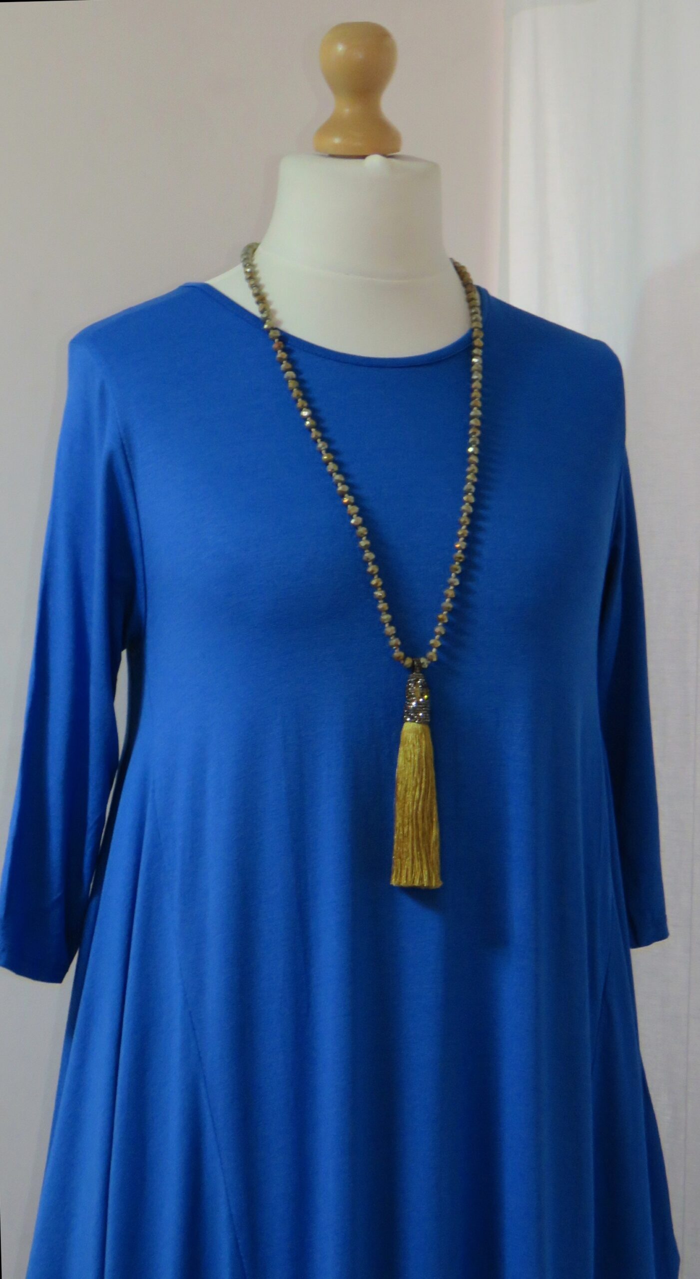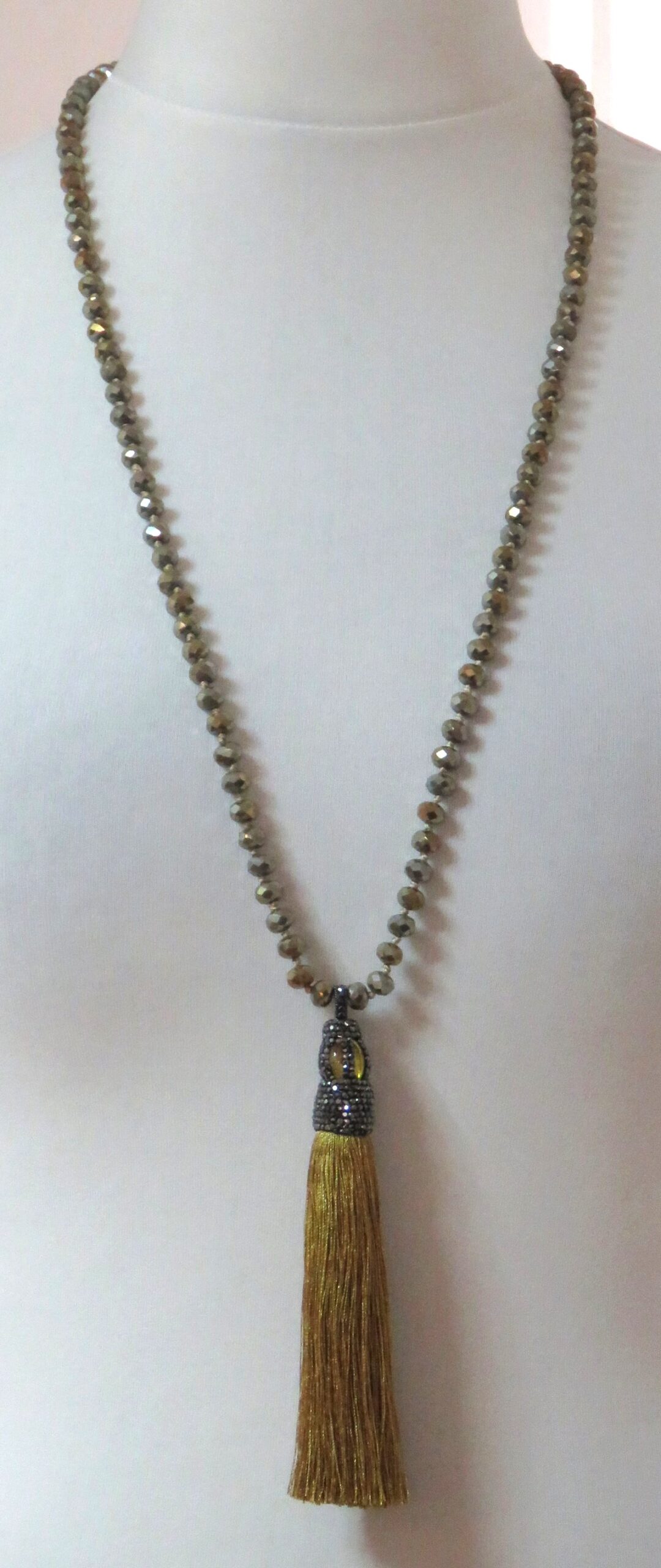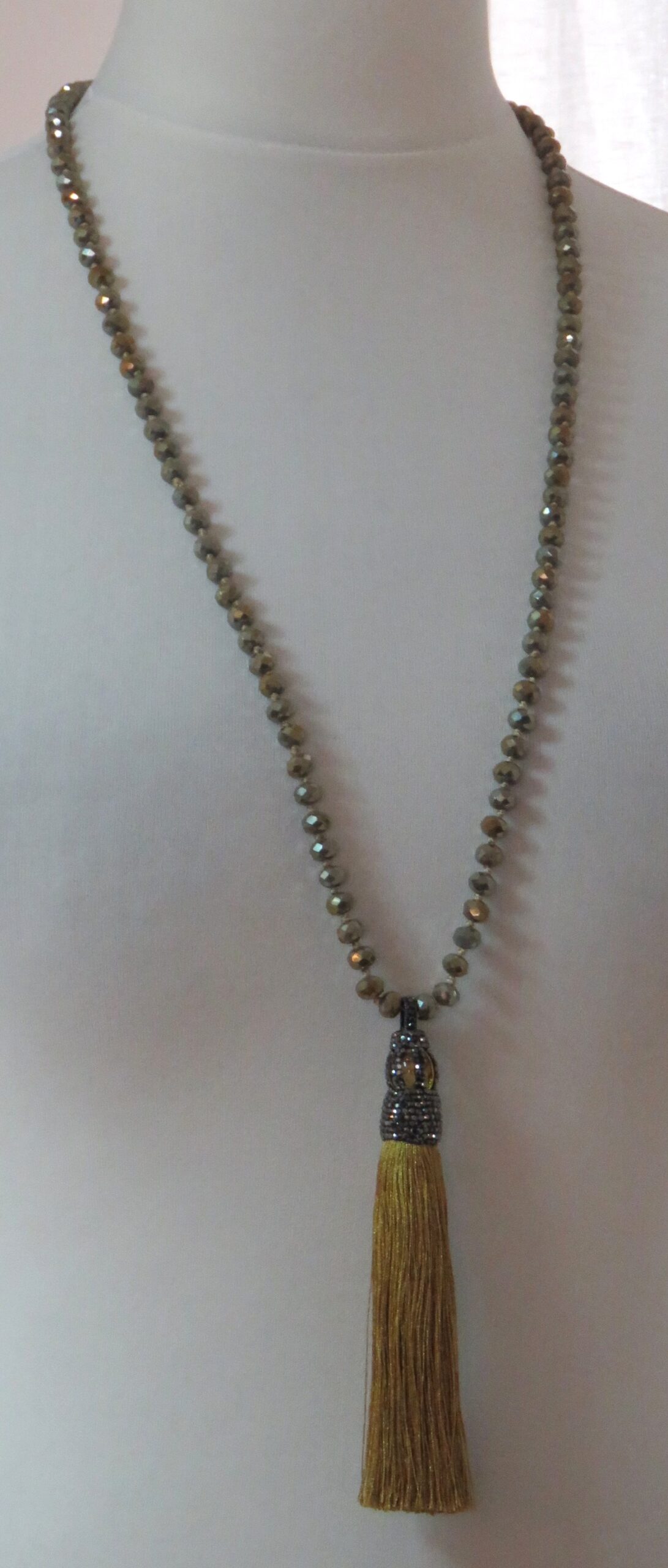 • Lagenlook, statement necklace, made of faceted, mustard-coloured beads and a fabulous, silky, mustard tassel