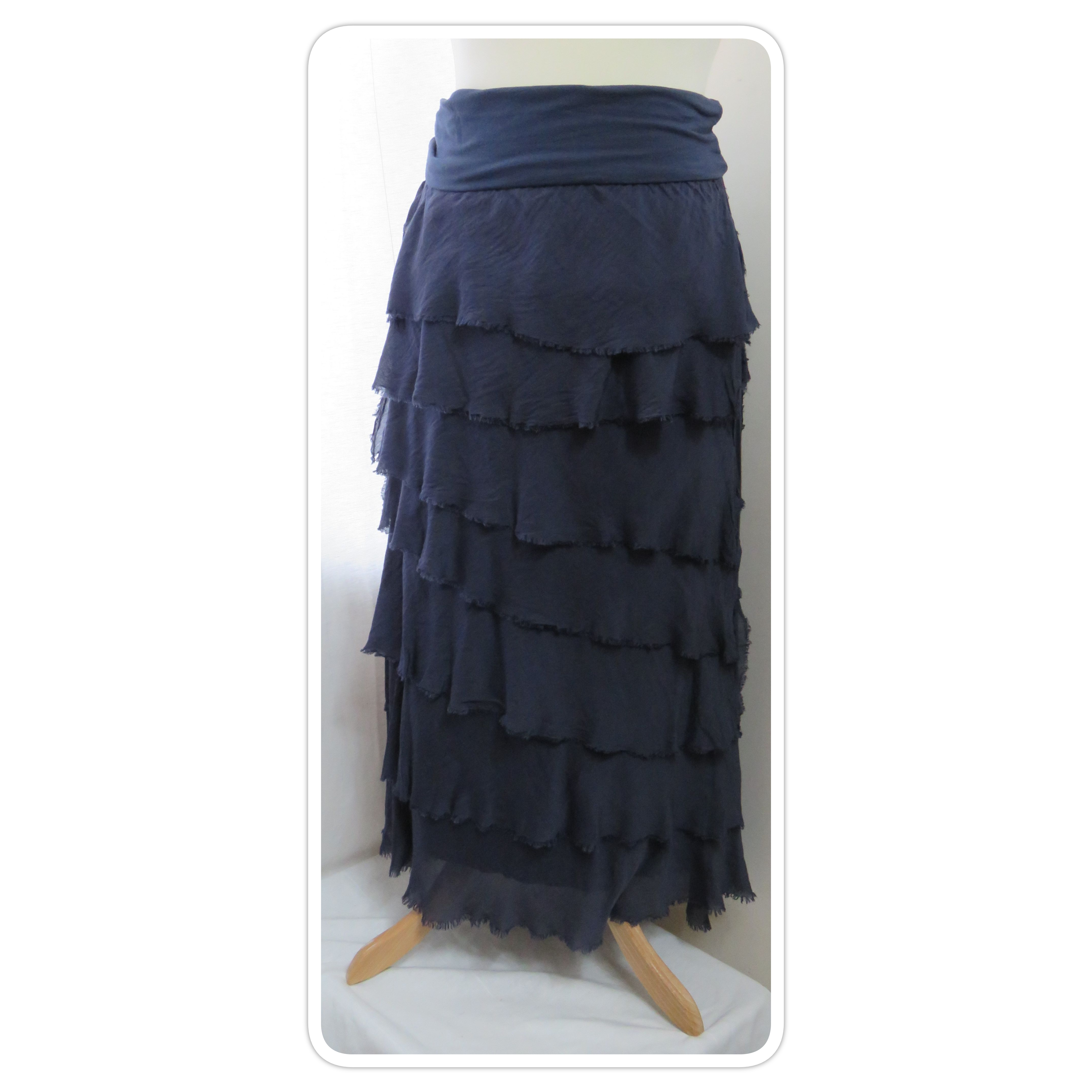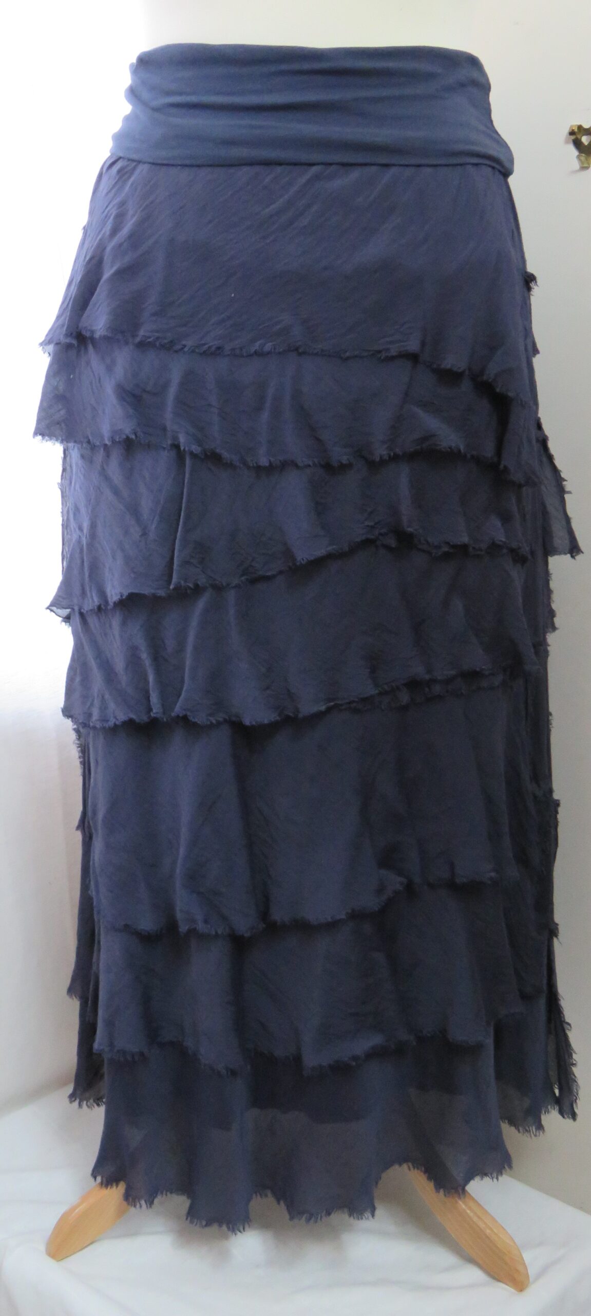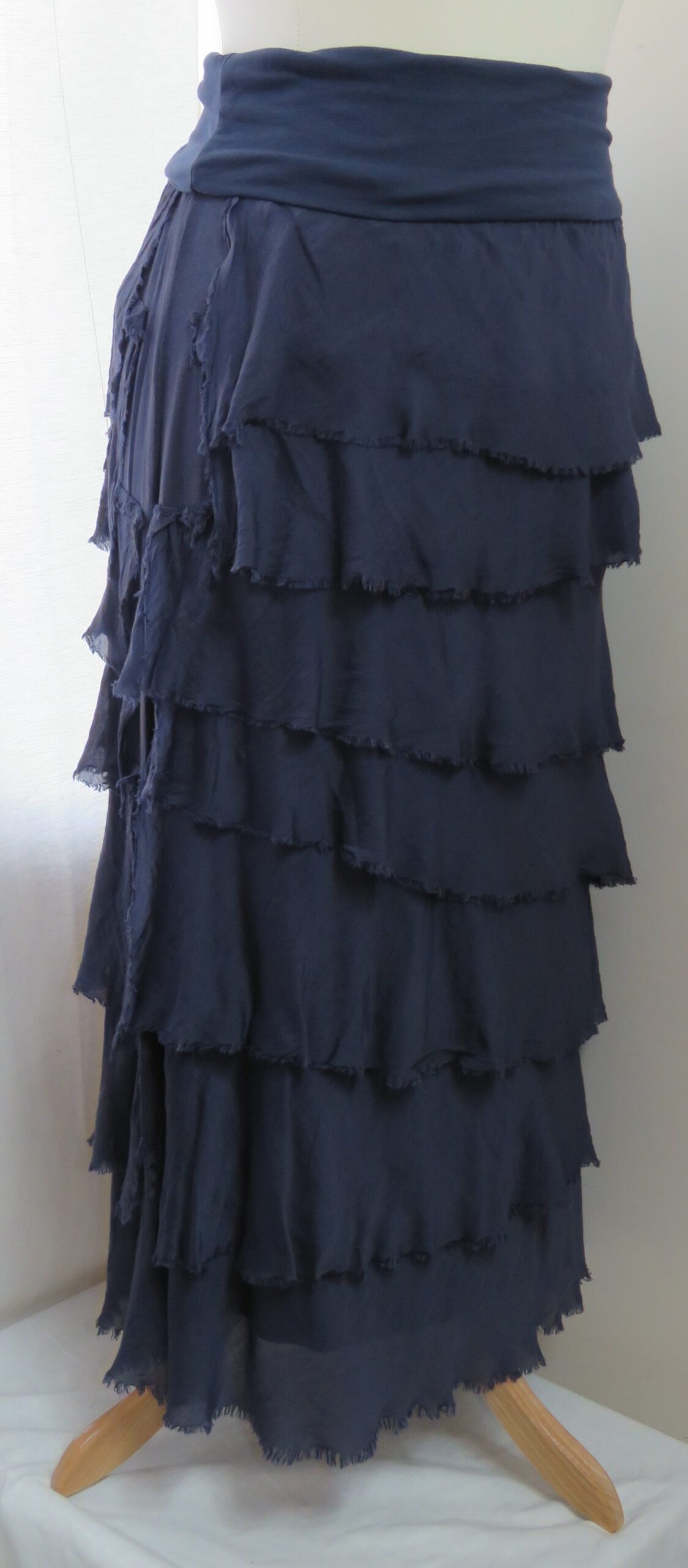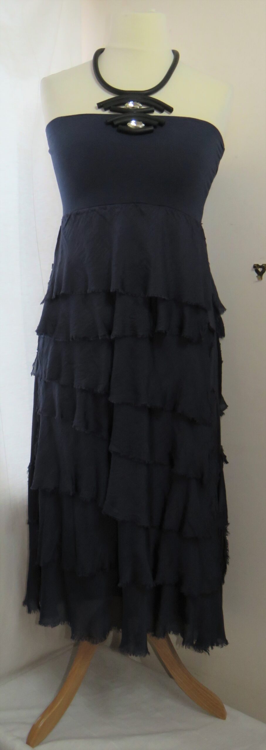 - Fine viscose jersey (95% viscose/5% elastane) with tiers of a silk-blend fabric sewn on asymmetrically back and front (40% cotton/30% viscose/30% silk) – these have a raw/frayed edge