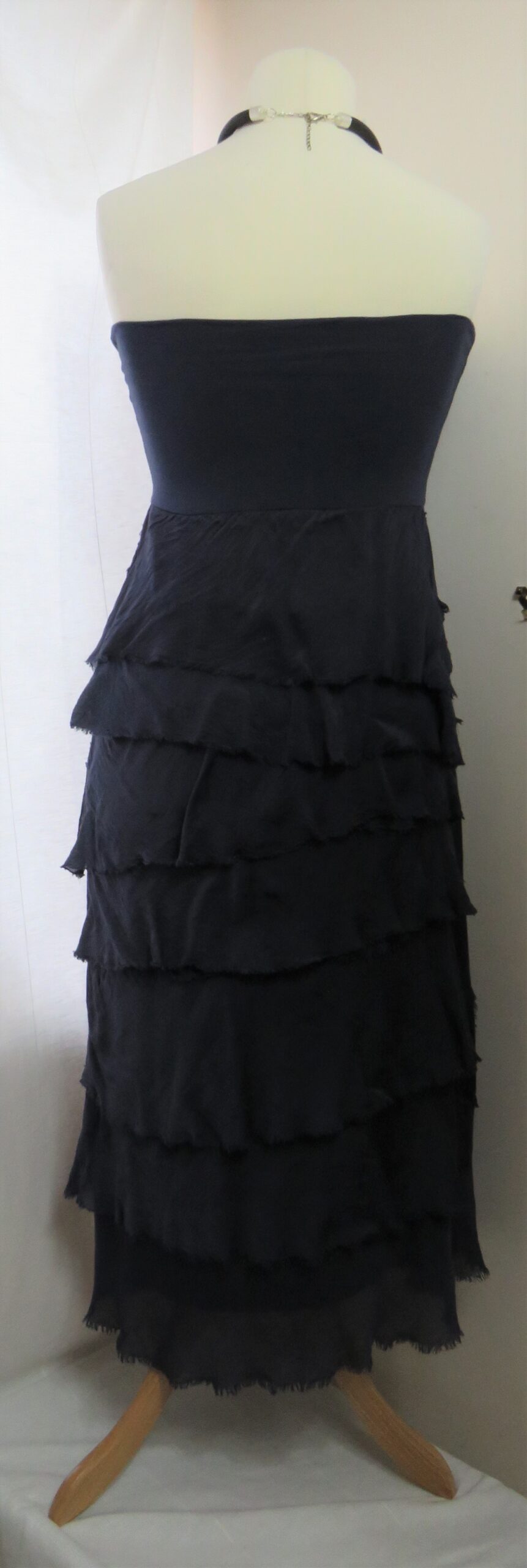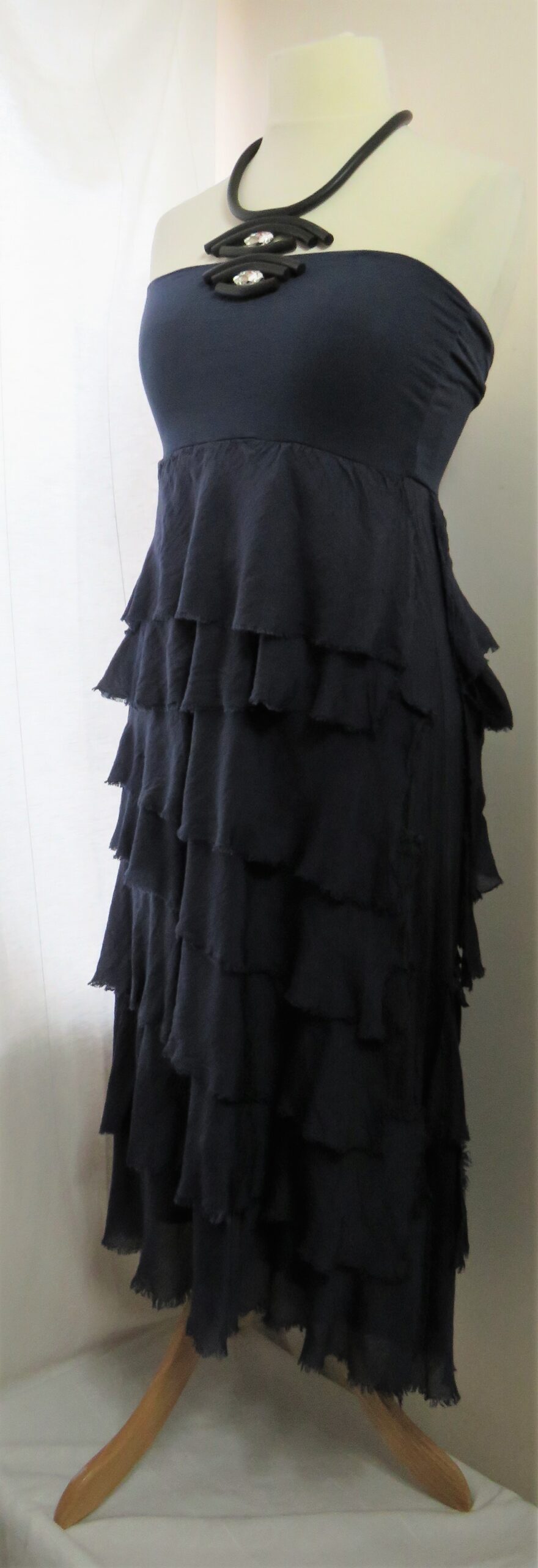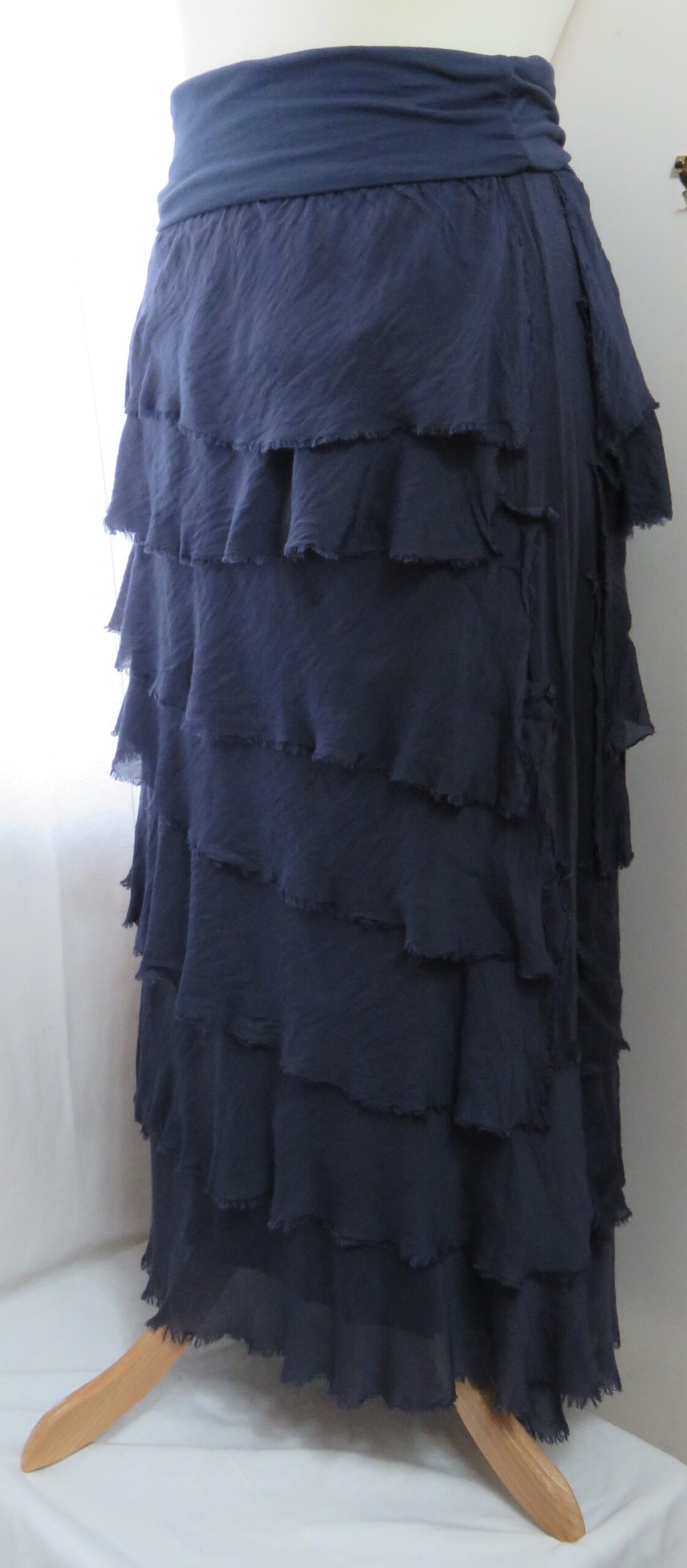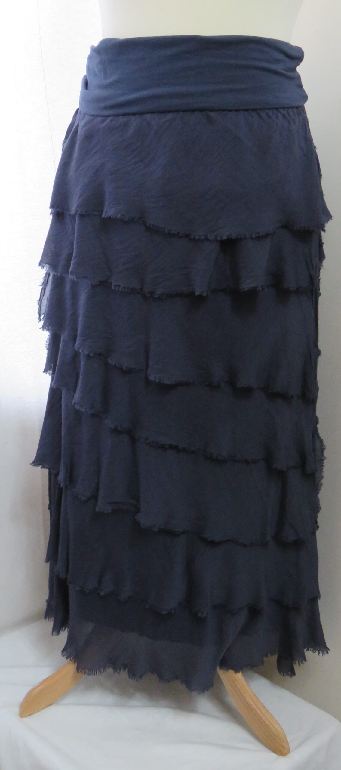 - Fine viscose jersey (95% viscose/5% elastane) with tiers of a silk-blend fabric sewn on asymmetrically back and front (40% cotton/30% viscose/30% silk) – these have a raw/frayed edge