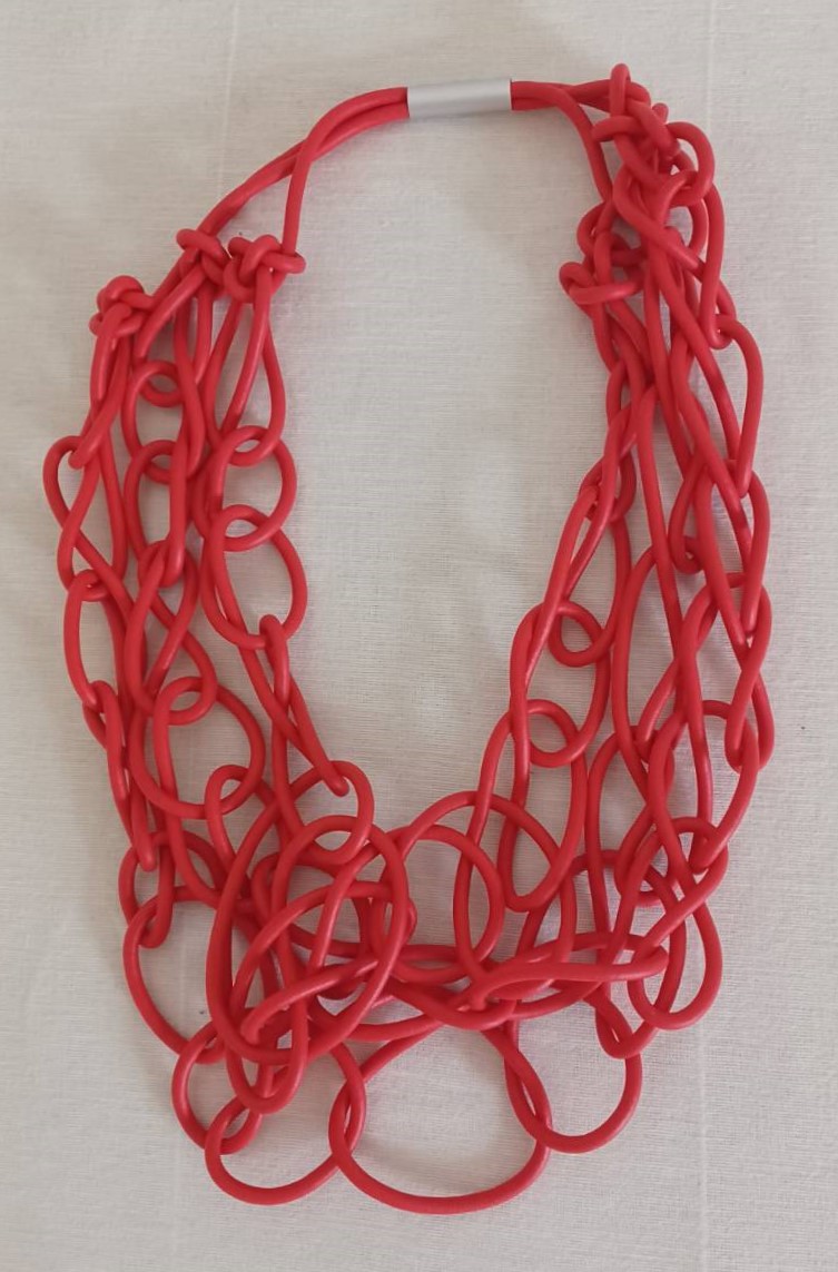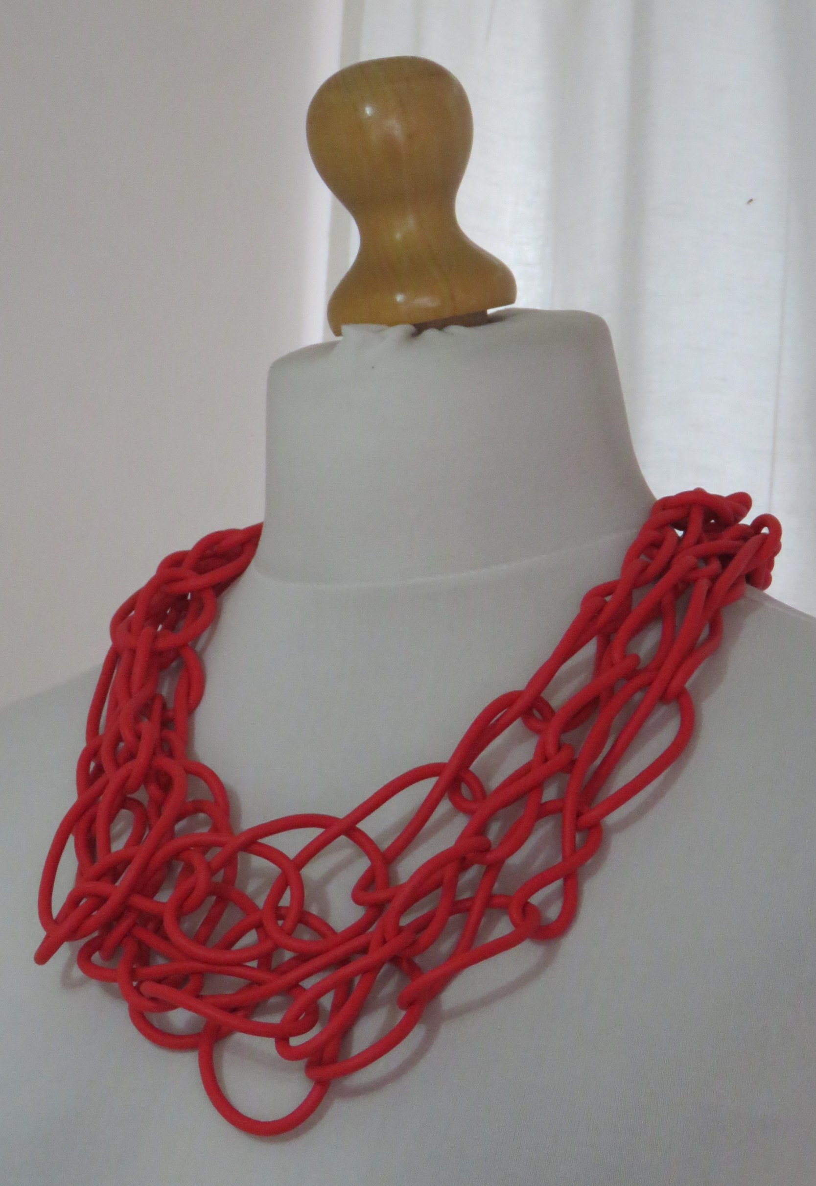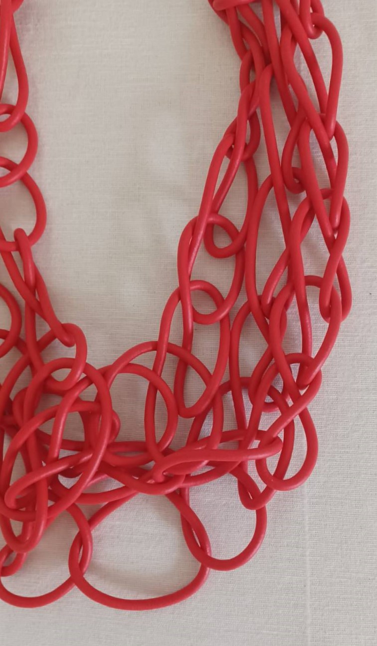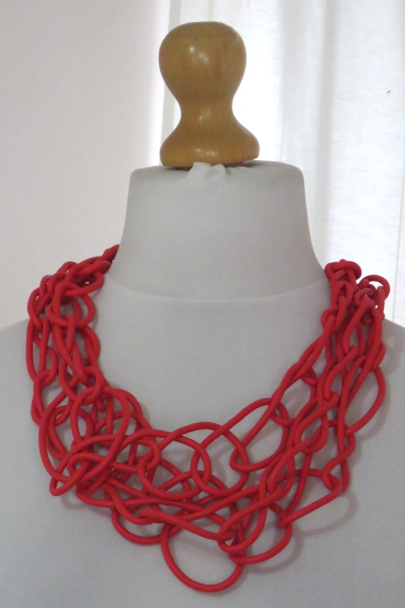 • Lagenlook statement necklace, made of 3 strands of irregular, red, rubber chain