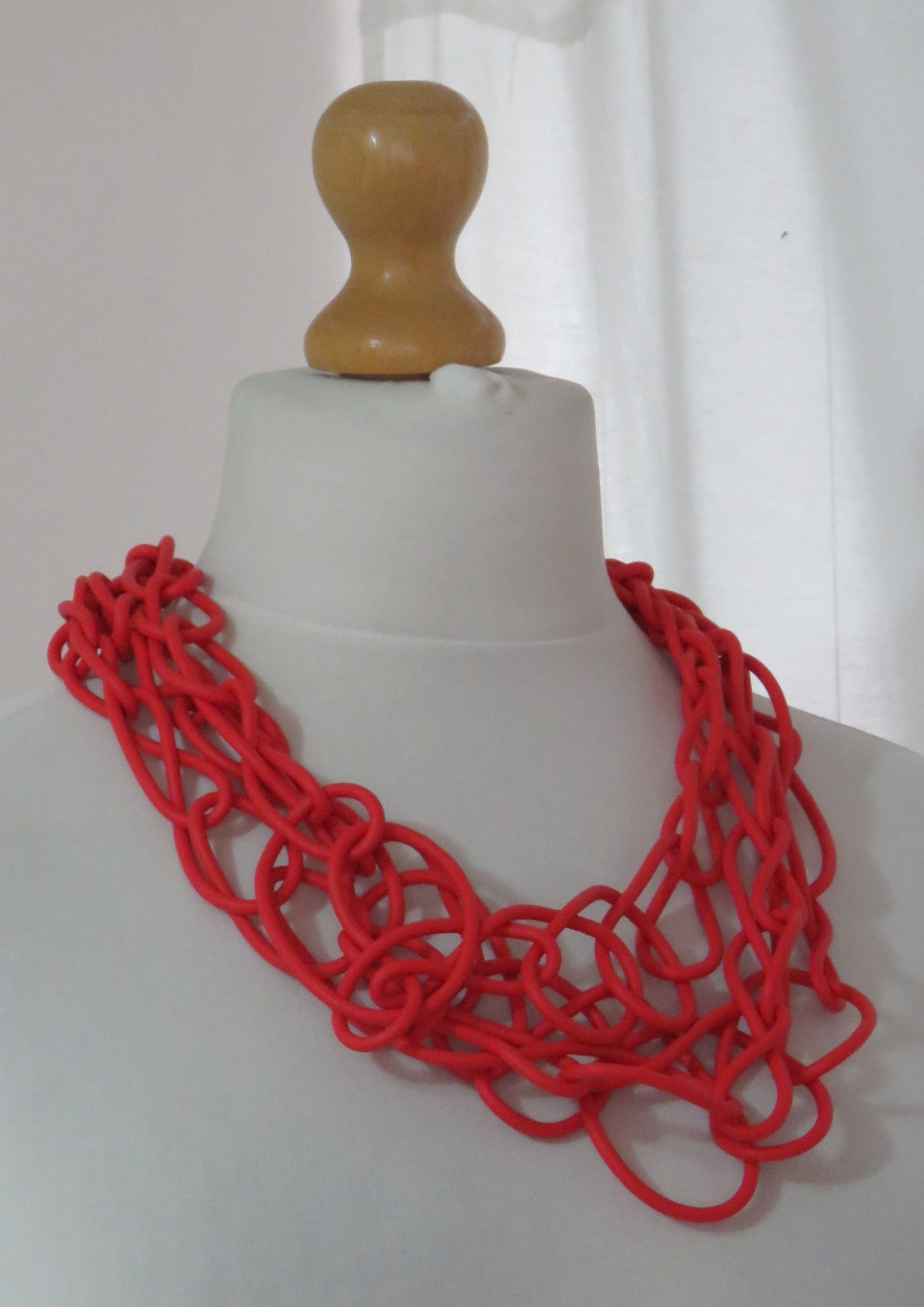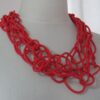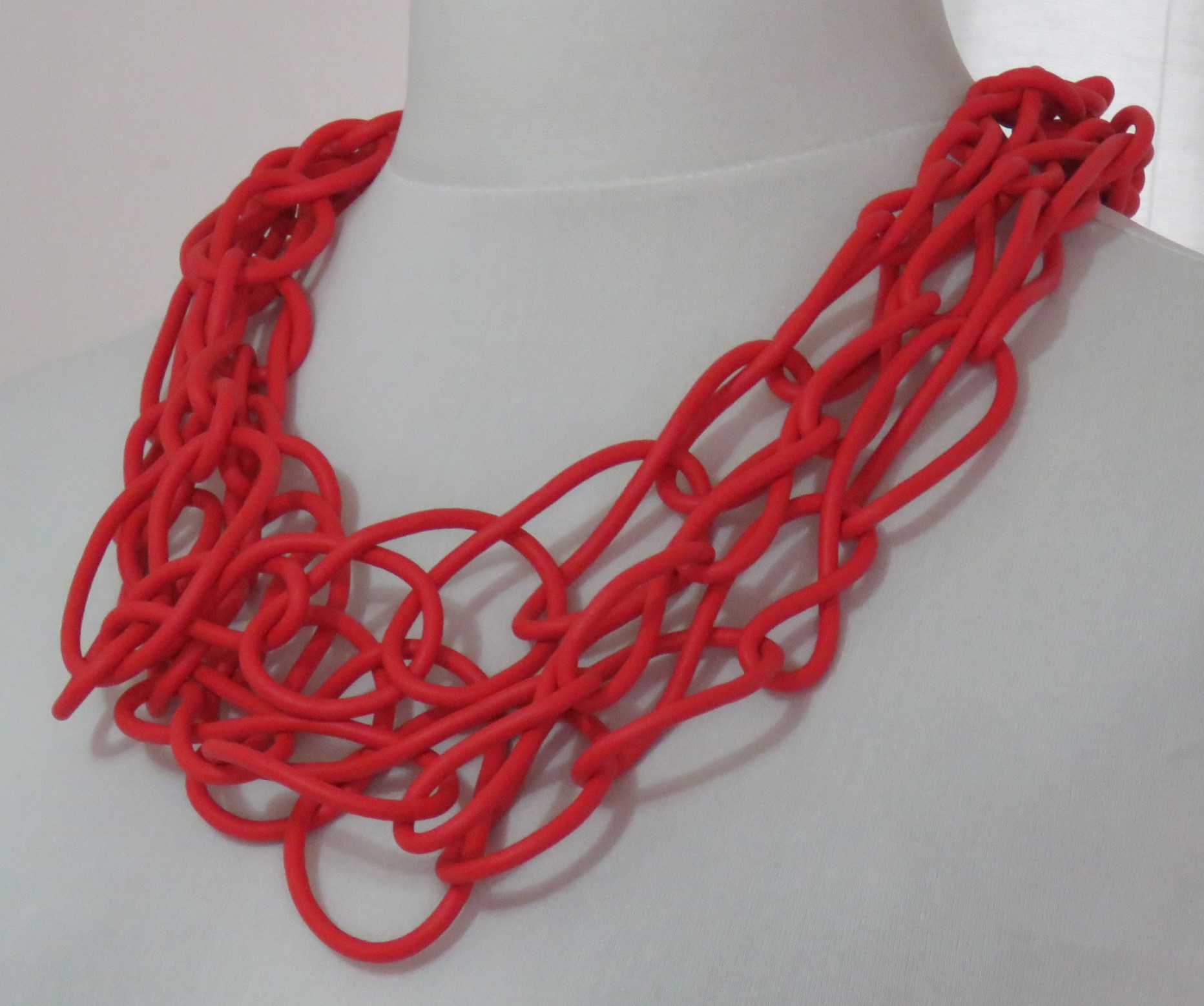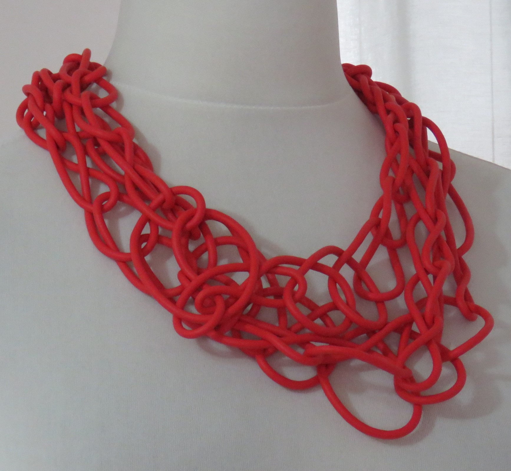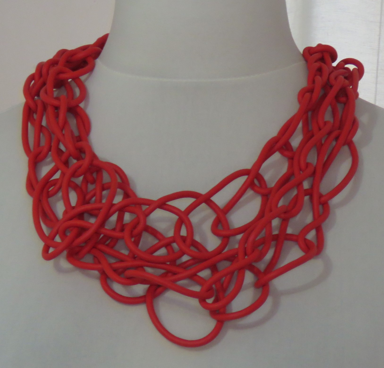 • Lagenlook statement necklace, made of 3 strands of irregular, red, rubber chain