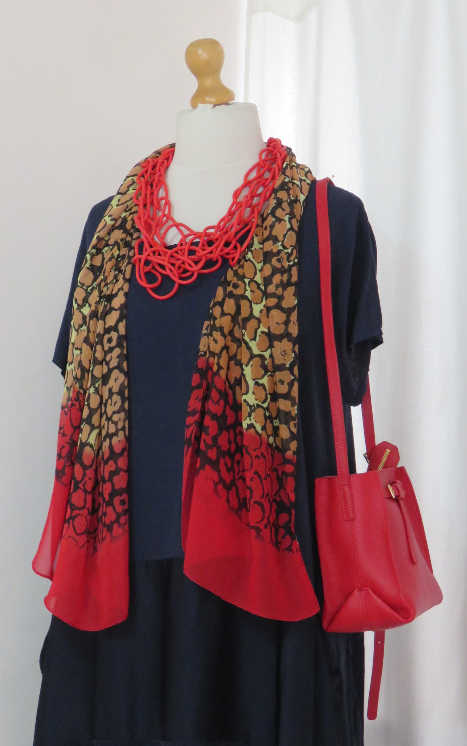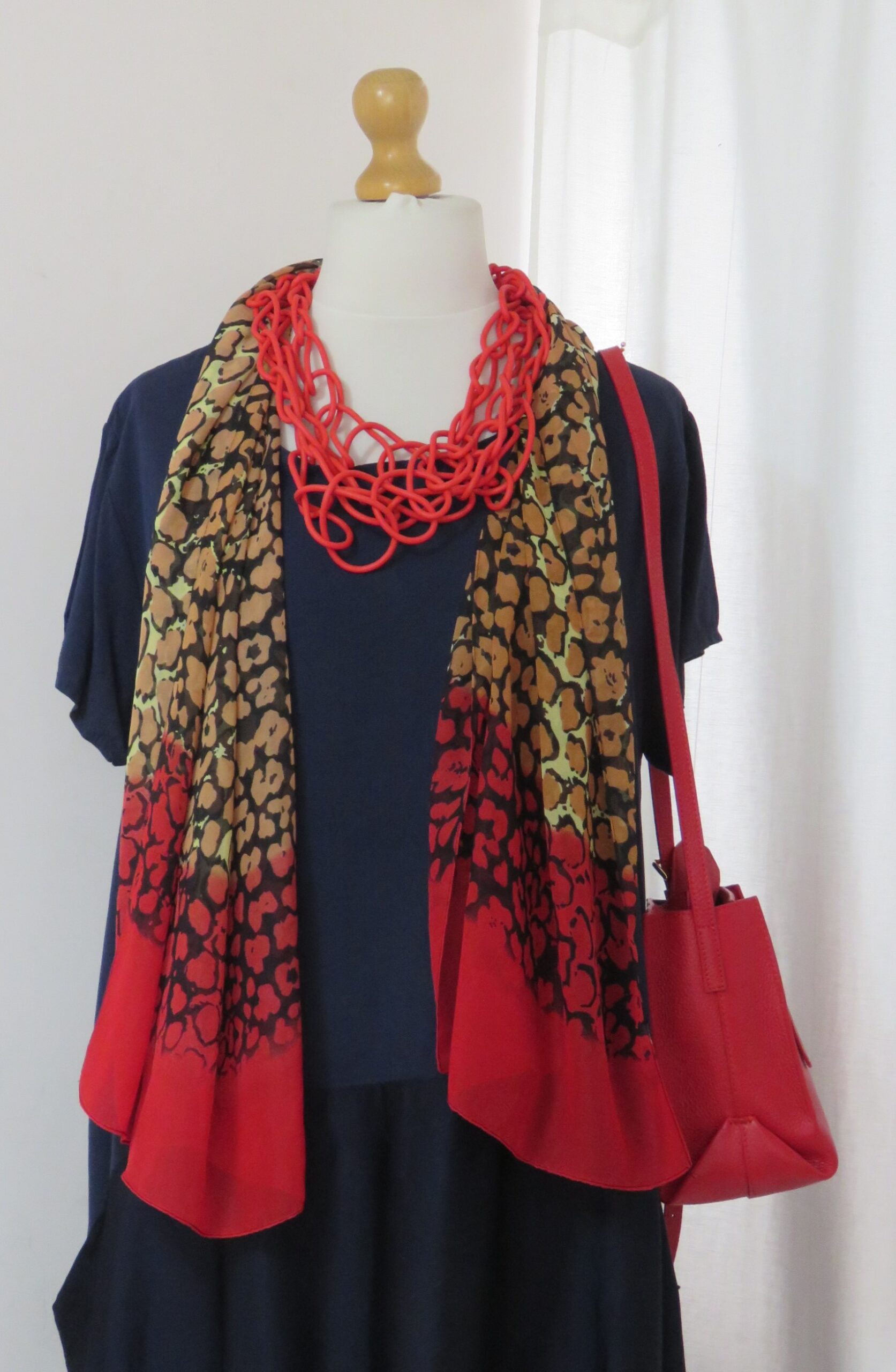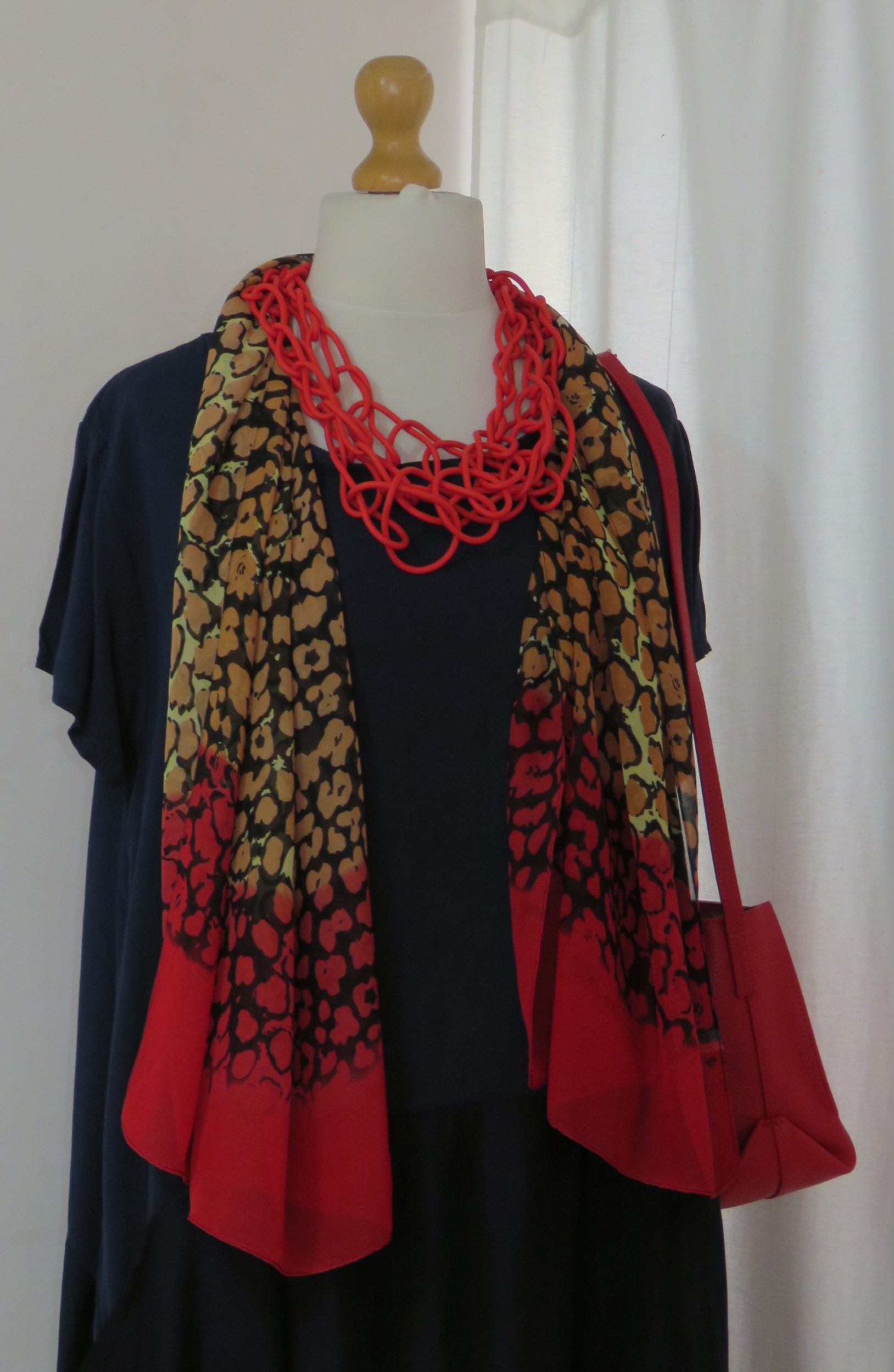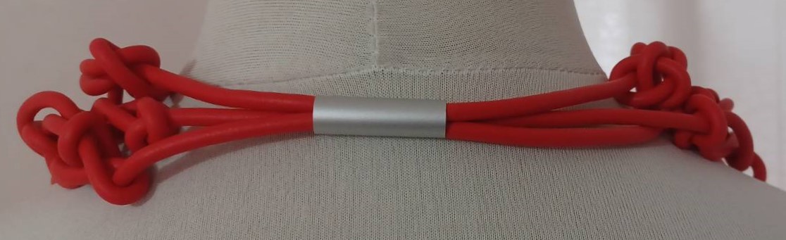 • Lagenlook statement necklace, made of 3 strands of irregular, red, rubber chain