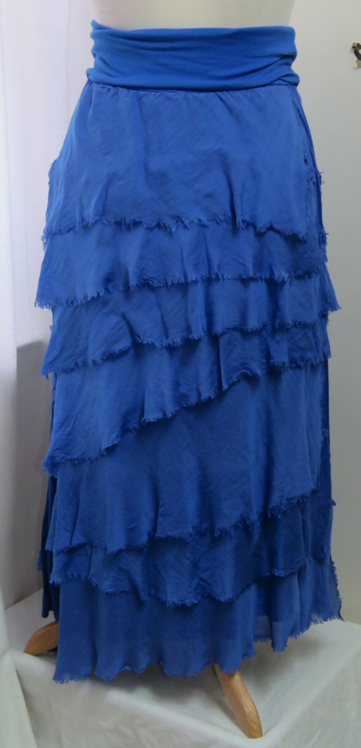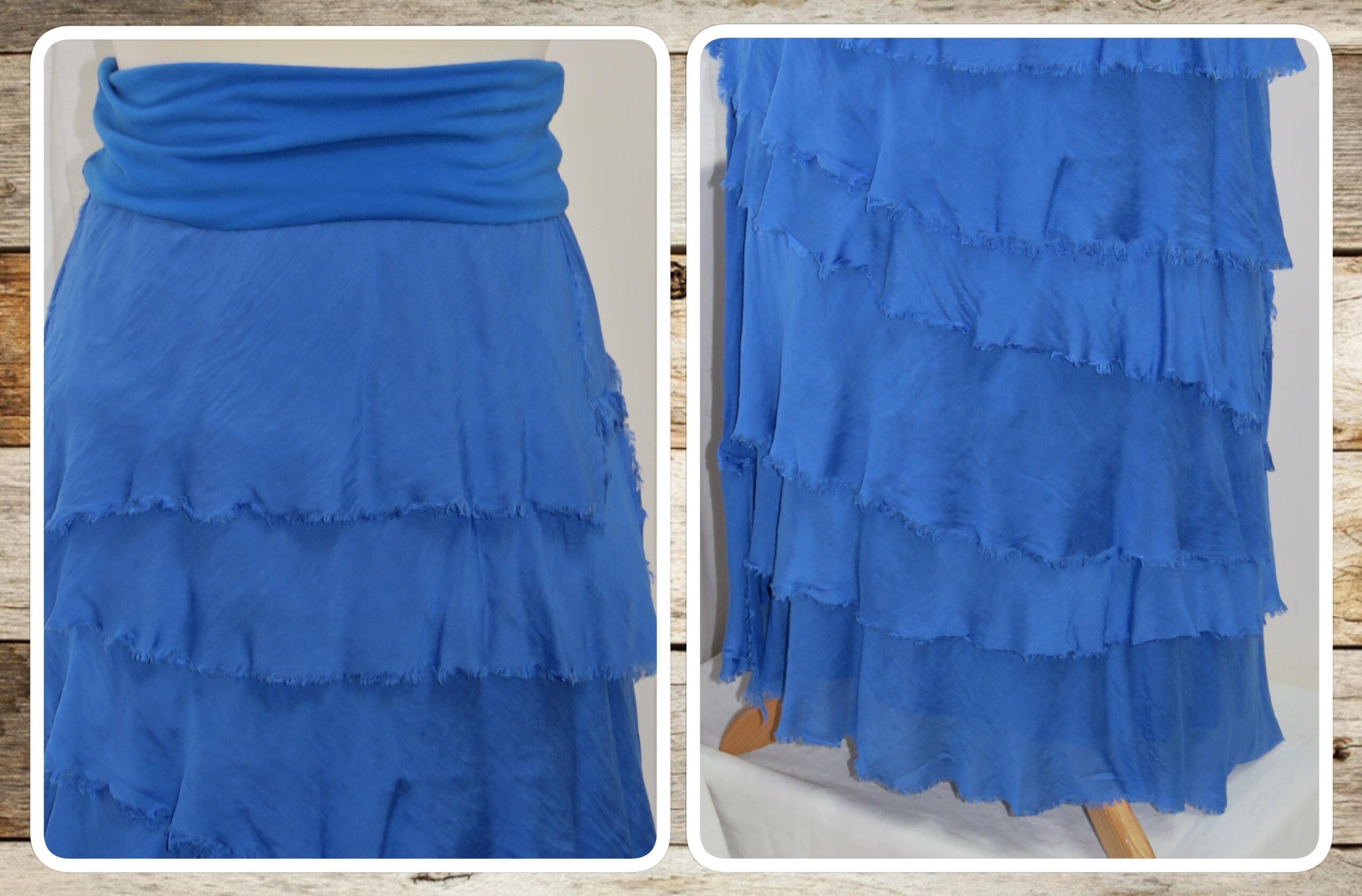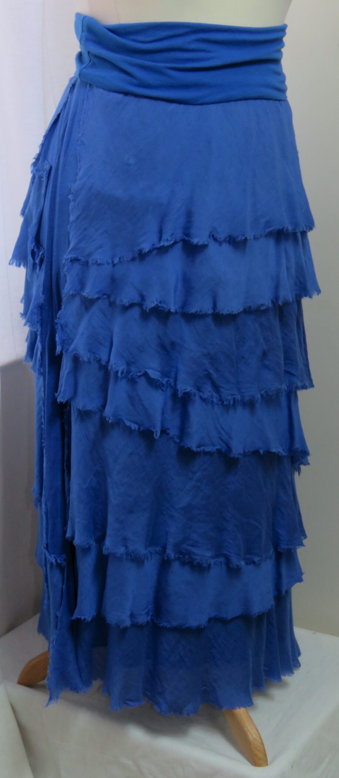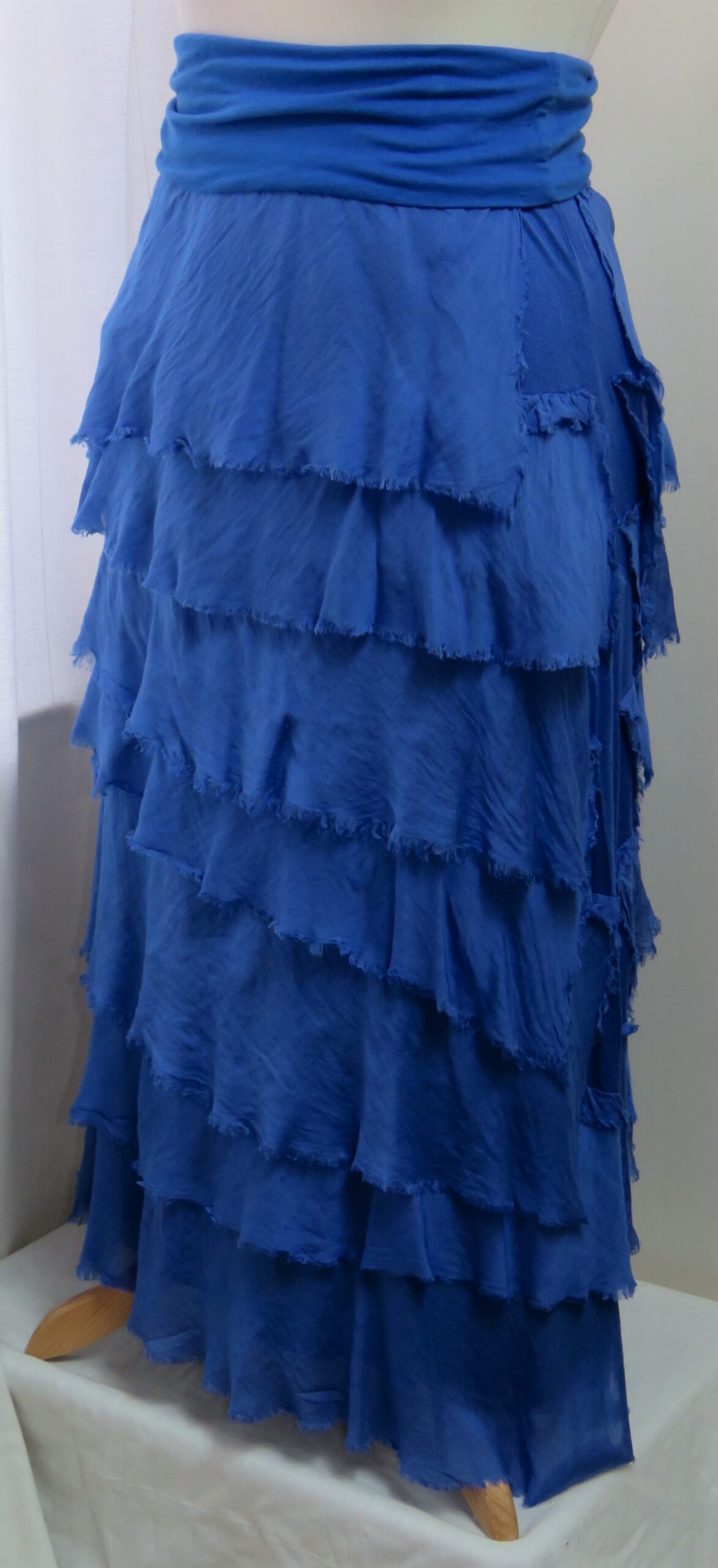 - Fine viscose jersey (95% viscose/5% elastane) with tiers of a silk-blend fabric sewn on asymmetrically back and front (40% cotton/30% viscose/30% silk) – these have a raw/frayed edge