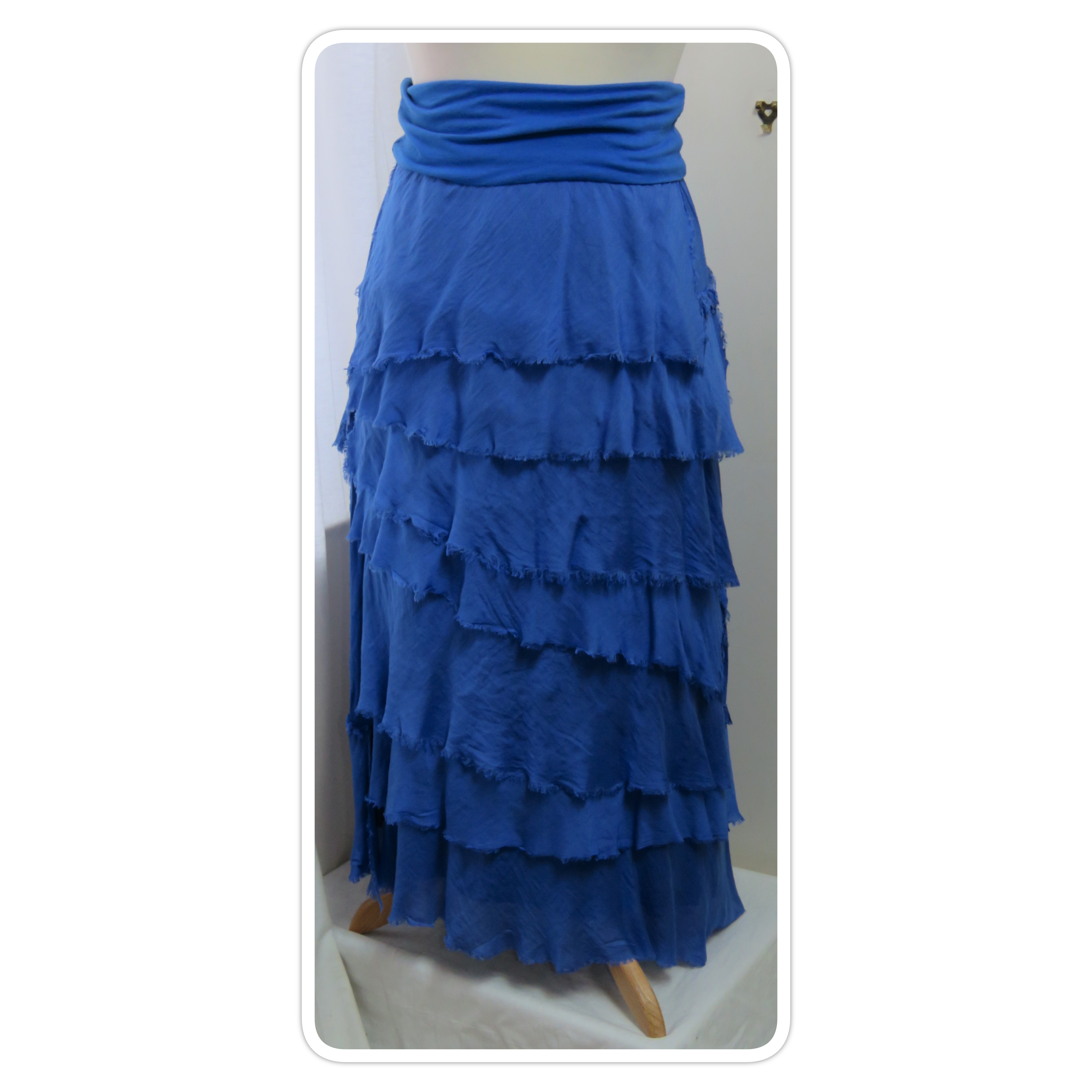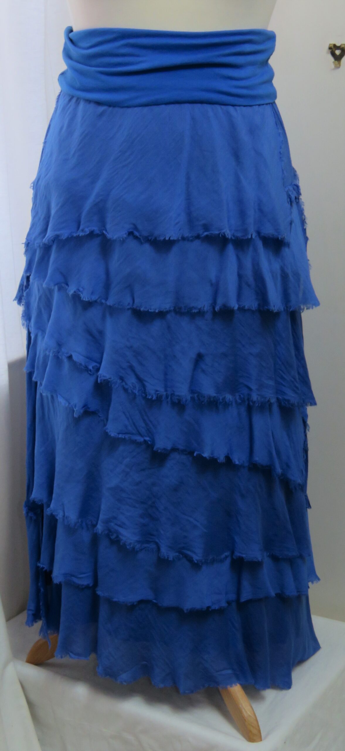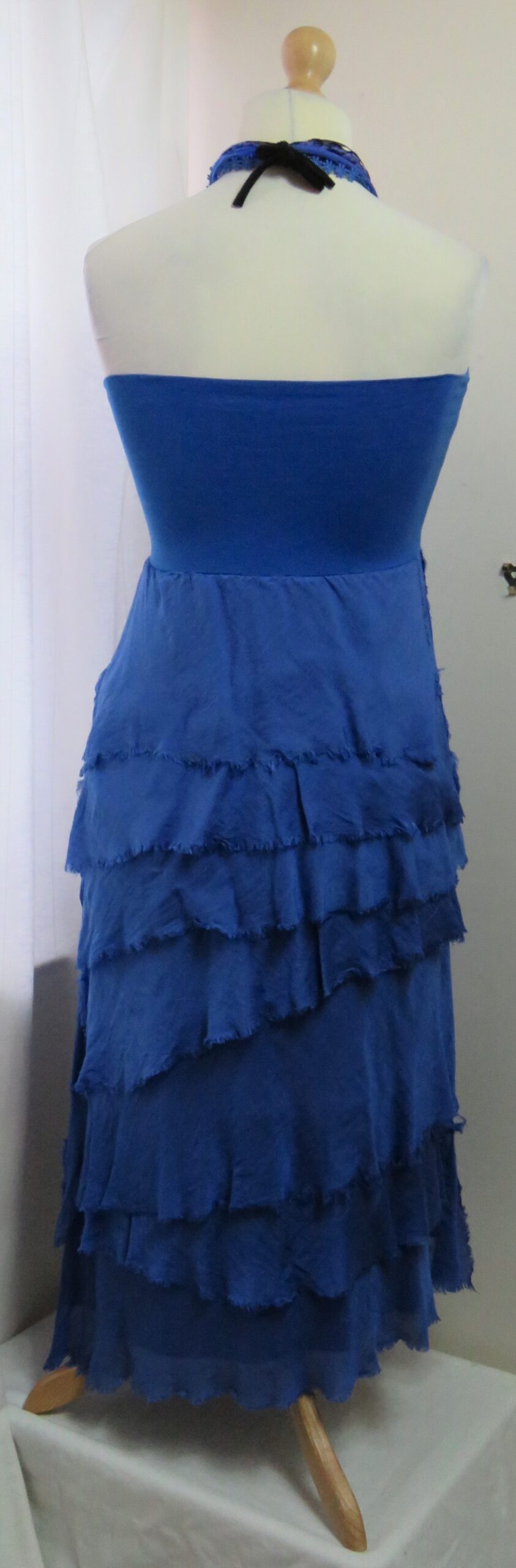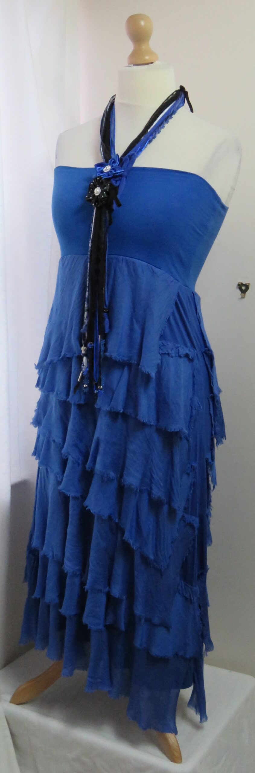 - Fine viscose jersey (95% viscose/5% elastane) with tiers of a silk-blend fabric sewn on asymmetrically back and front (40% cotton/30% viscose/30% silk) – these have a raw/frayed edge