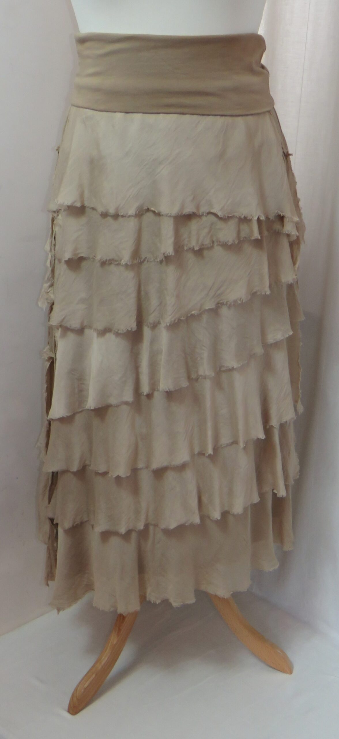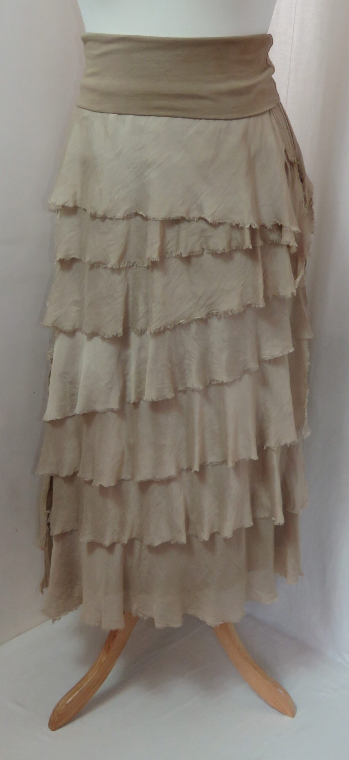 - Fine viscose jersey (95% viscose/5% elastane) with tiers of a silk-blend fabric sewn on asymmetrically back and front (40% cotton/30% viscose/30% silk) – these have a raw/frayed edge