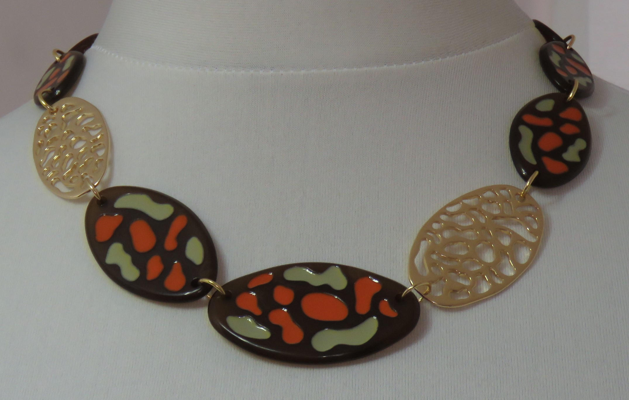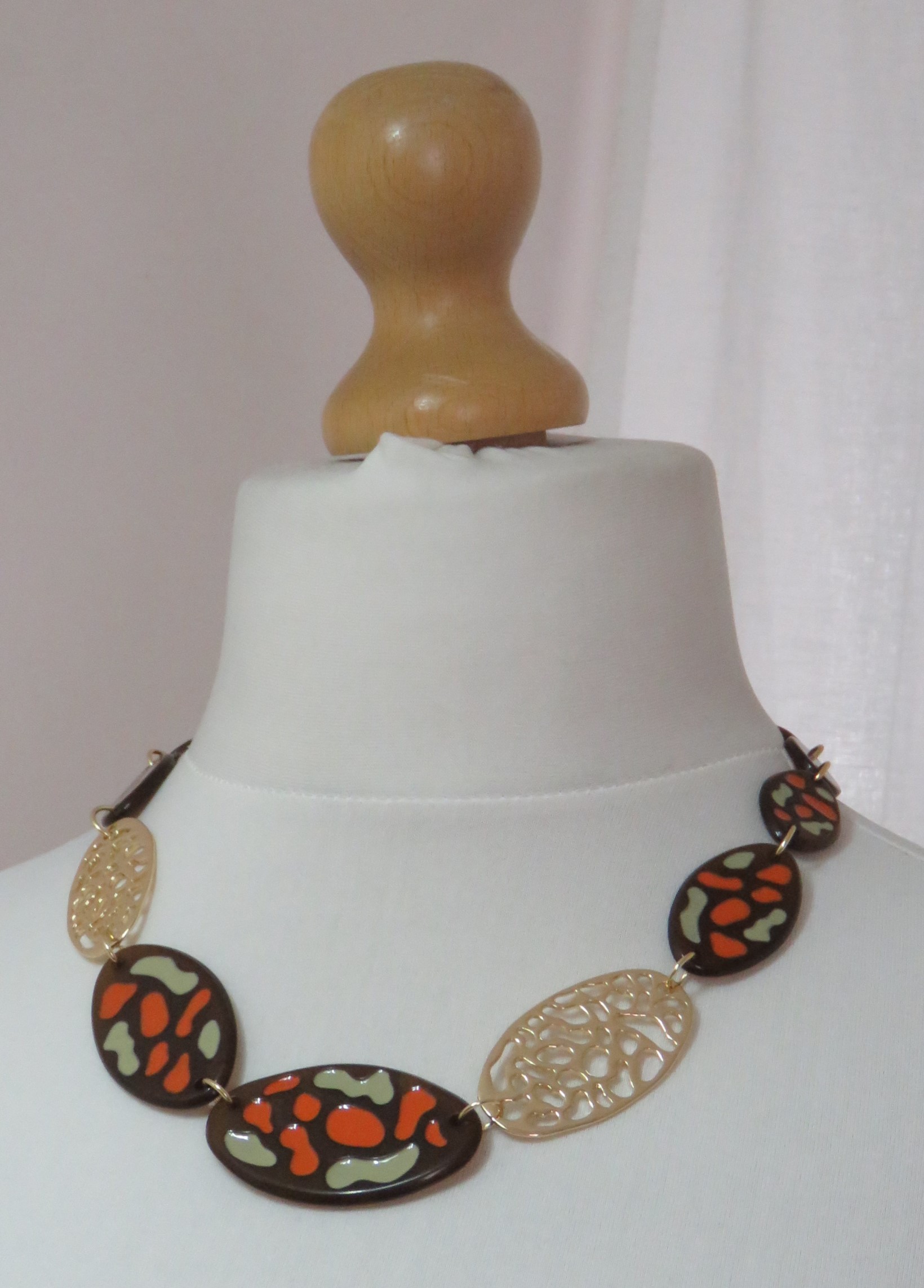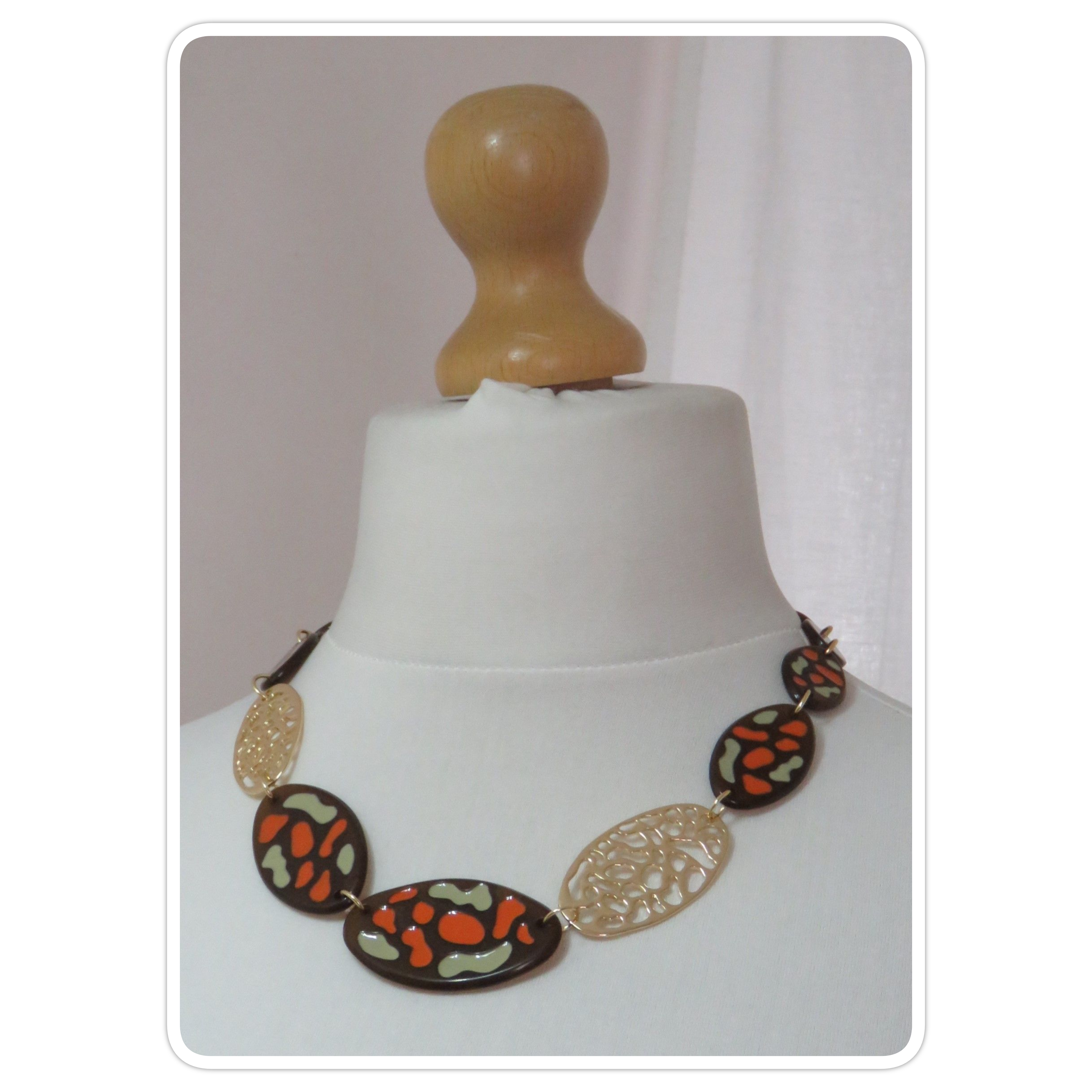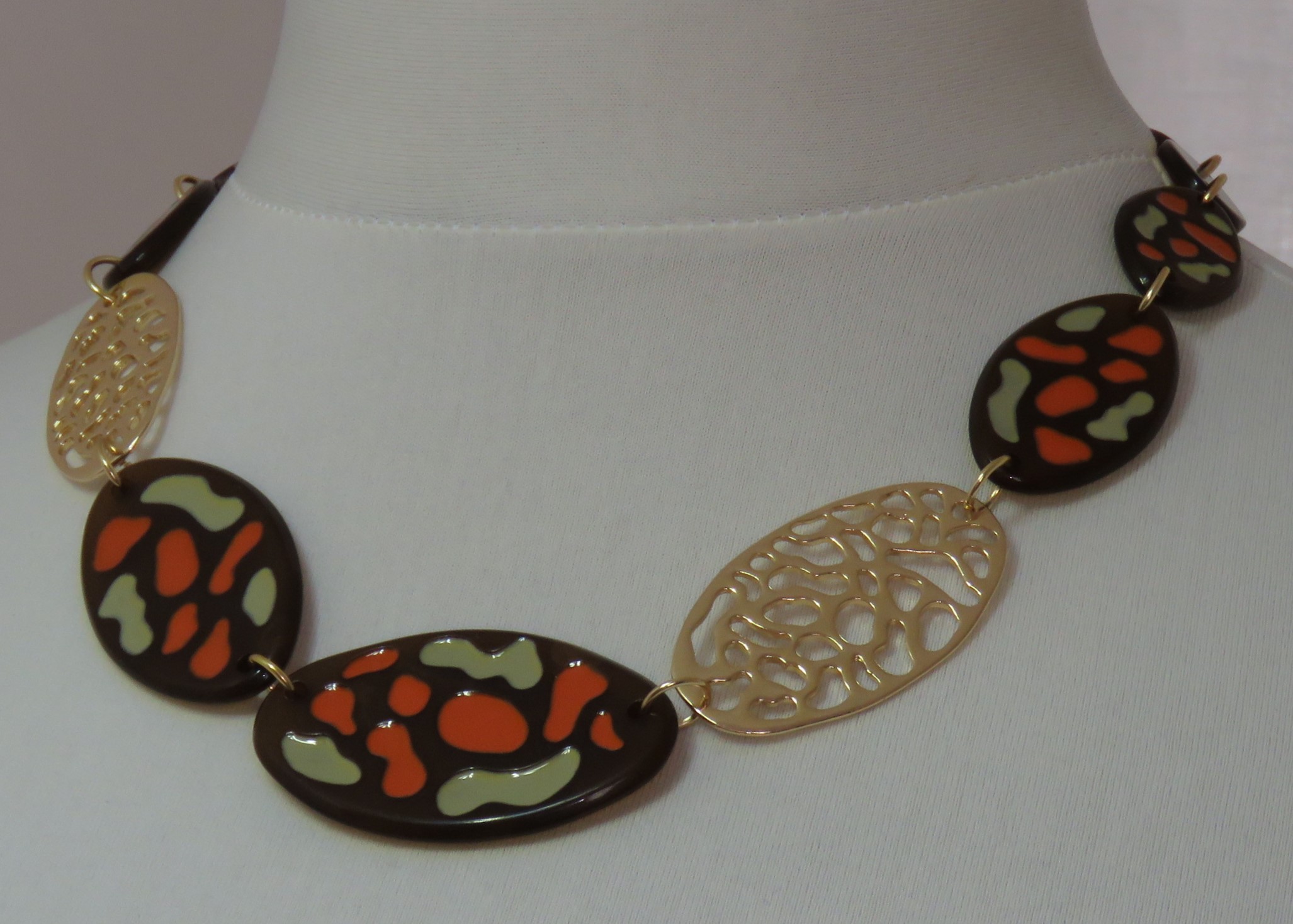 - Fabulous, Lagenlook, statement necklace, made of plain brown, resin beads; brown resin beads, with an orange & sage green, textured pattern, and gold-coloured, filigree metal beads