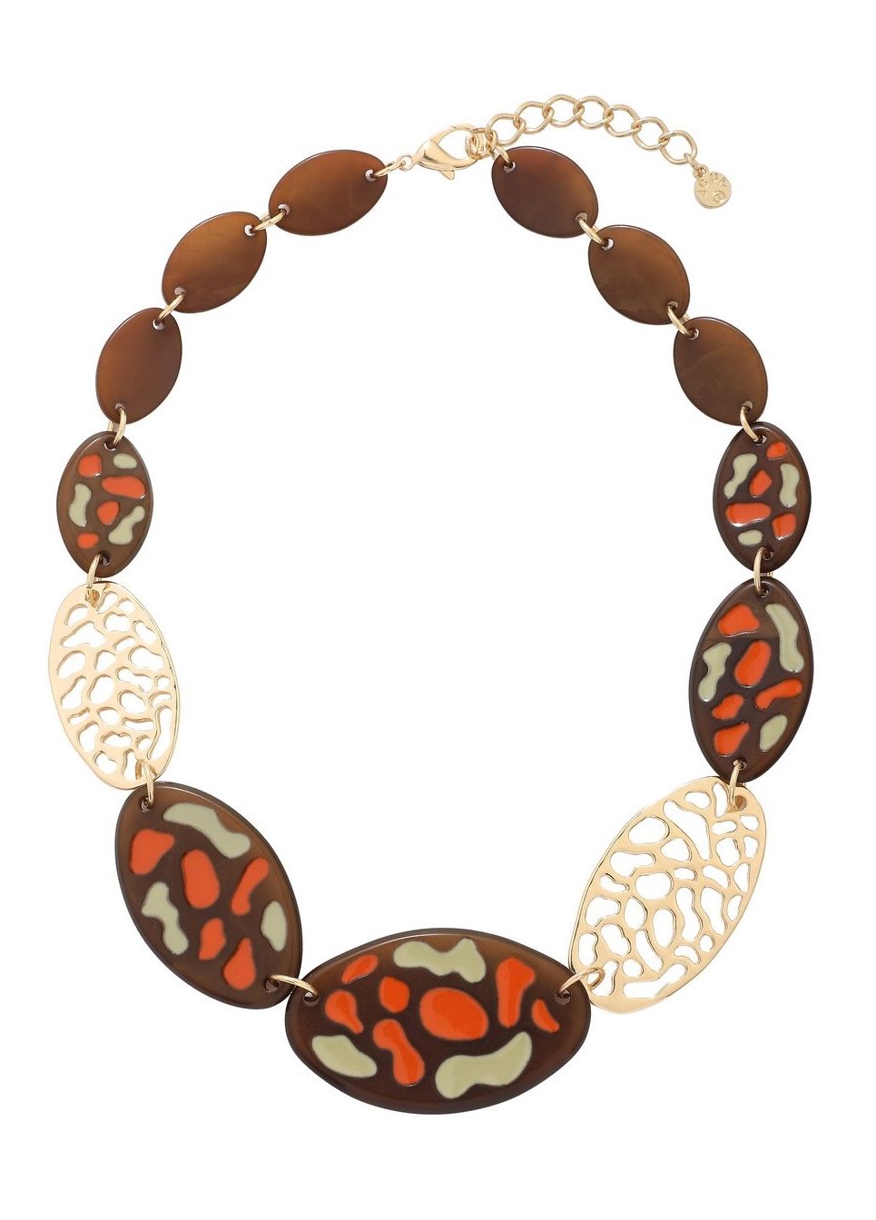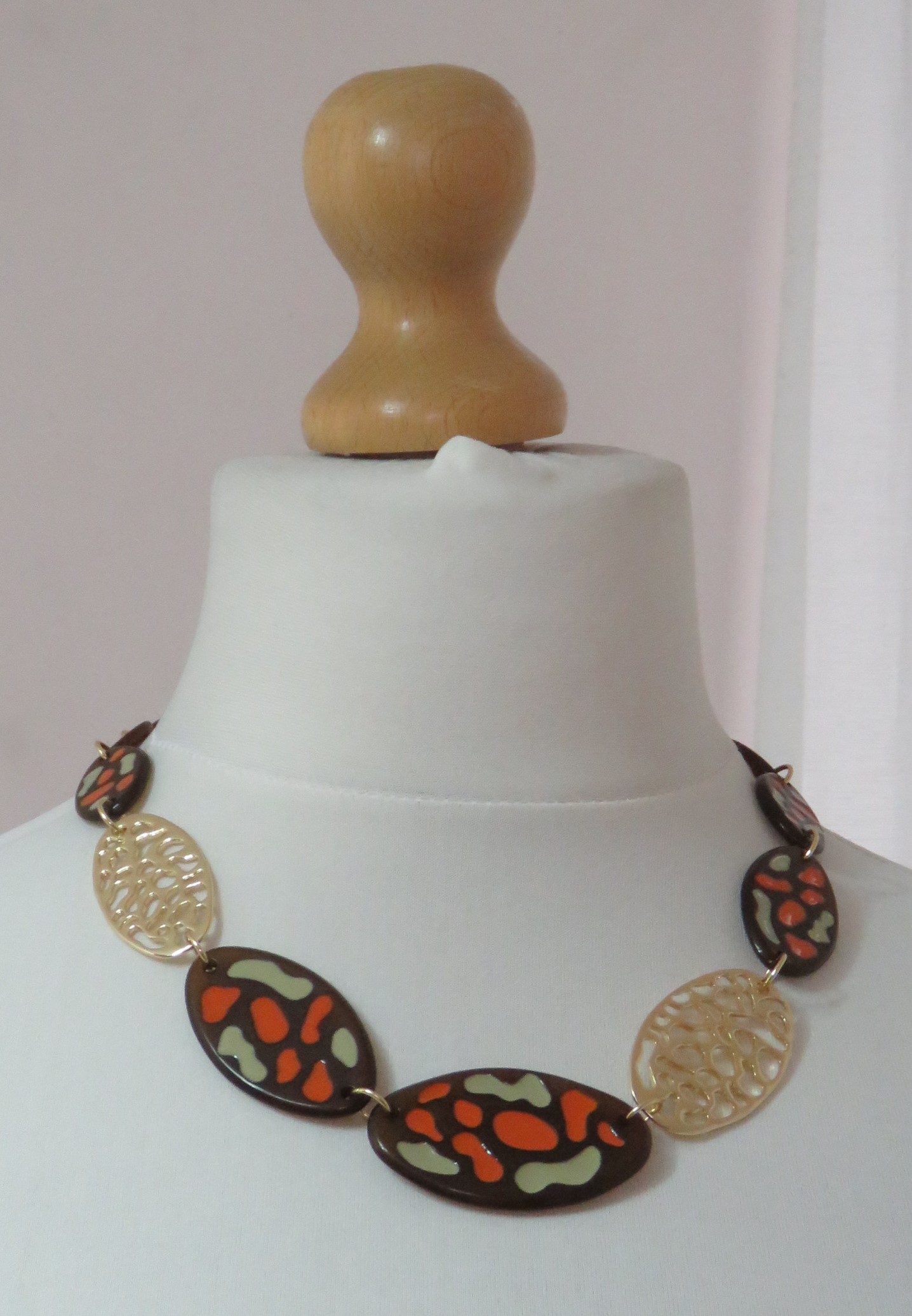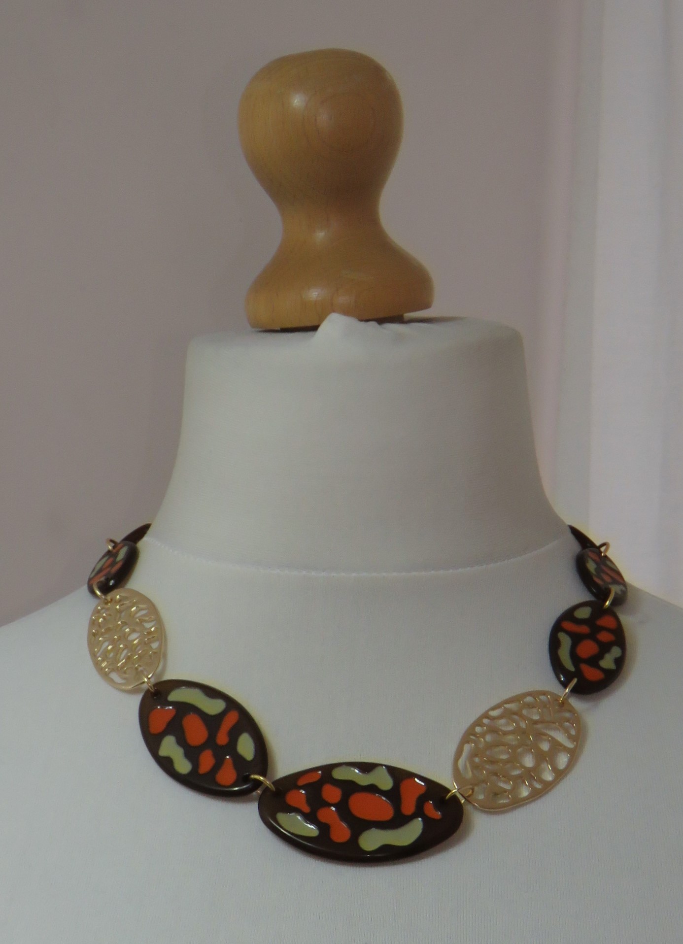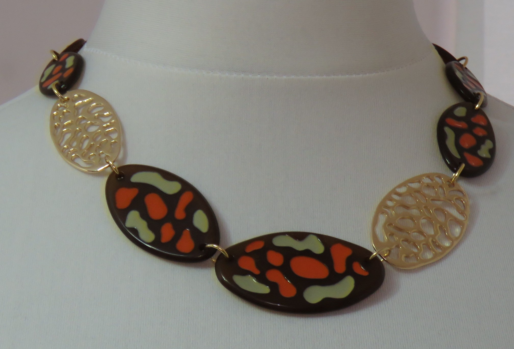 - Fabulous, Lagenlook, statement necklace, made of plain brown, resin beads; brown resin beads, with an orange & sage green, textured pattern, and gold-coloured, filigree metal beads