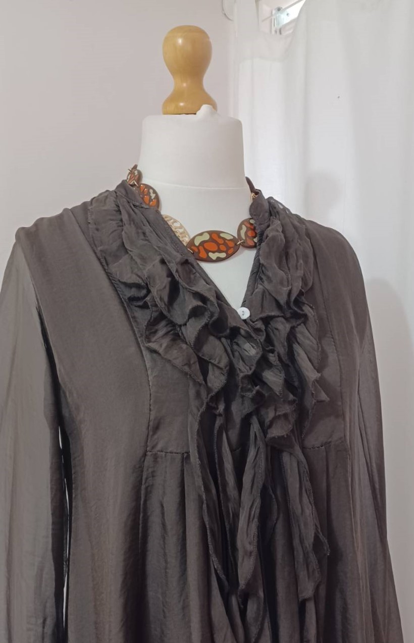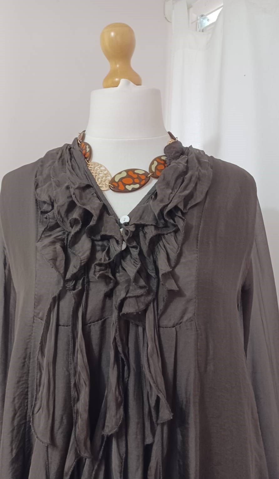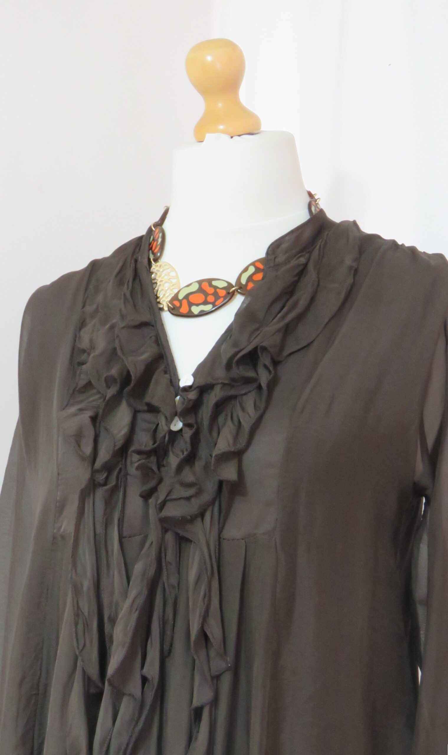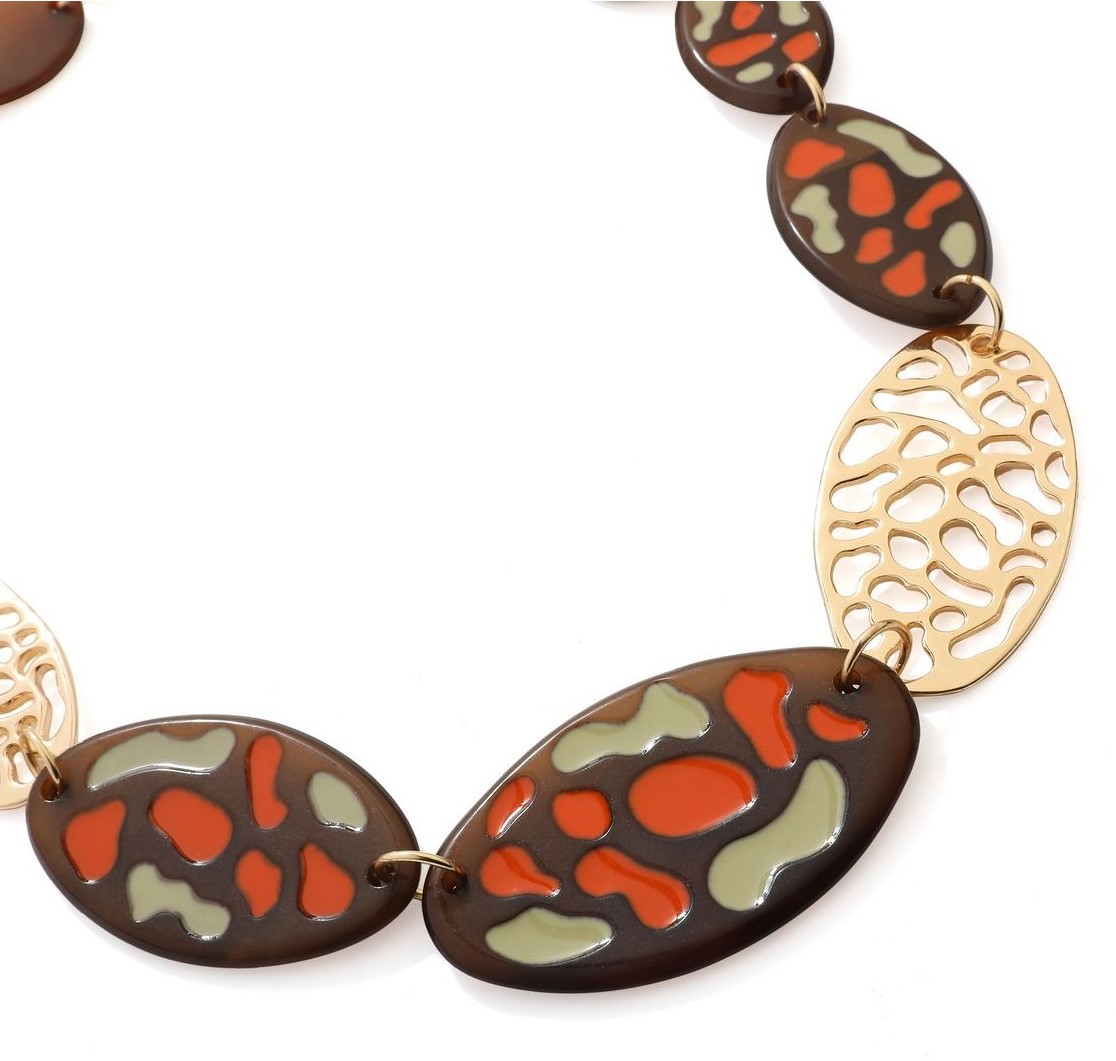- Fabulous, Lagenlook, statement necklace, made of plain brown, resin beads; brown resin beads, with an orange & sage green, textured pattern, and gold-coloured, filigree metal beads