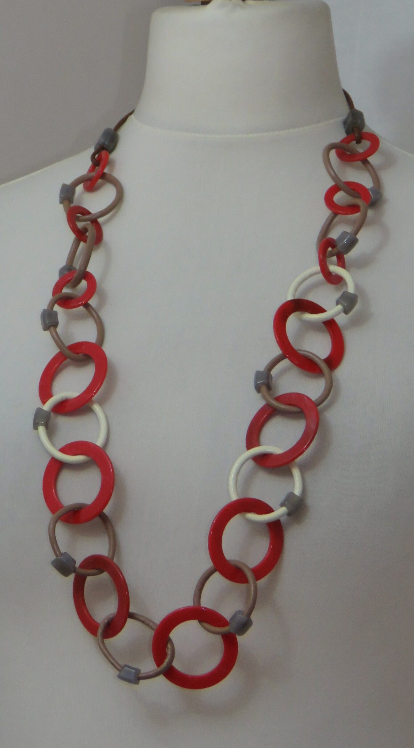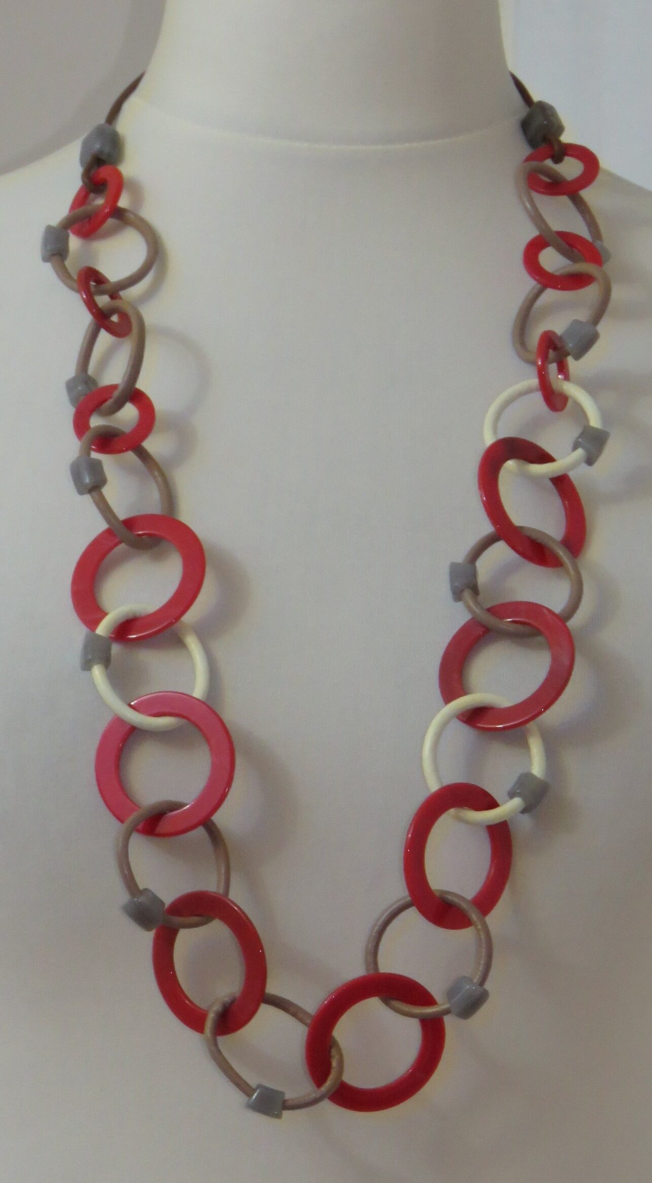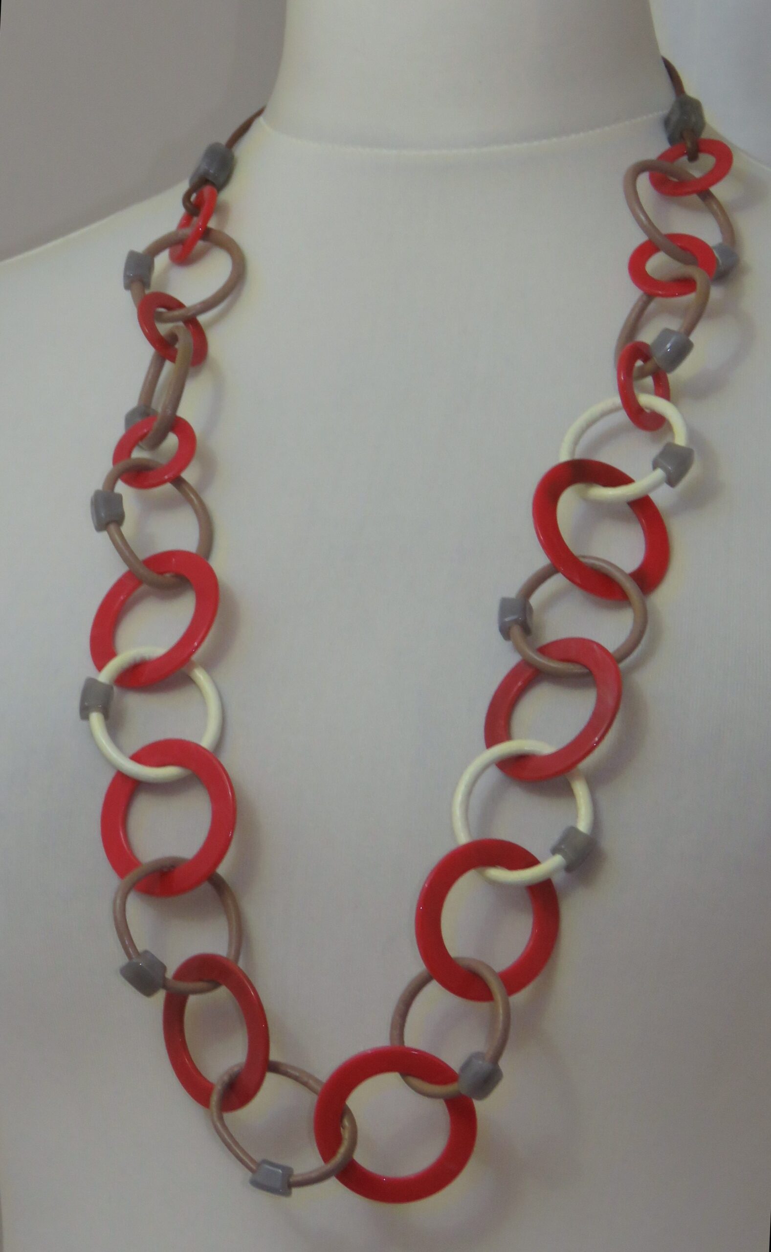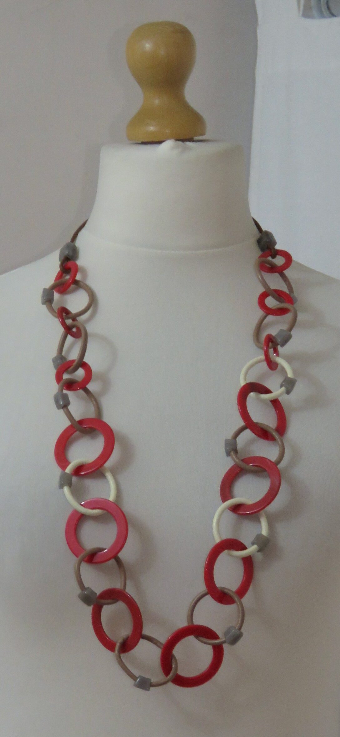 - Statement necklace, made of red, marble-effect resin links and waxed-leather, cream and taupe ones, suspended on a brown, waxed-leather cord