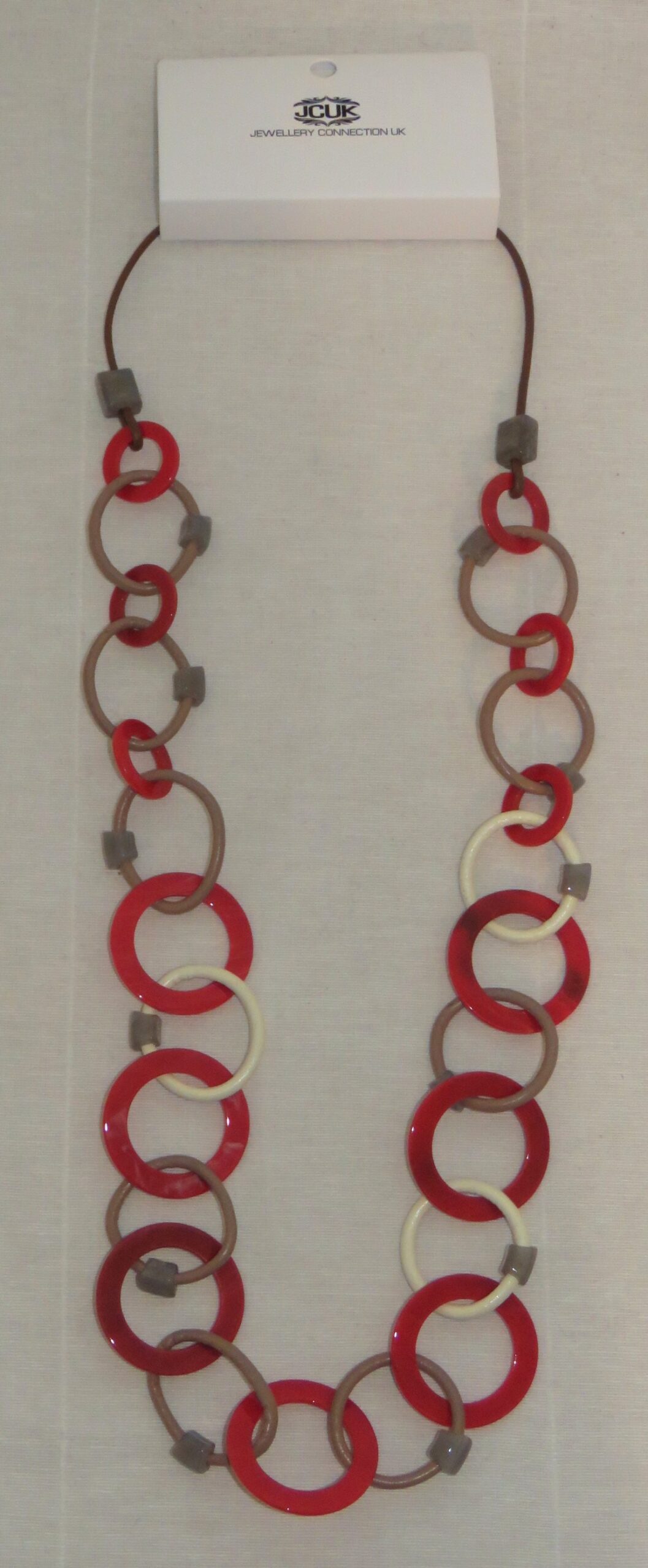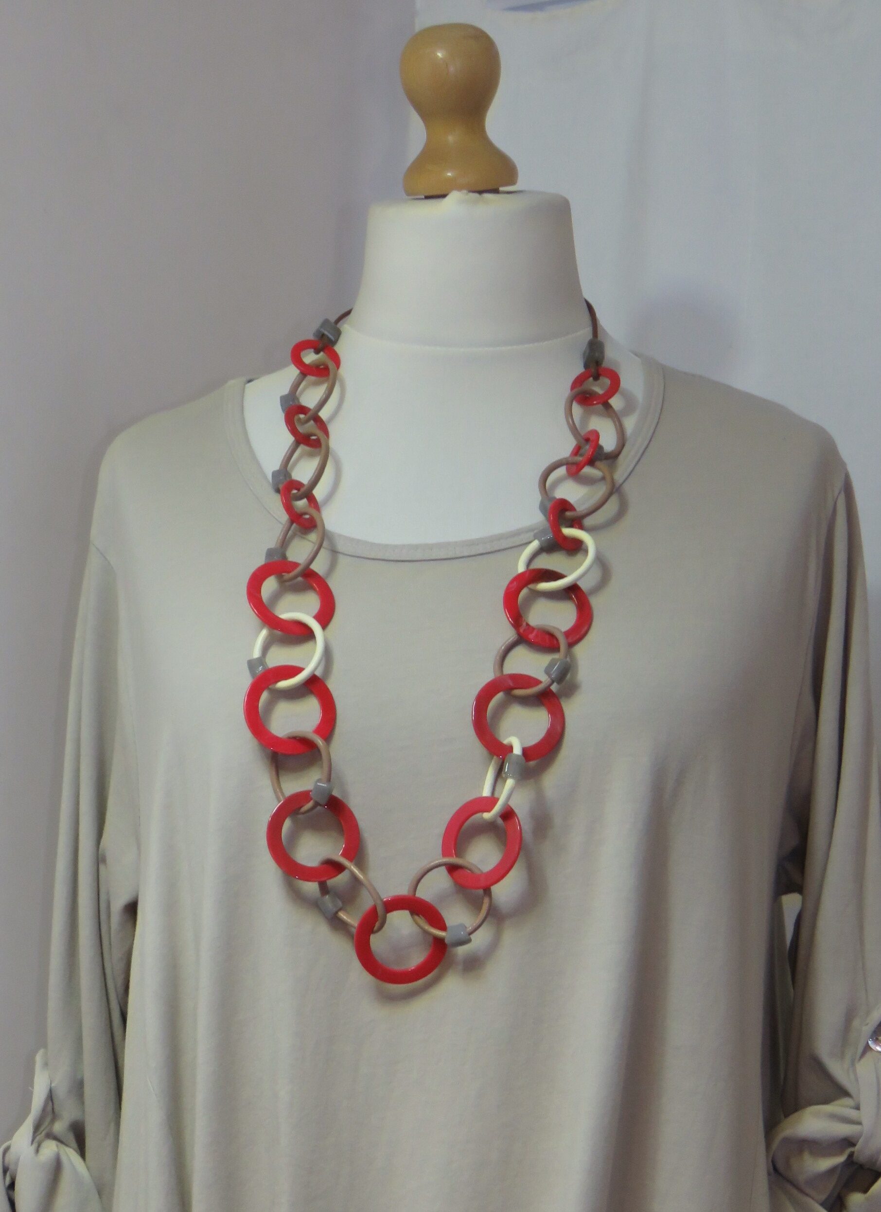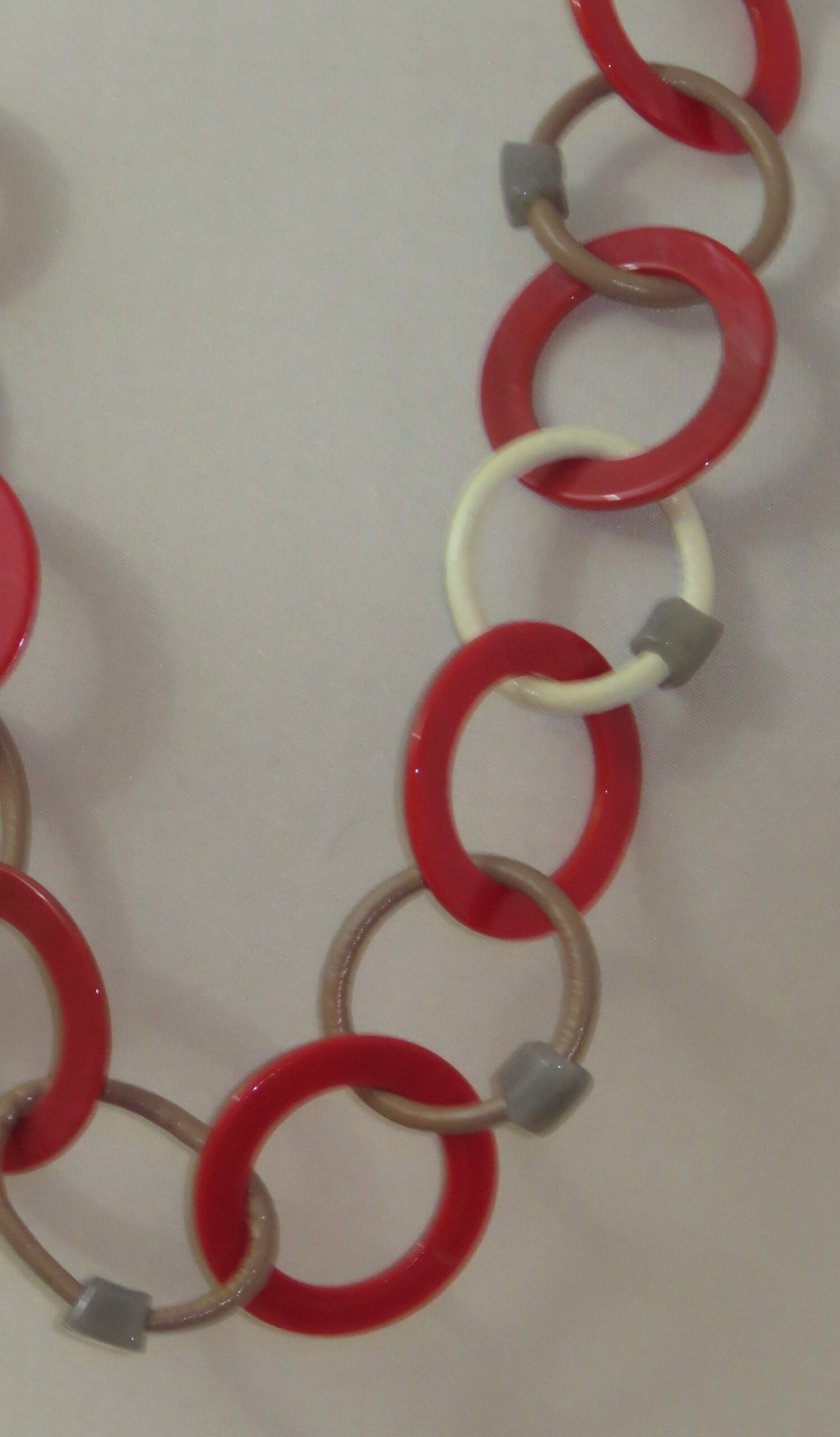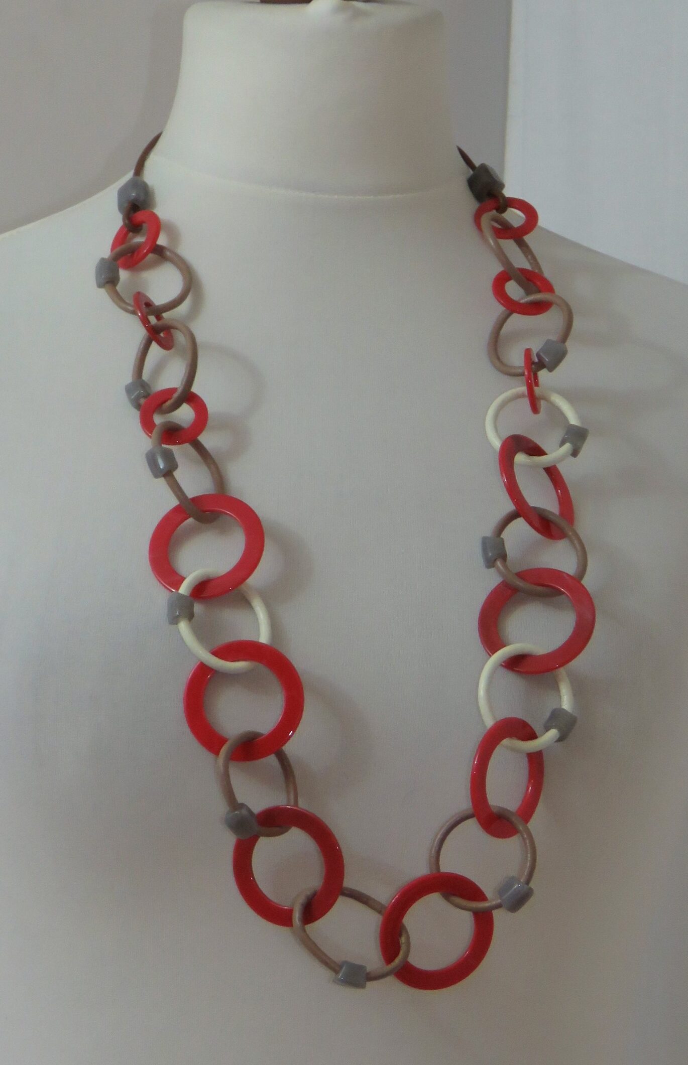 - Statement necklace, made of red, marble-effect resin links and waxed-leather, cream and taupe ones, suspended on a brown, waxed-leather cord