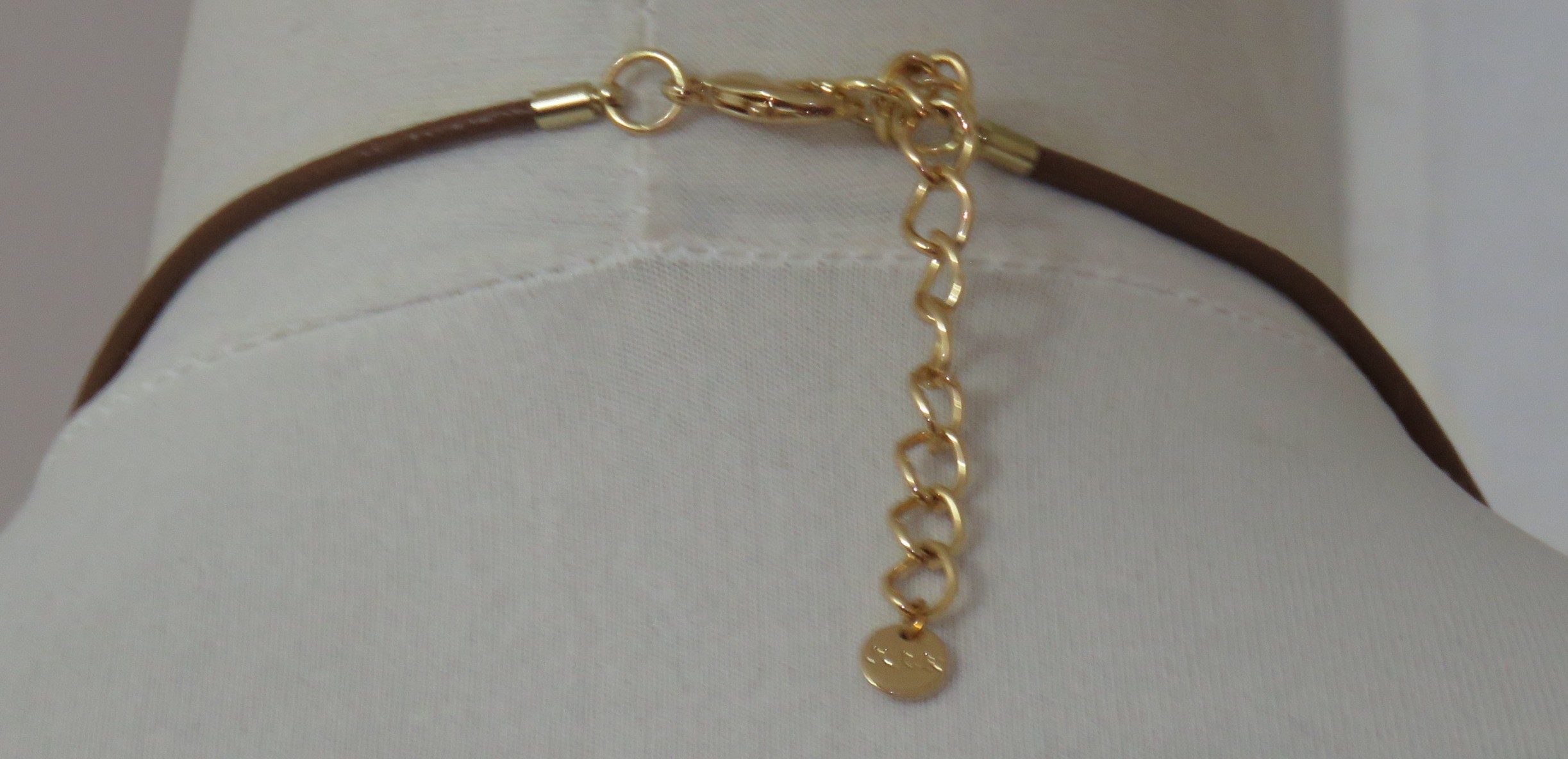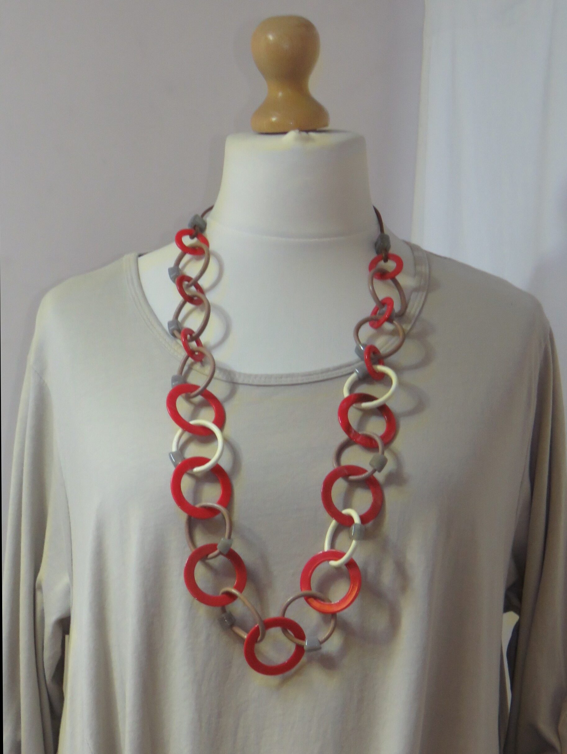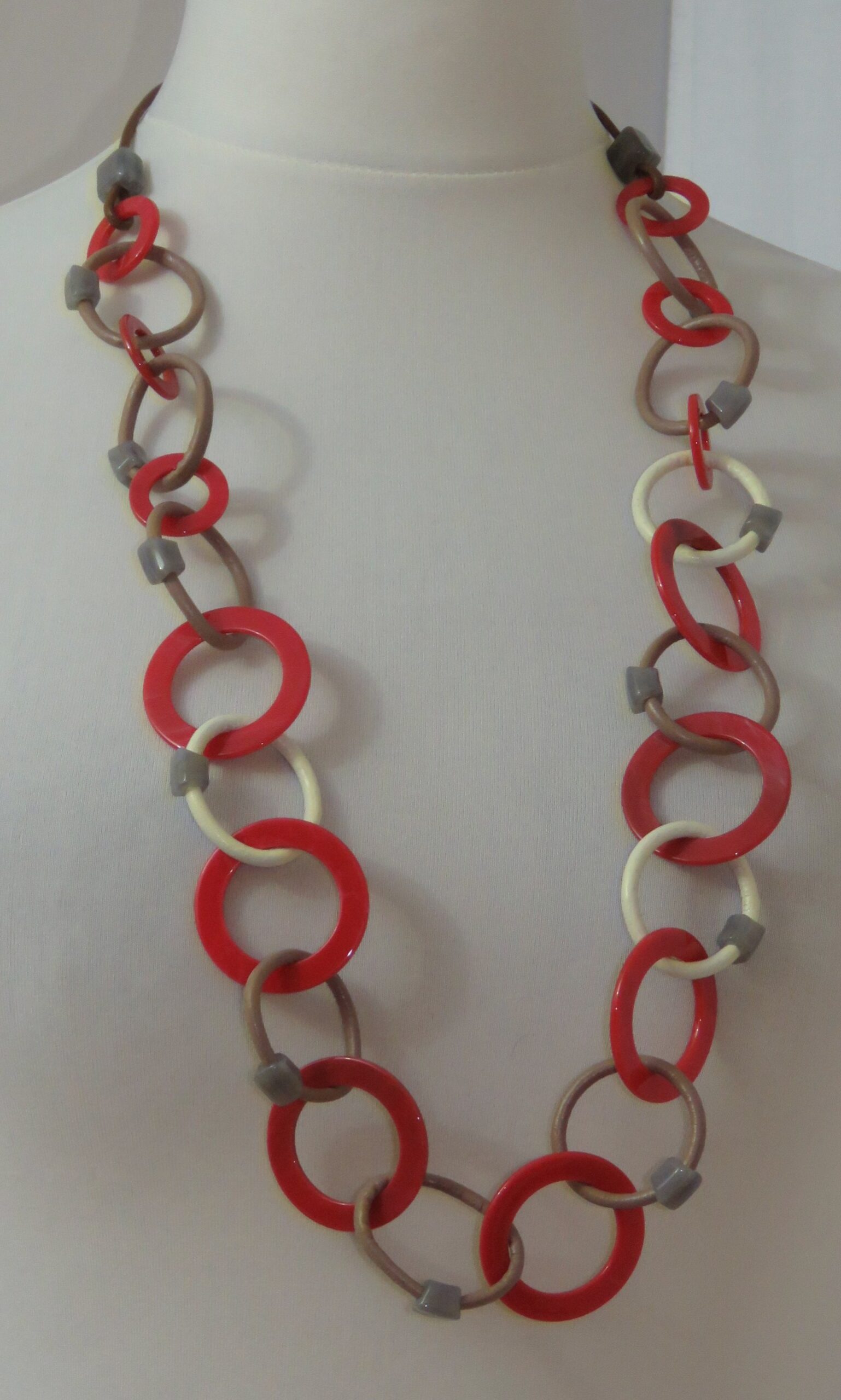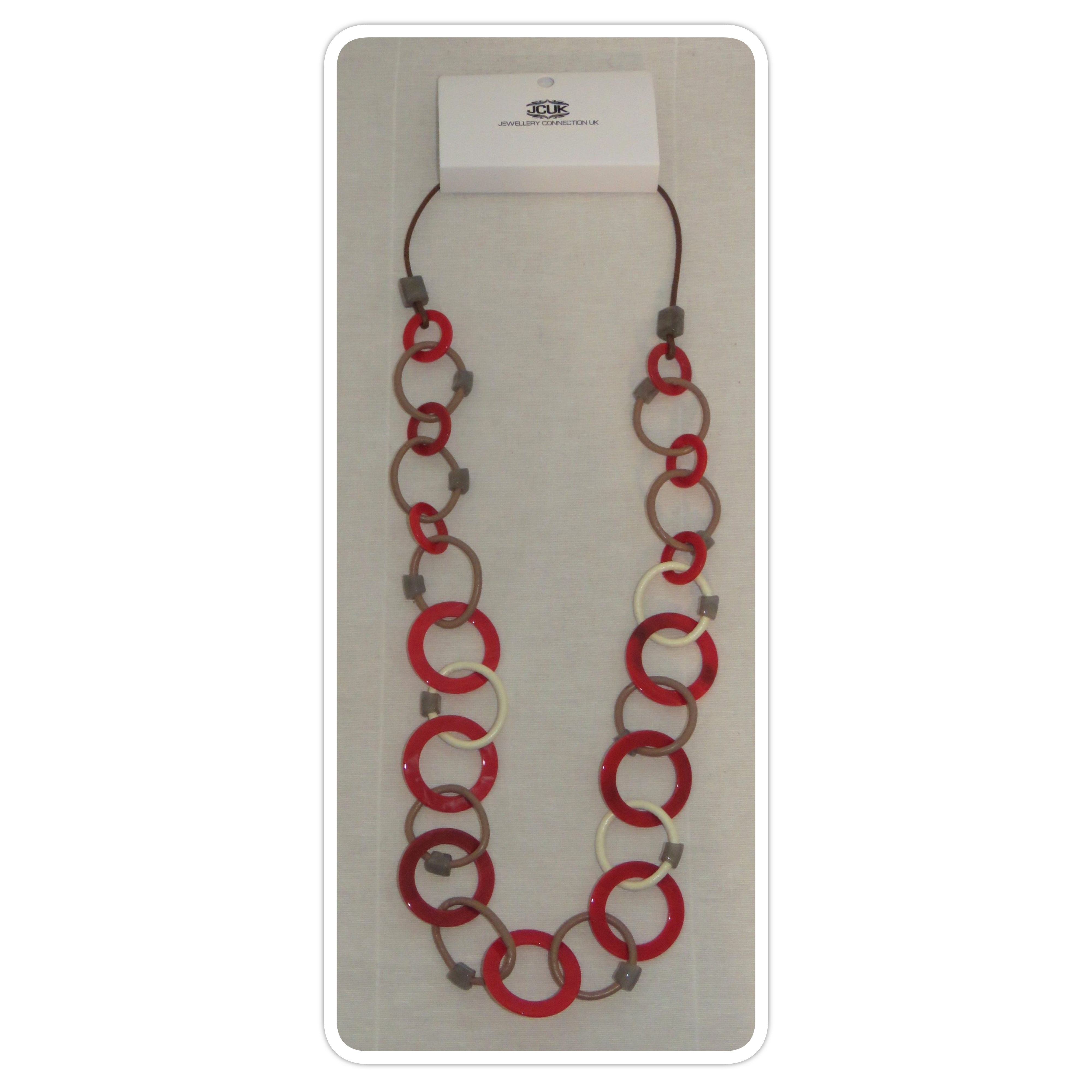- Statement necklace, made of red, marble-effect resin links and waxed-leather, cream and taupe ones, suspended on a brown, waxed-leather cord