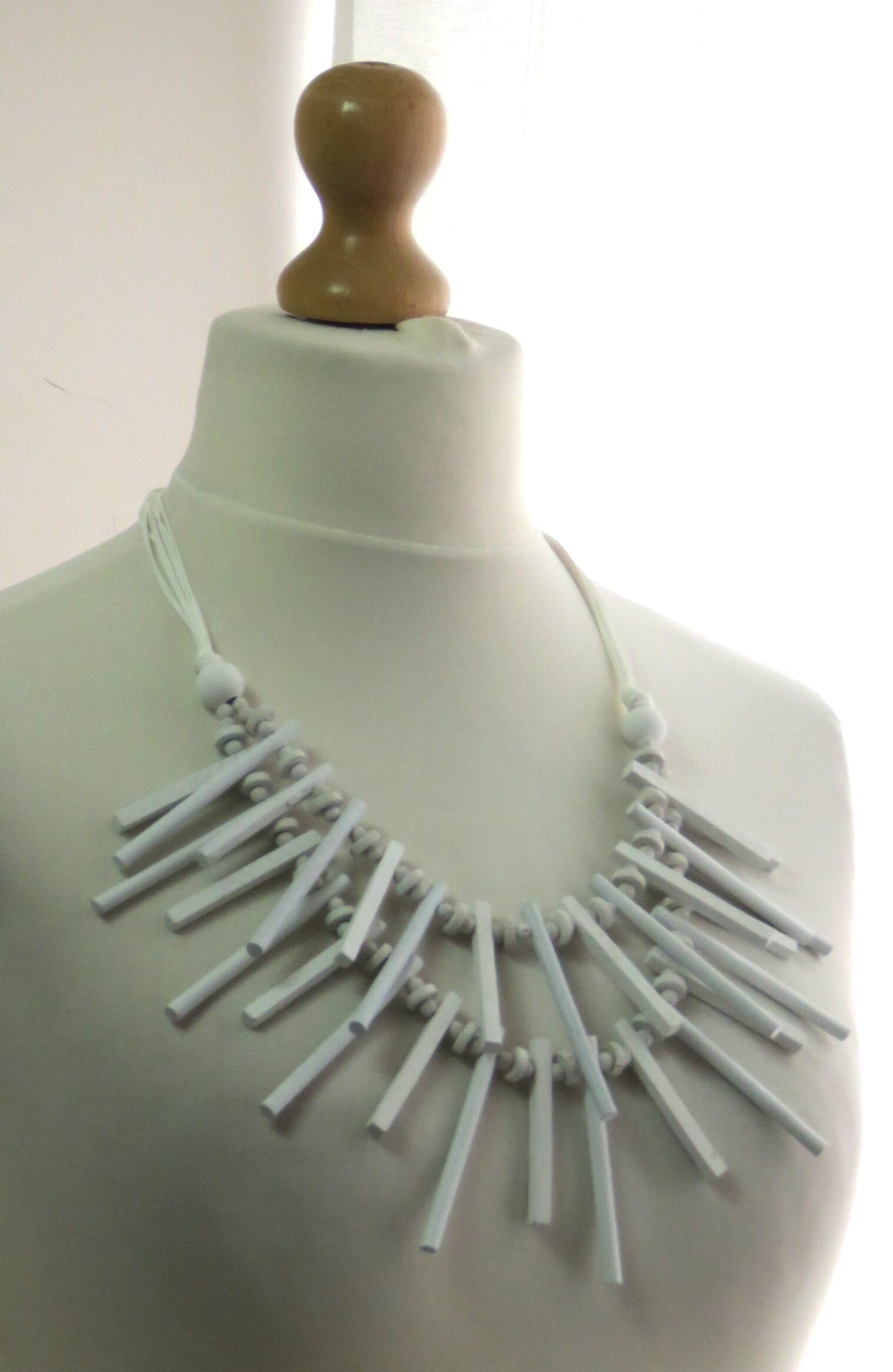 • Lagenlook, statement necklace, made of multiple strands of white, waxed cord, threaded with a double layer of white, wooden, rectangular and cylindrical sticks and white wooden beads