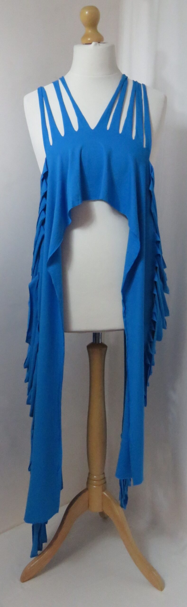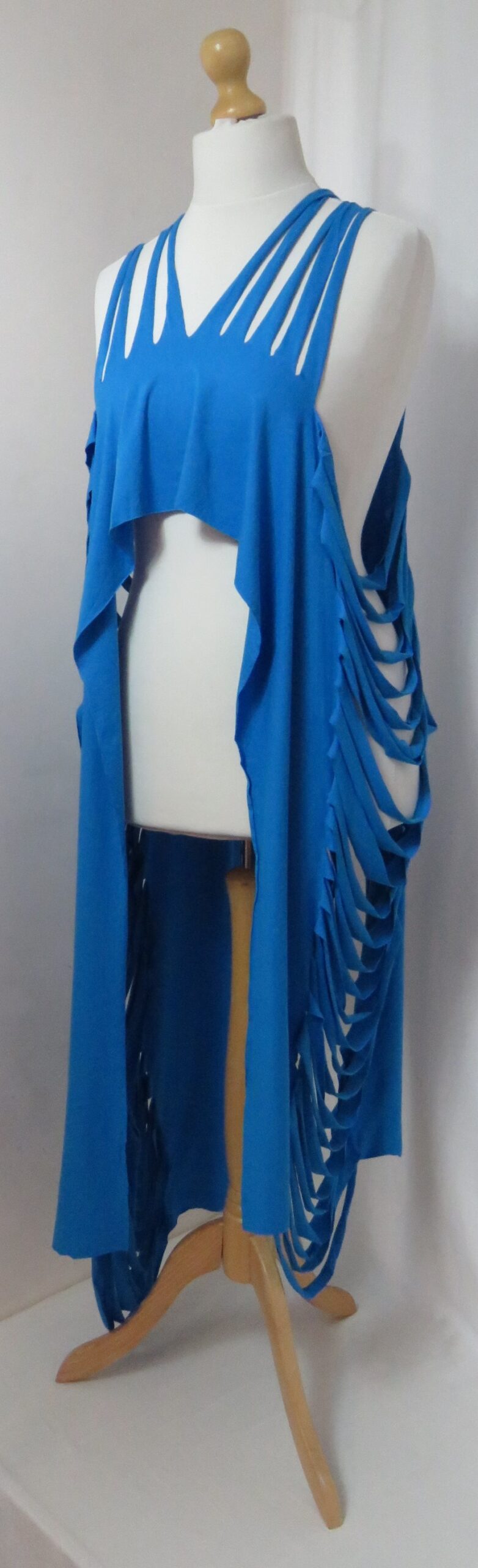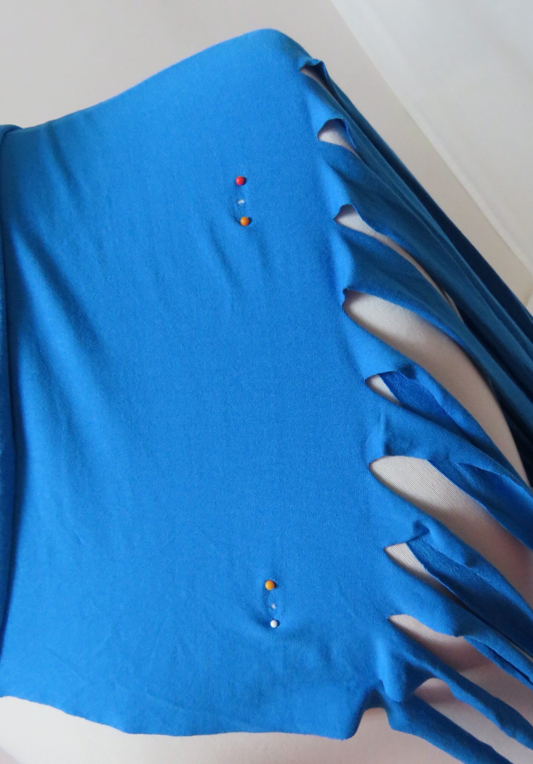 - Fold it in half horizontally and put it over your head, like a tabard, so you have horizontal slits in the centre. You can either wear it with the same length back and front or make it shorter at the front and long at the back. It also looks great belted like this
