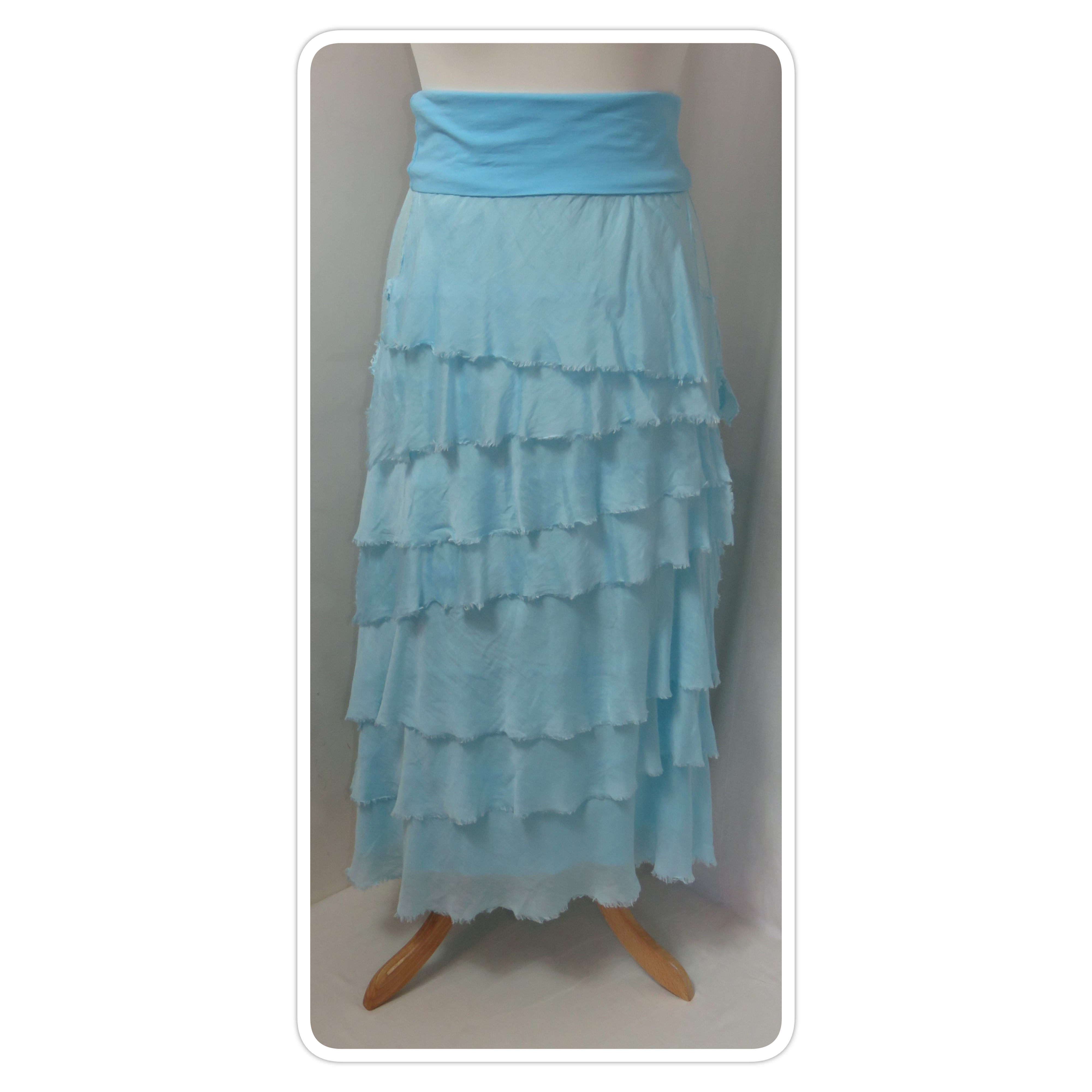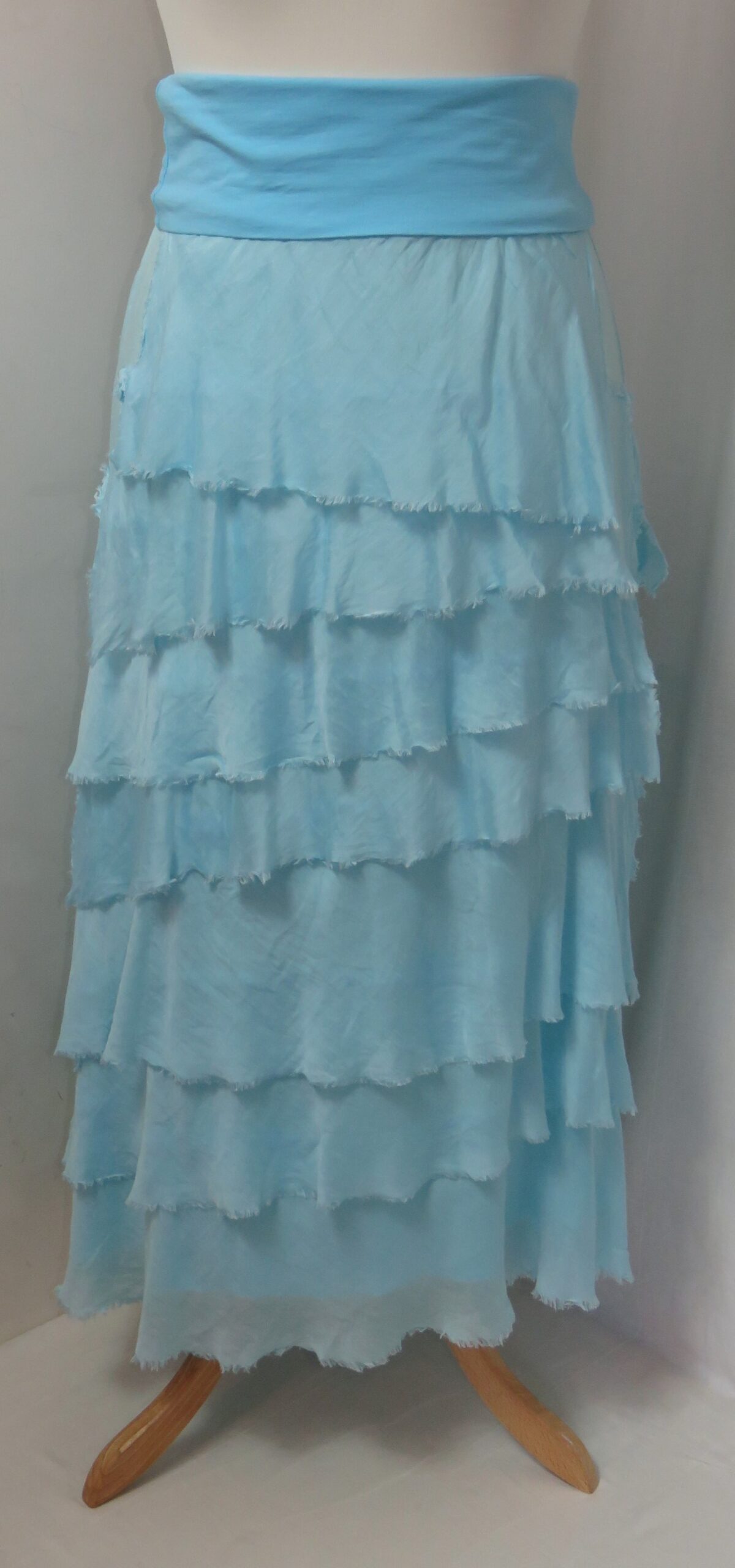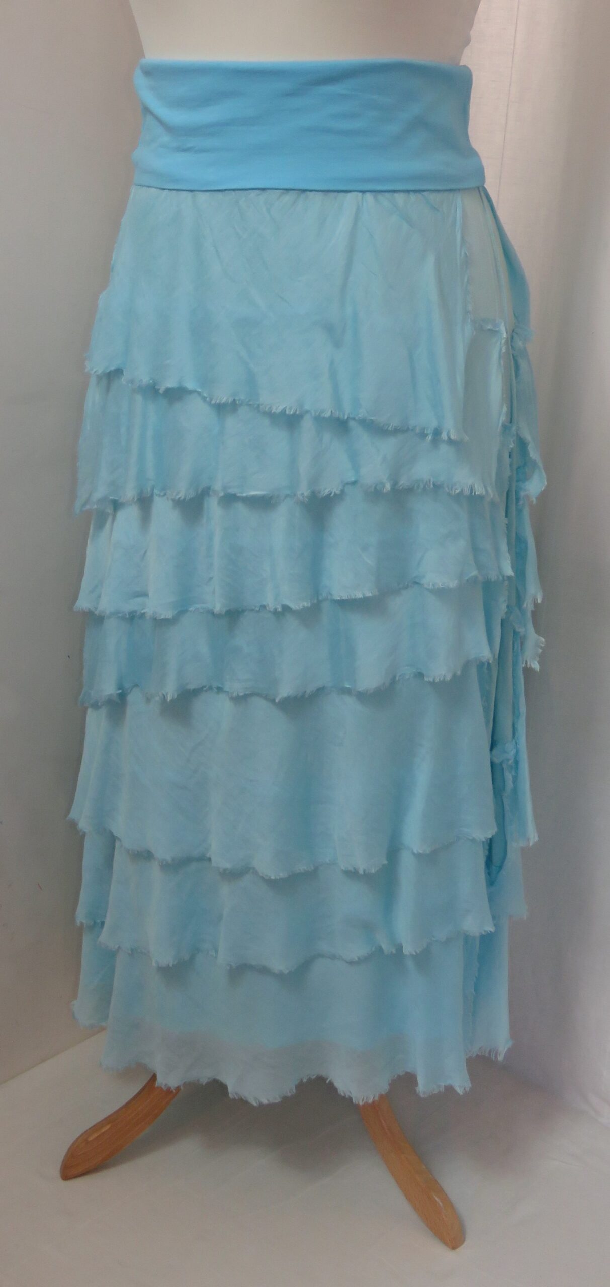 - Fine viscose jersey (95% viscose/5% elastane) with tiers of a silk-blend fabric sewn on asymmetrically back and front (40% cotton/30% viscose/30% silk) – these have a raw/frayed edge