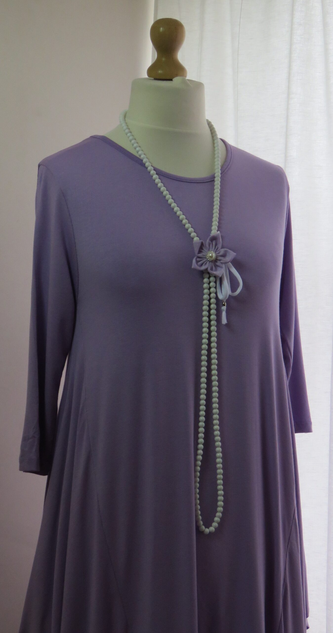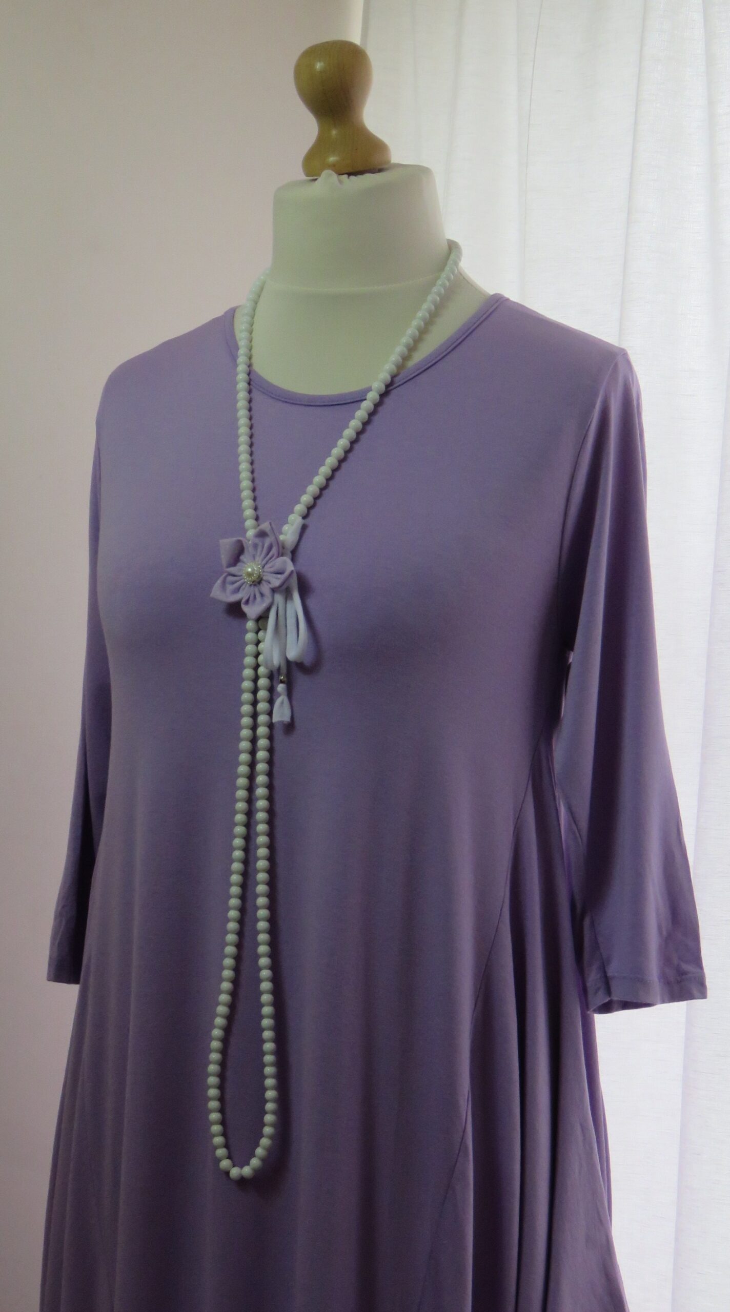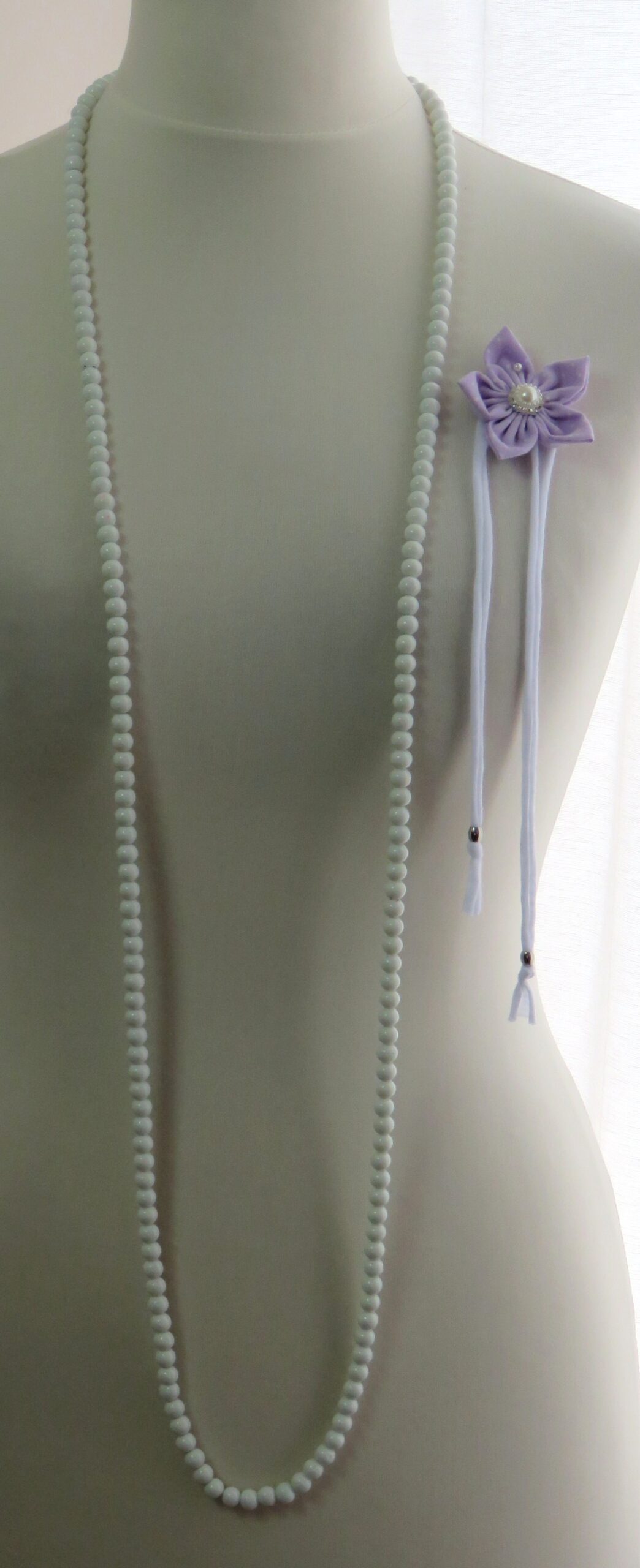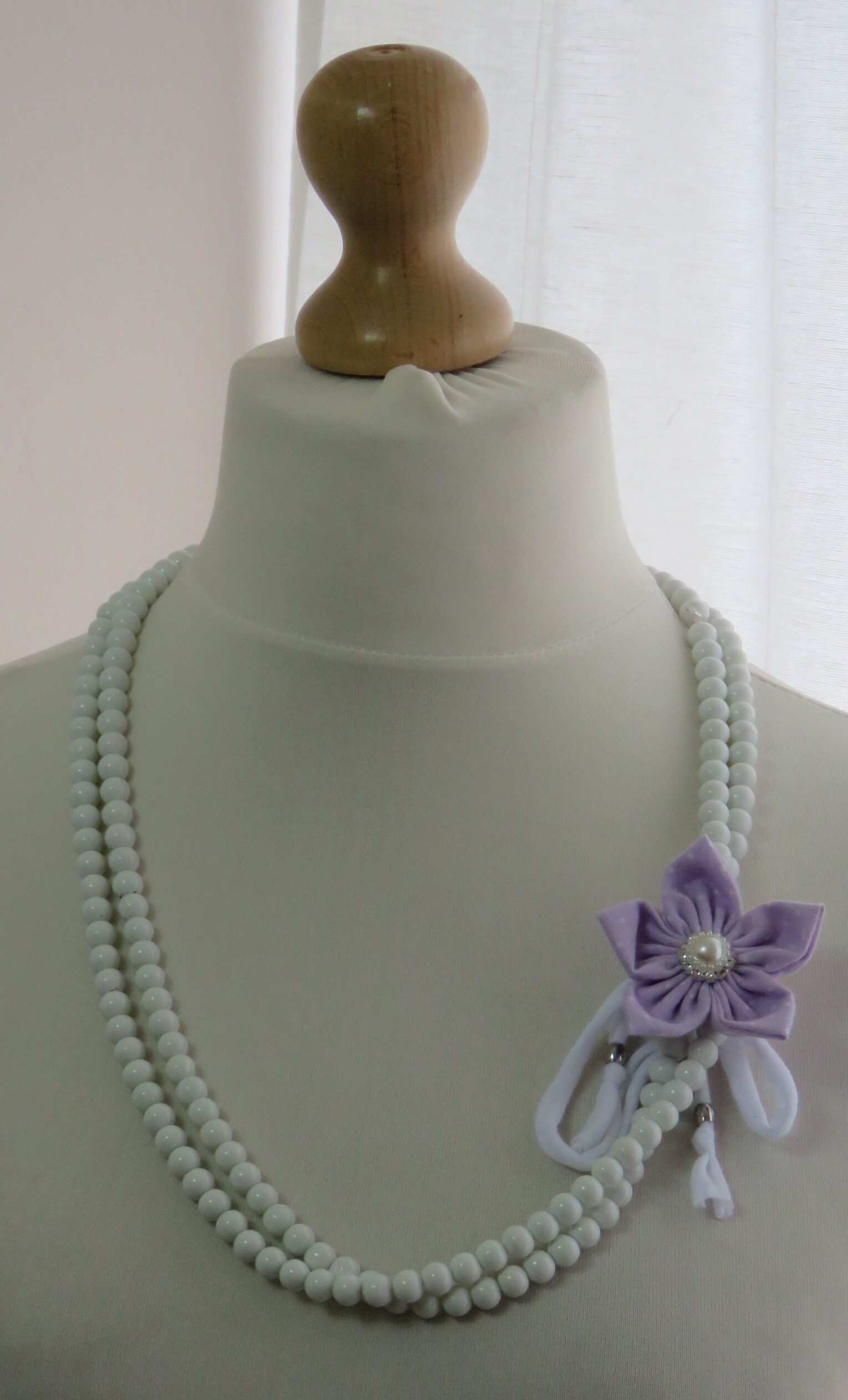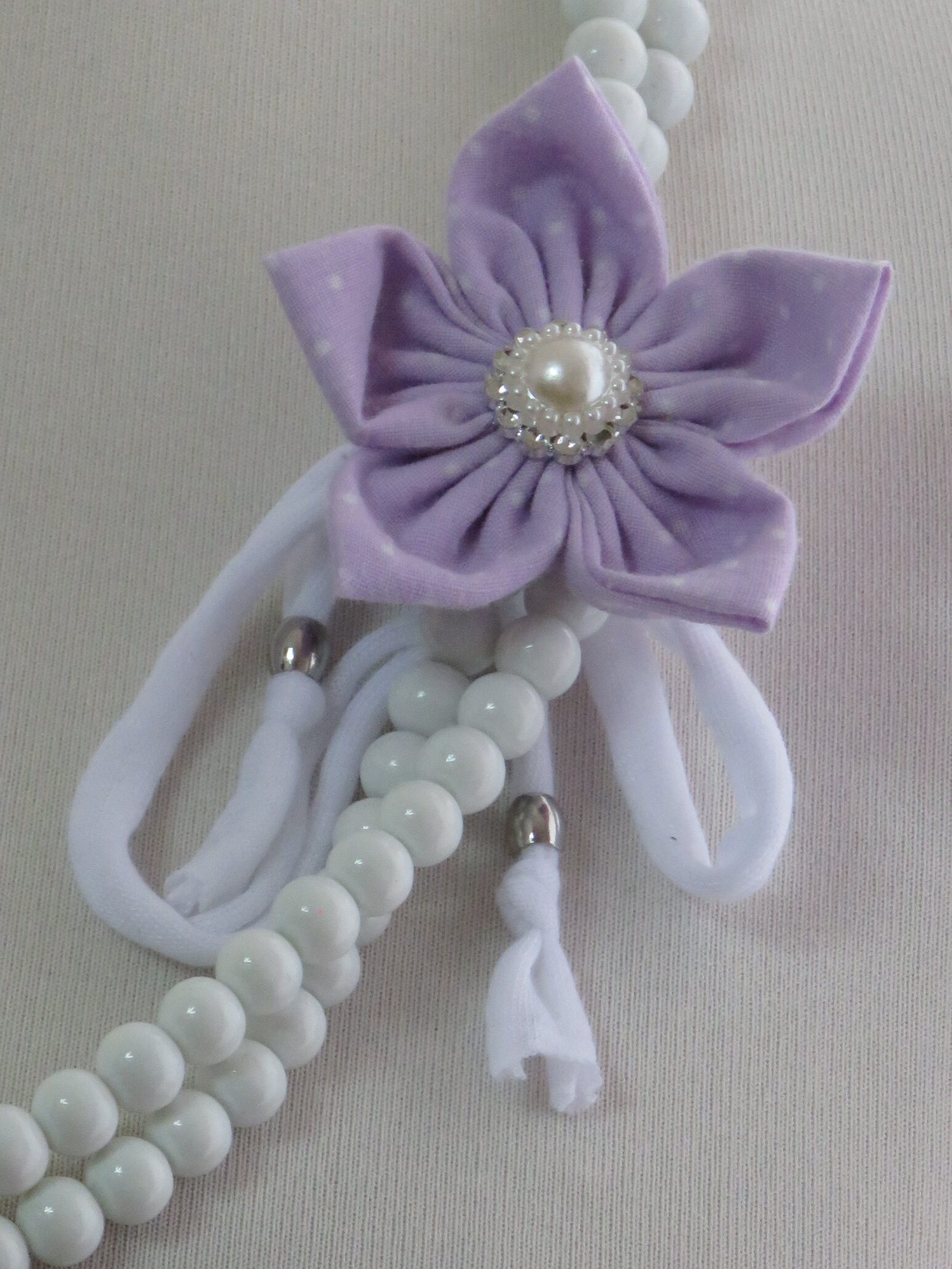 • The flower is made from a lilac fabric, with a white spot, and has a faux-pearl centre.  It’s attached to a strand of white, t-shirt yarn, with silver-coloured, metal beads on the ends